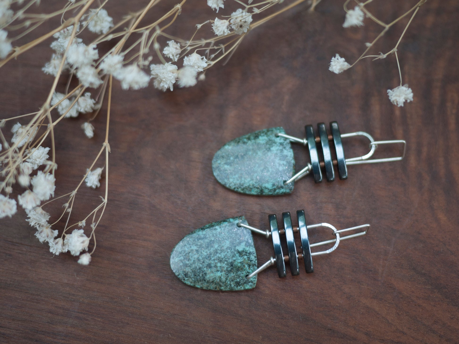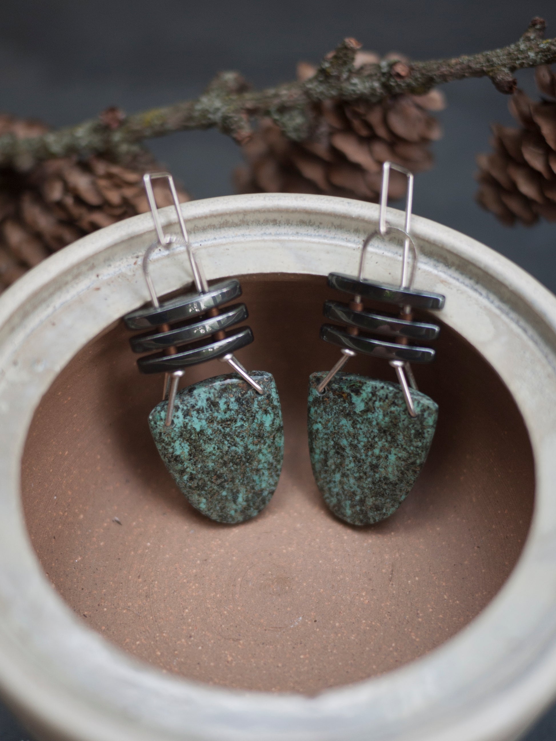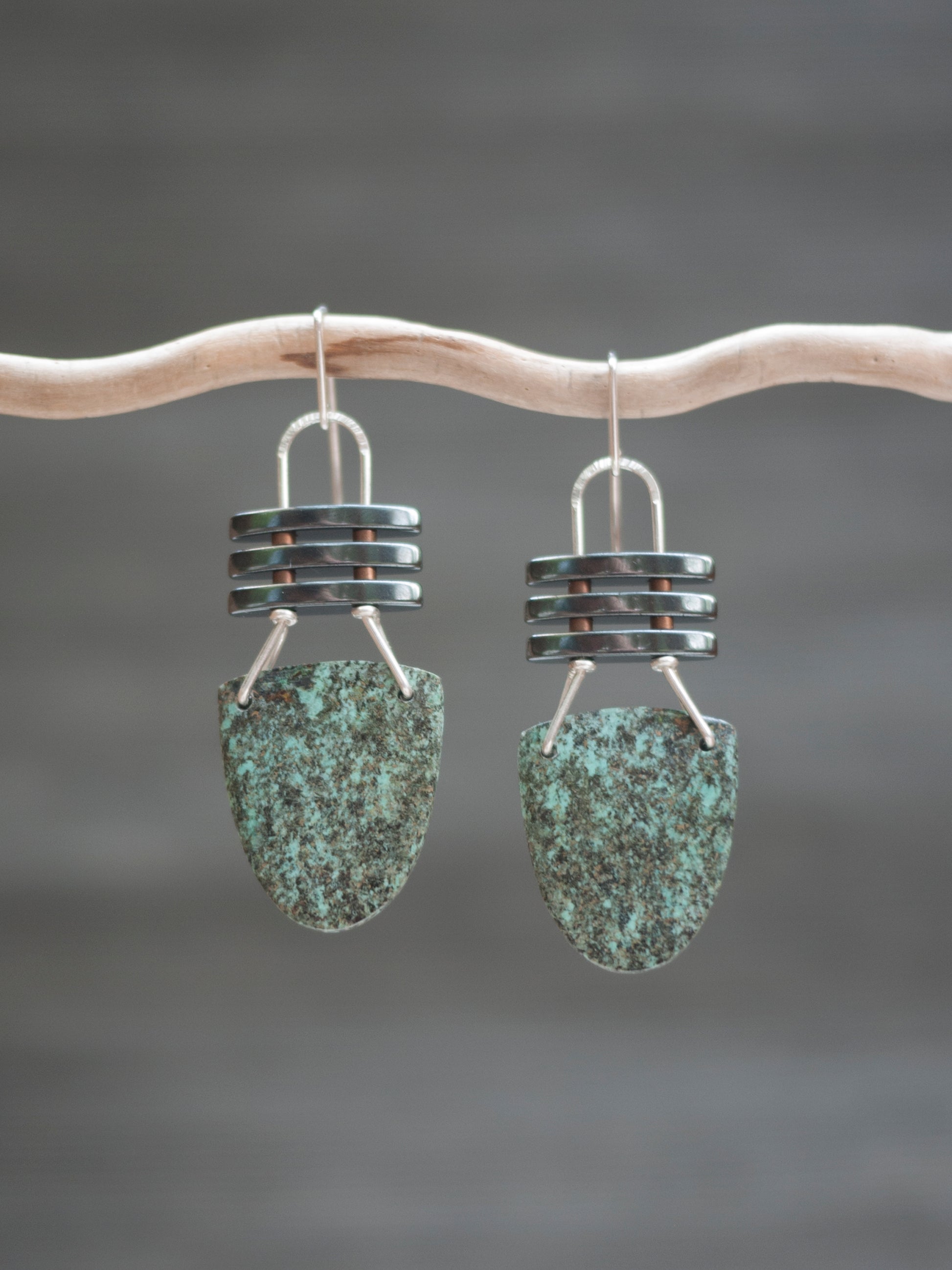 These beautiful specimens are rich in color. Accented with a triad of hematite line beads and dangle from solid sterling silver wire. The wire has portions that are hammered giving them sparkle.
