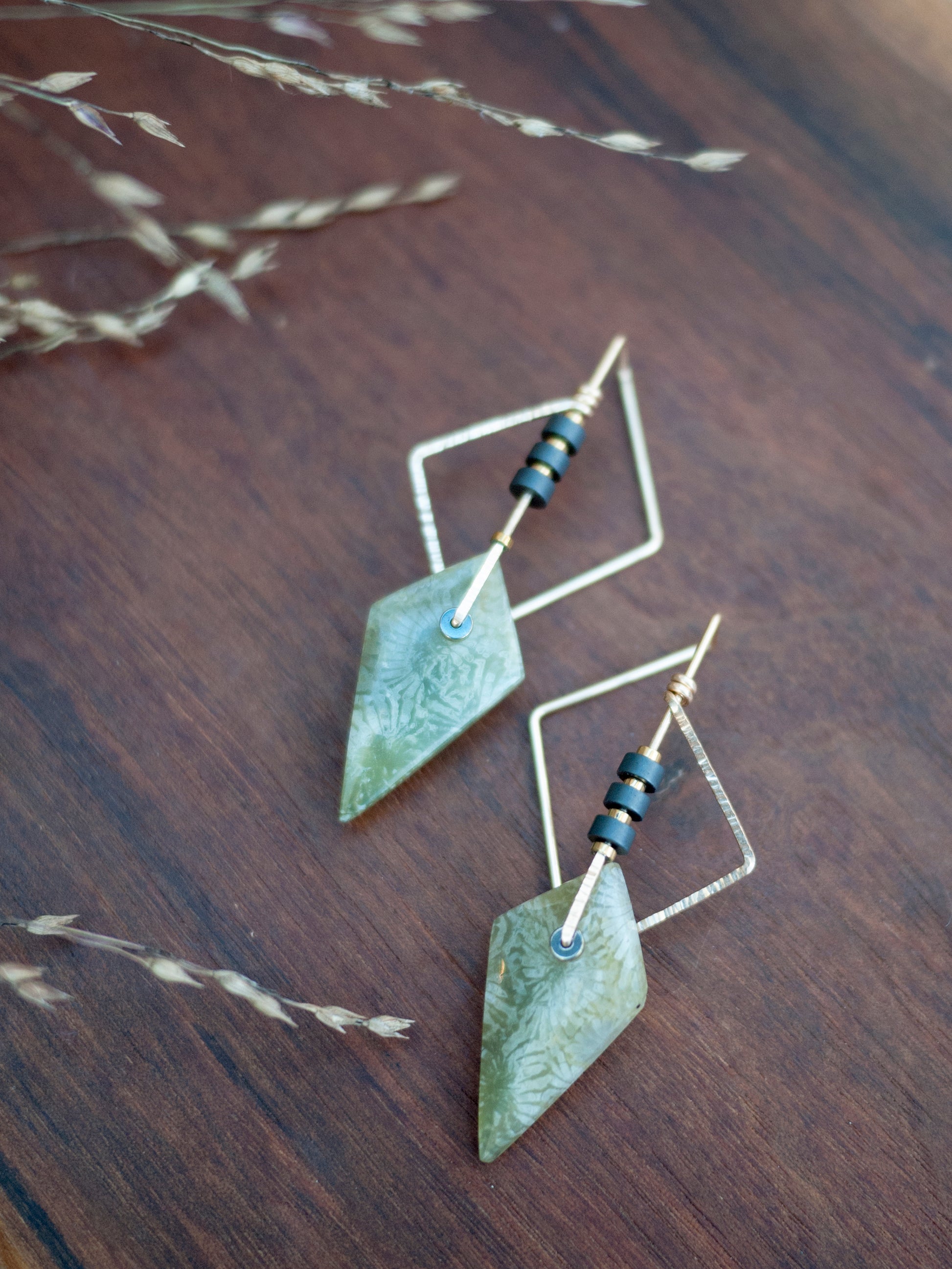 Diamond shaped green fossil coral stones are framed in hand formed gold fill wire. The wire is hammered for texture and sparkle, and a pattern of gold and grey hematite beads accent the wire. Earring come with rubber backings