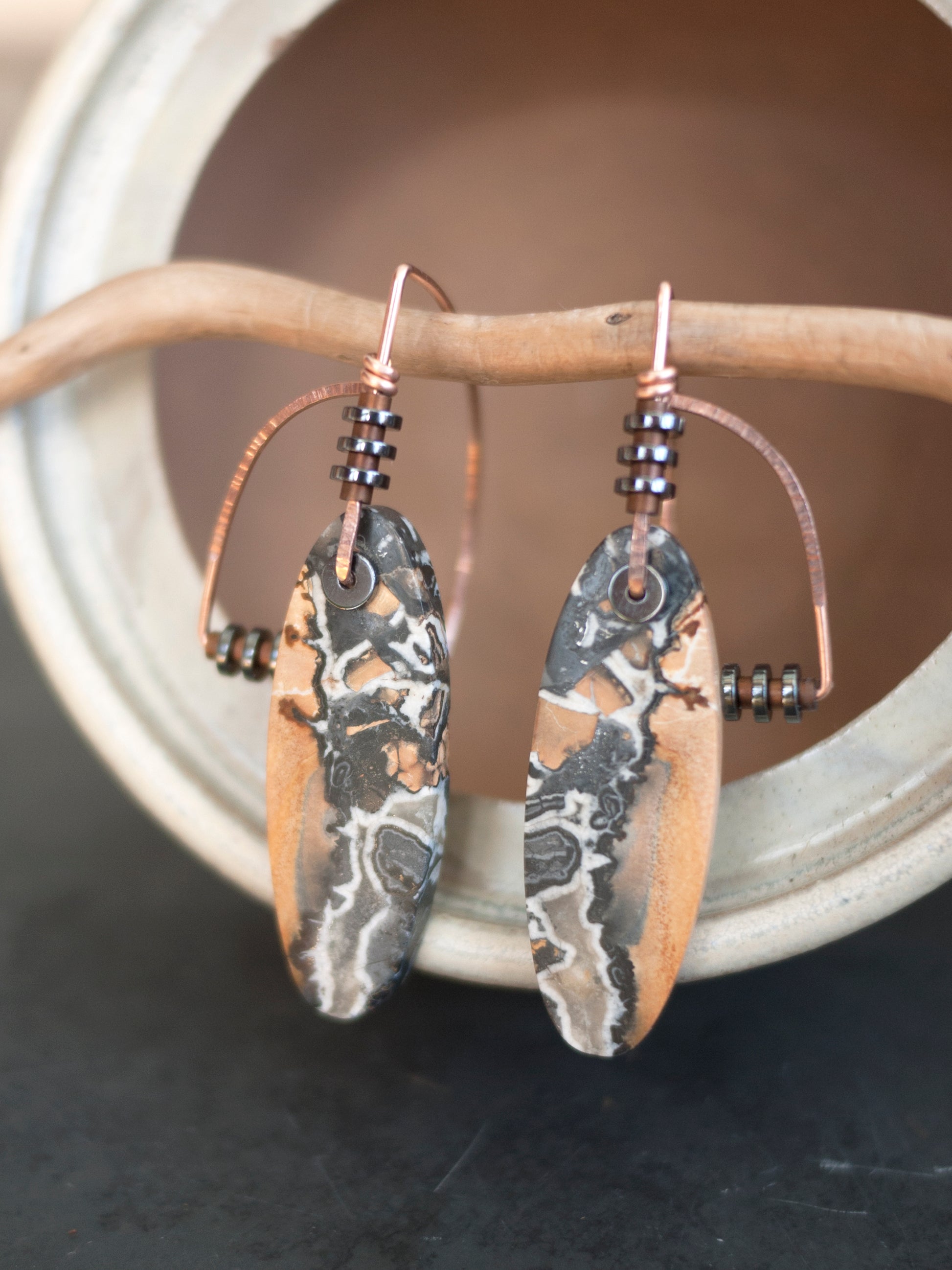 These striking maligano jasper stones have an abstract pattern in orange, white, black, and grey. Framed with a rose gold fill wire arch and adorned with hematite beads. The ear wires have a sculptural curve to add interest and form to the overall earrings. Earrings come with rubber backing