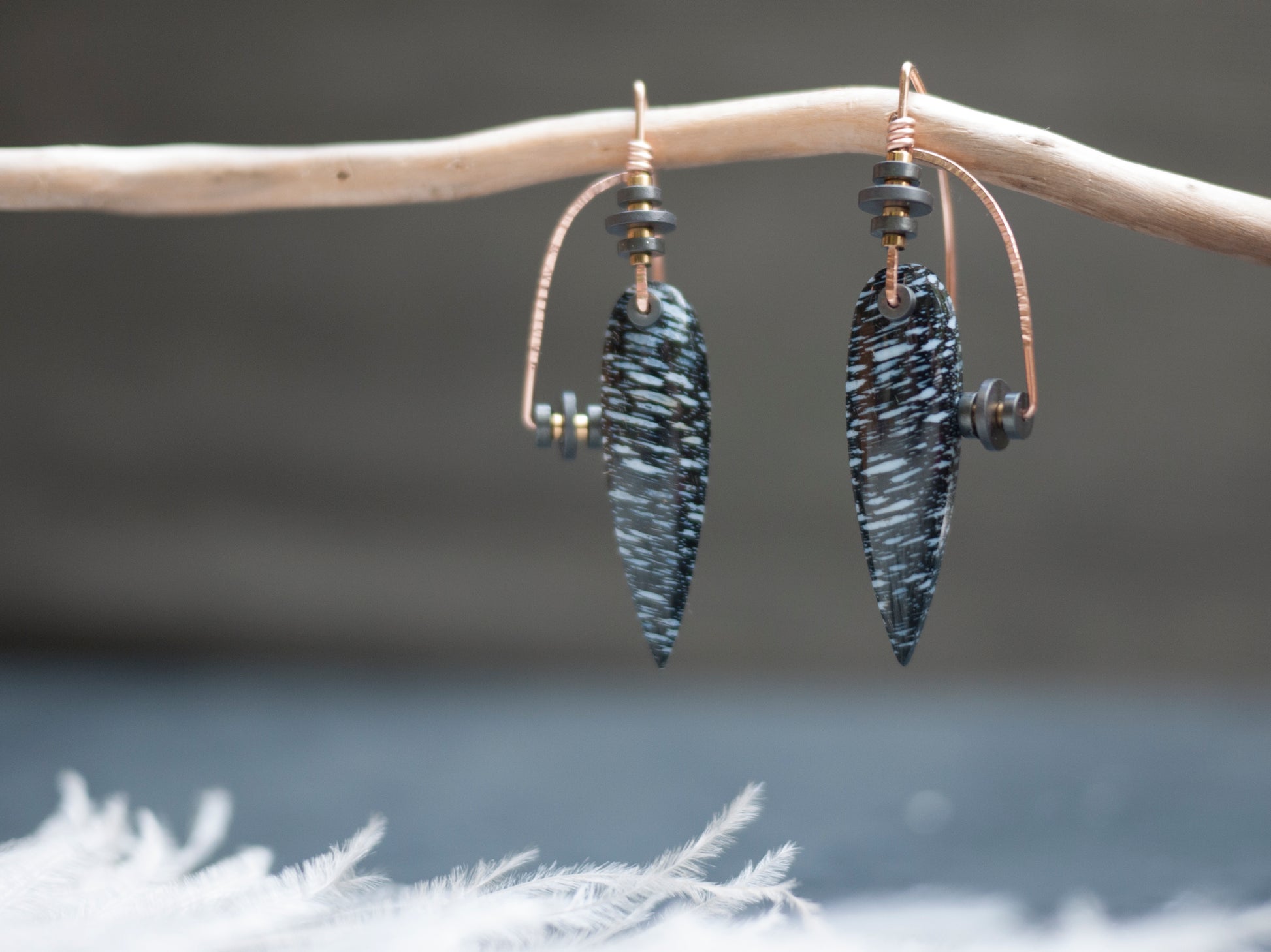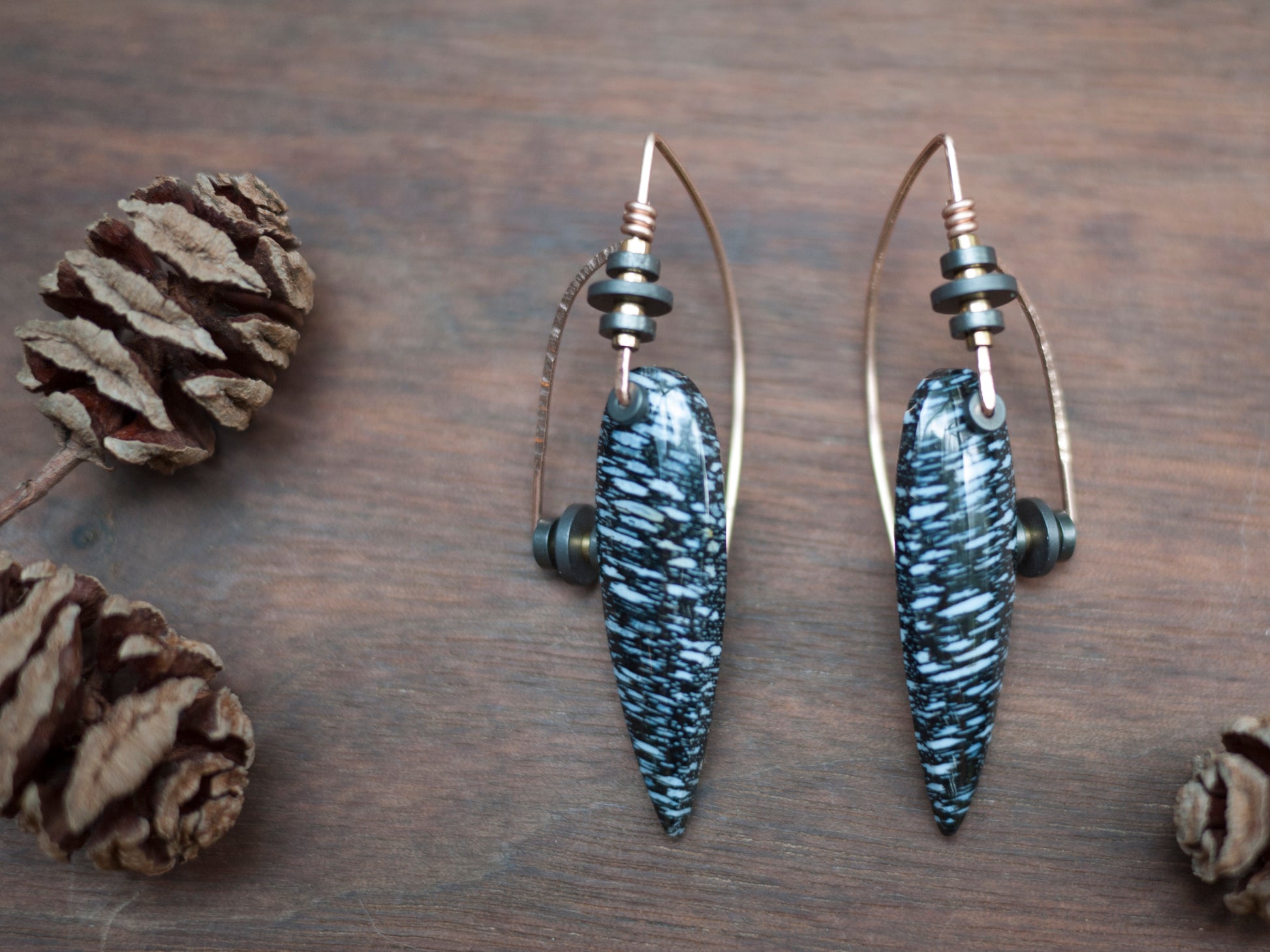These striking petrified palm wood stones are classic black and white and would make the perfect accessory for any evening wear. Framed with a gold fill wire arch and adorned with hematite beads. The ear wires have a sculptural curve to add interest and form to the overall earrings