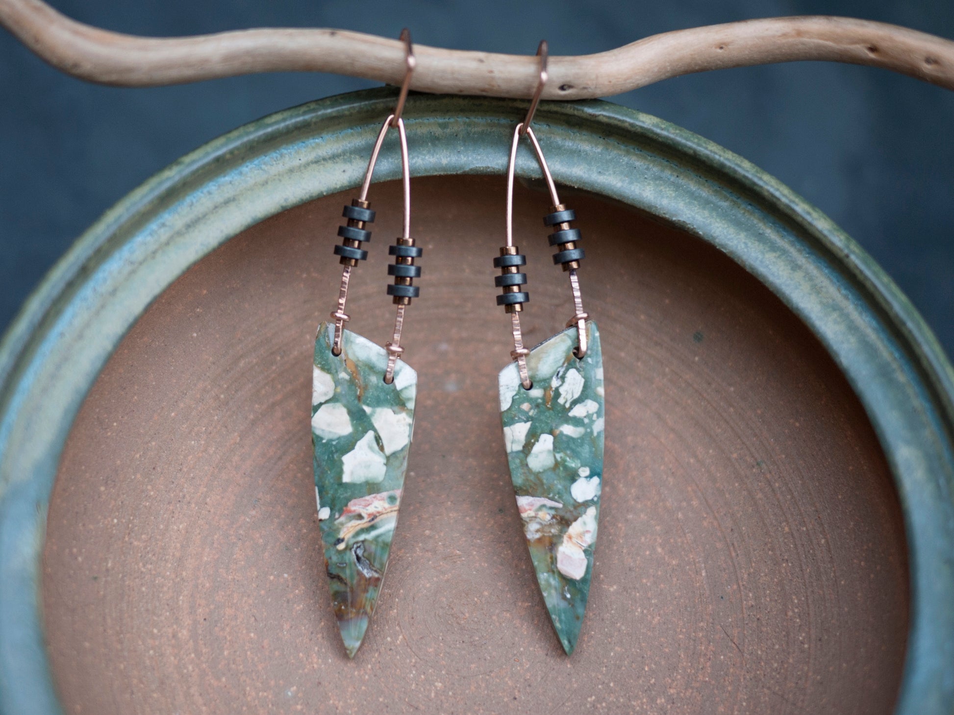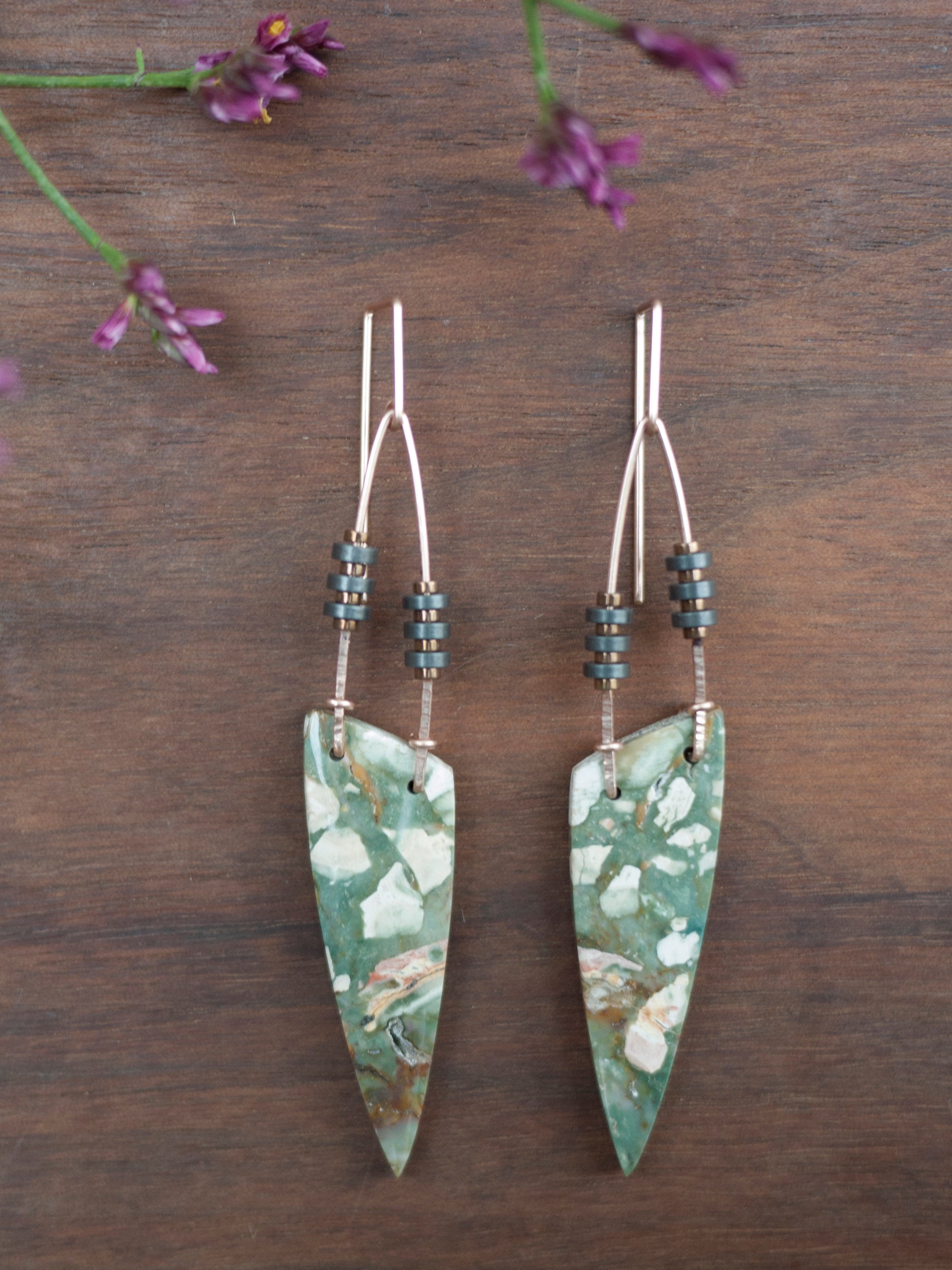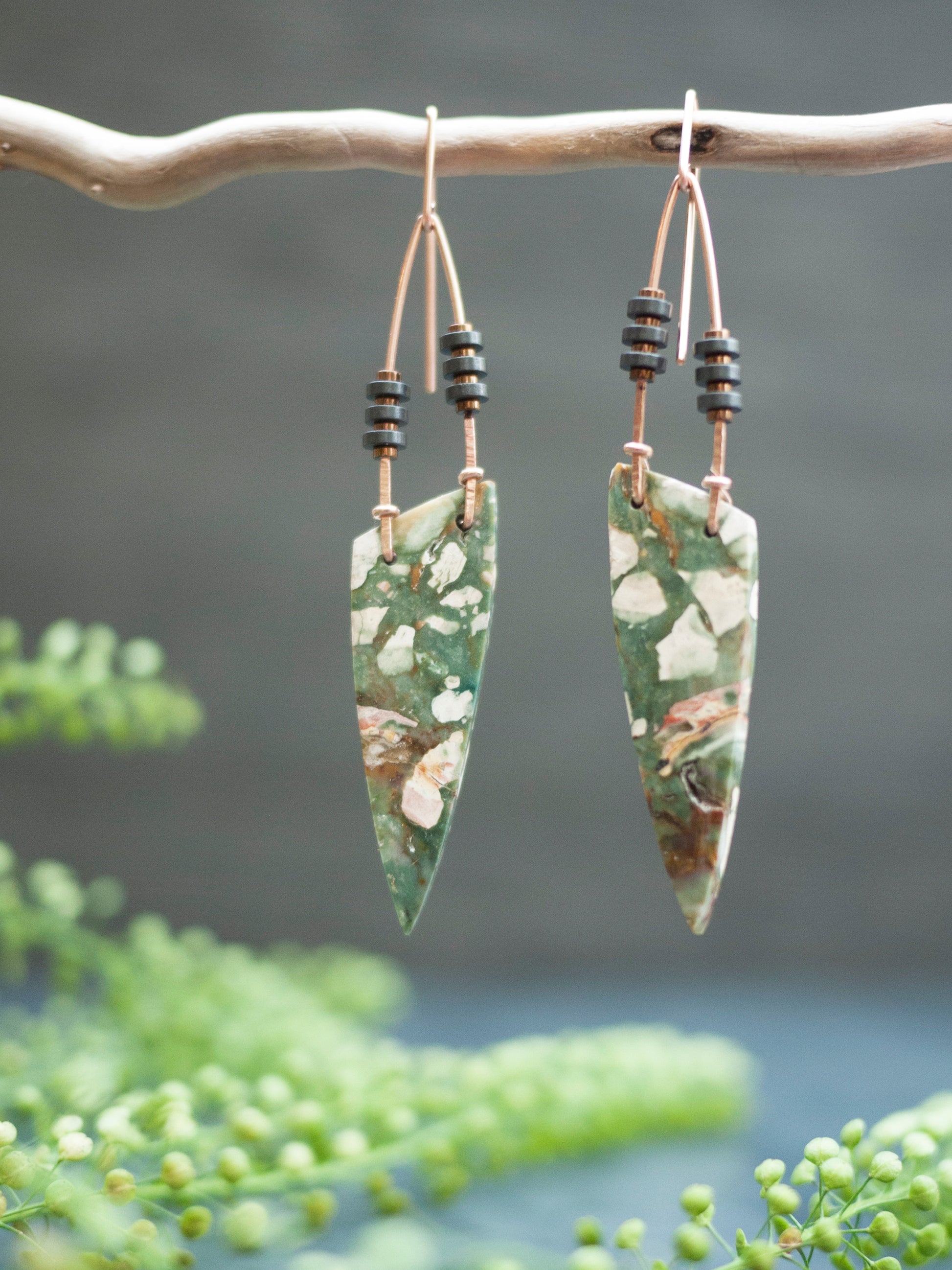 These beautiful brecciated jasper stones were hand cut for my designs in a collaboration with a lapidary artist from Indonesia. Rose gold fill wire creates a geometric arch adorned with copper and grey colored hematite beads. These earrings have motion and swing from hand made french hooks made from the same gold fill wire.