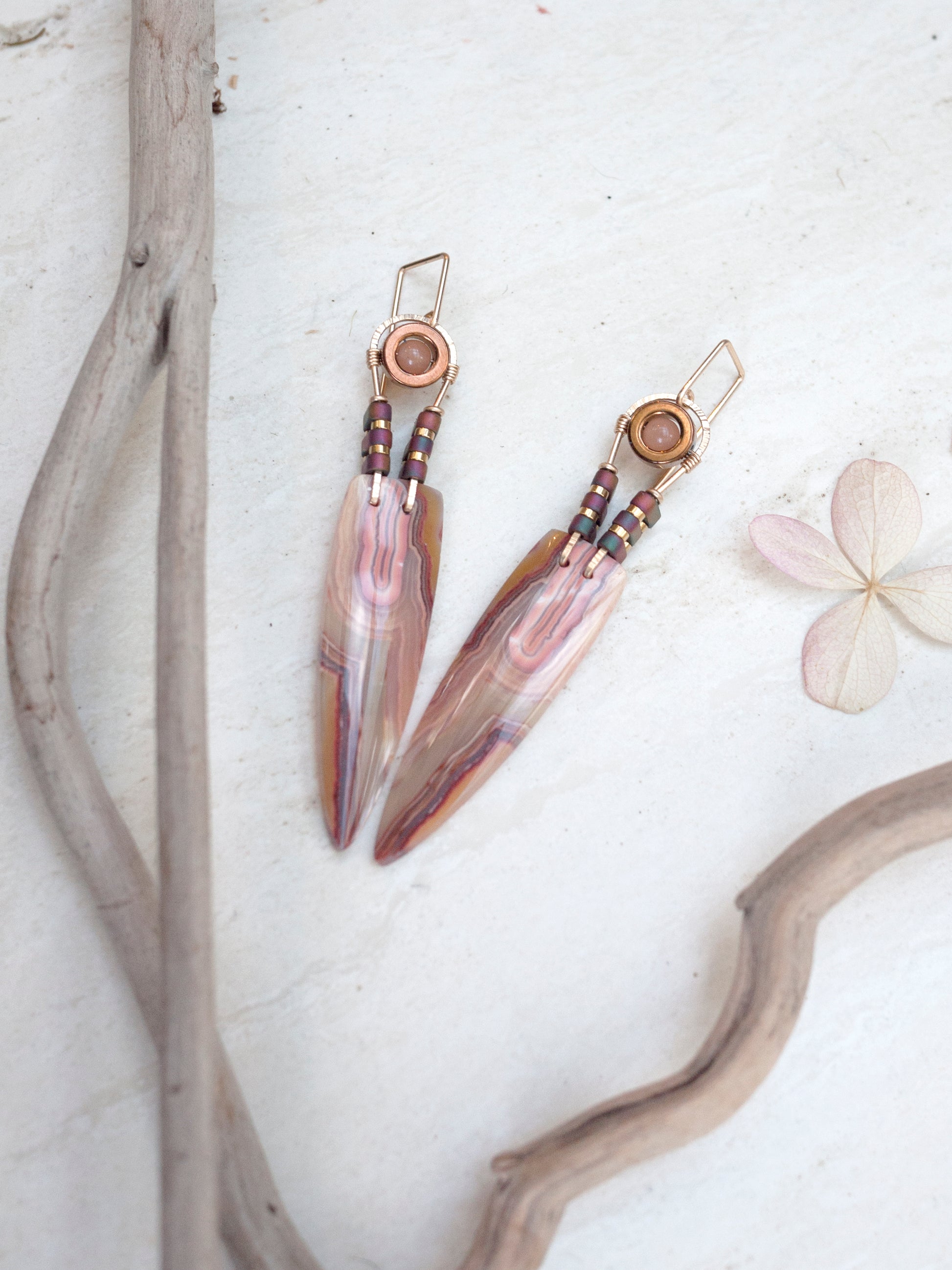 These beautiful lace stones have a beautiful swirl pattern of pinks and cream. Yellow gold fill wire creates a geometric arch adorned with gold and purple/pink iridescent hematite beads. Embraced by the gold arch, a copper colored circle bead holds a sunstone. These earrings have motion and swing from hand made french hooks made from the same gold fill wire. Come with rubber backings