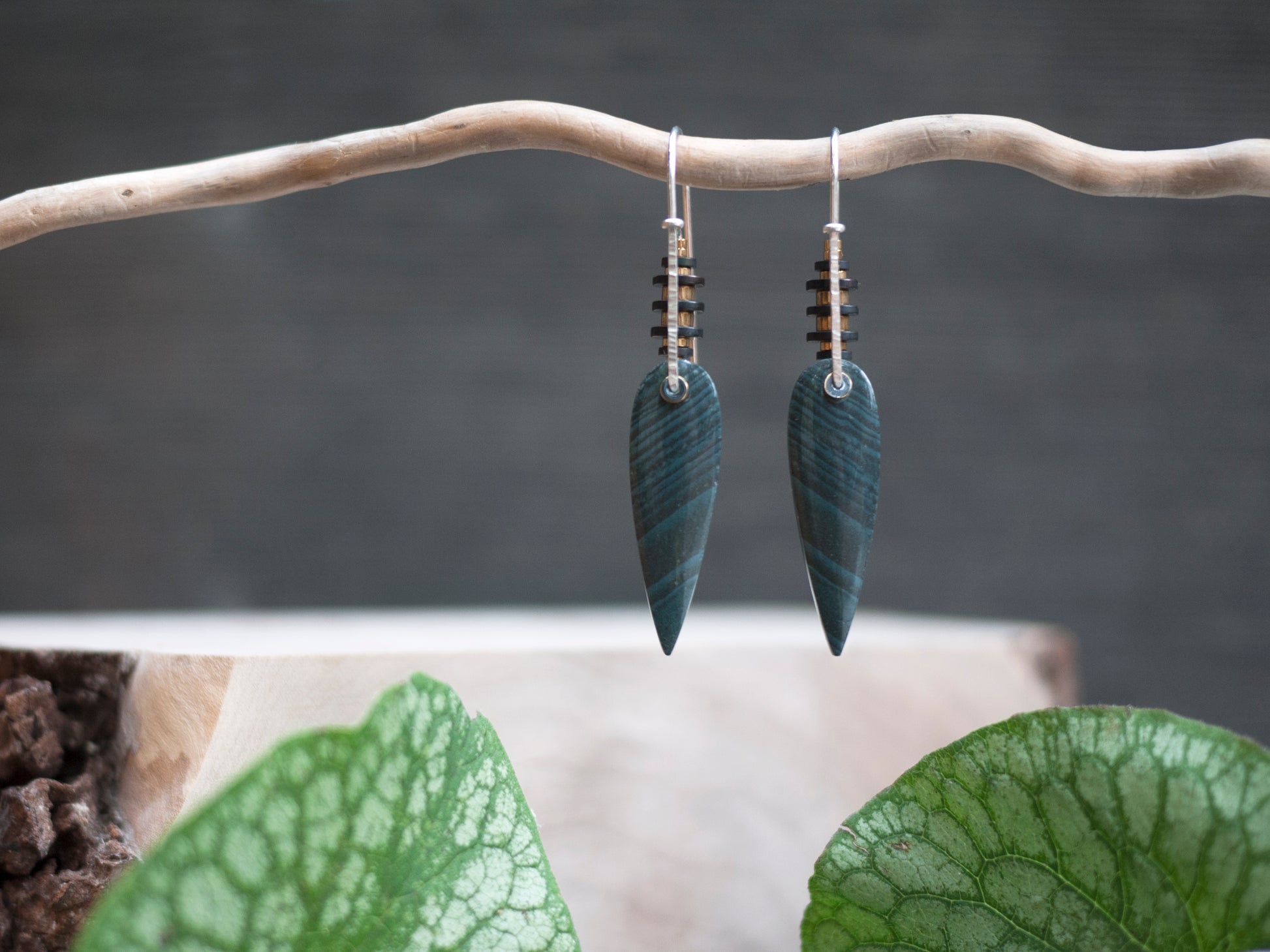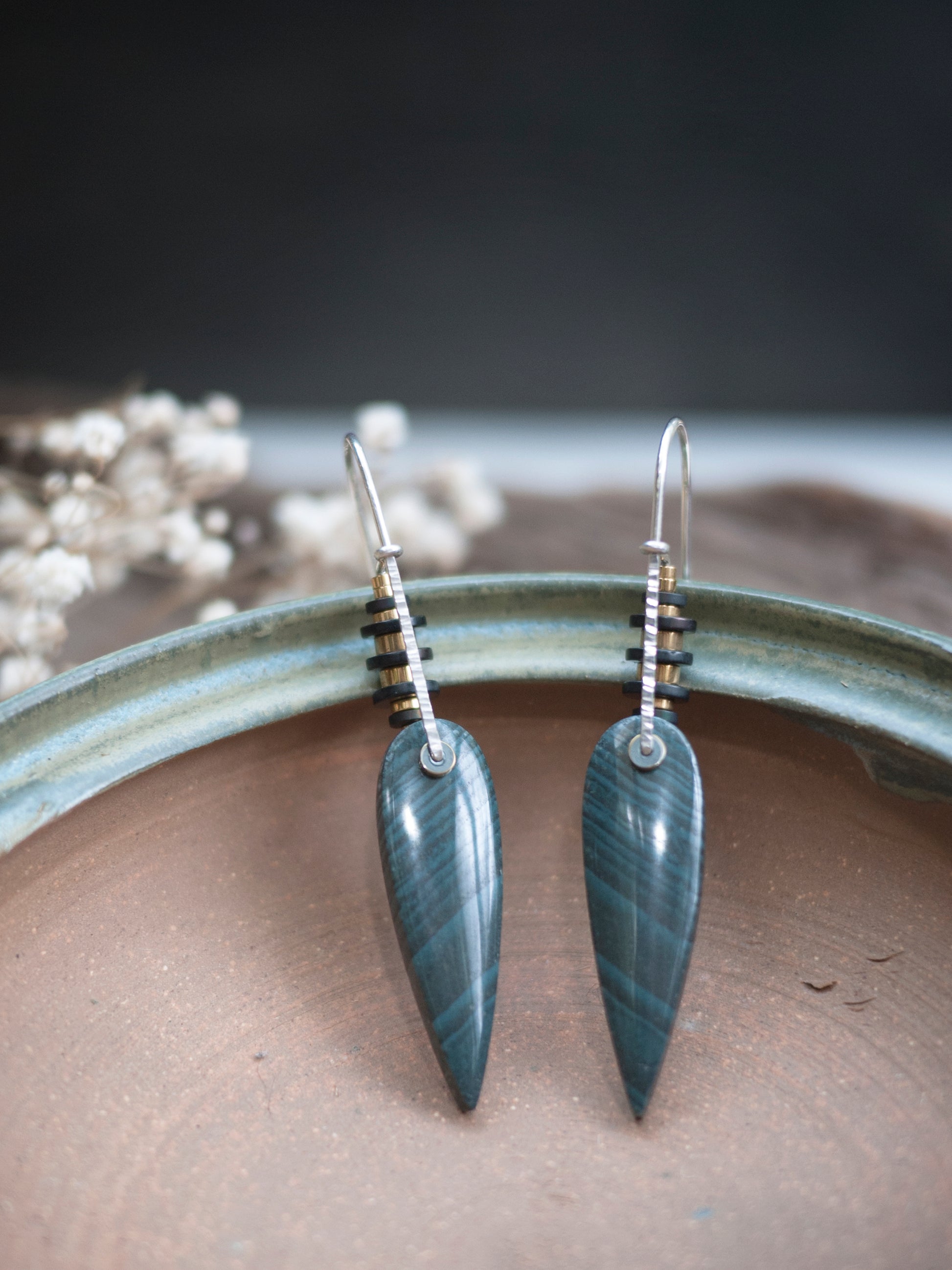 These beautiful blue polychrome jasper stones are accented with a gold and grey hematite beads and sterling silver wire. The wire has portions that are hammered giving them sparkle. The earring wires have a sculptural curve to them. Earrings come with rubber backings.