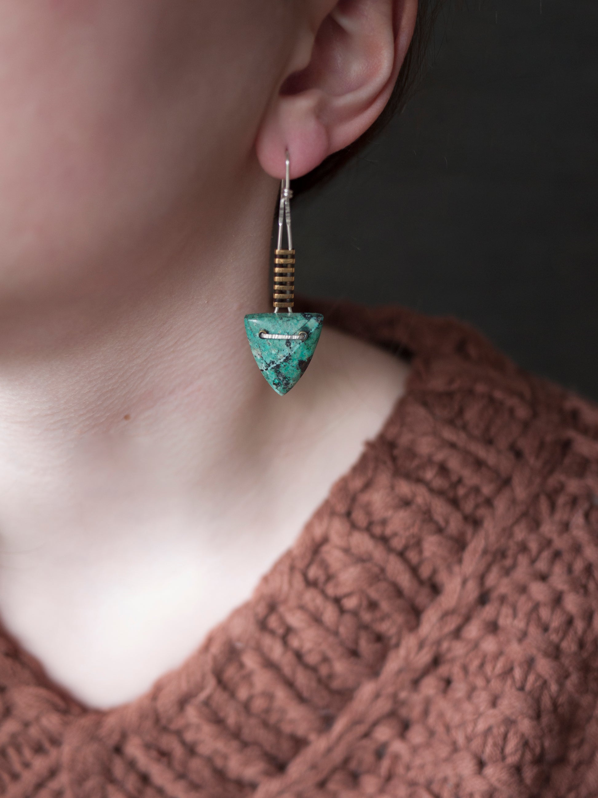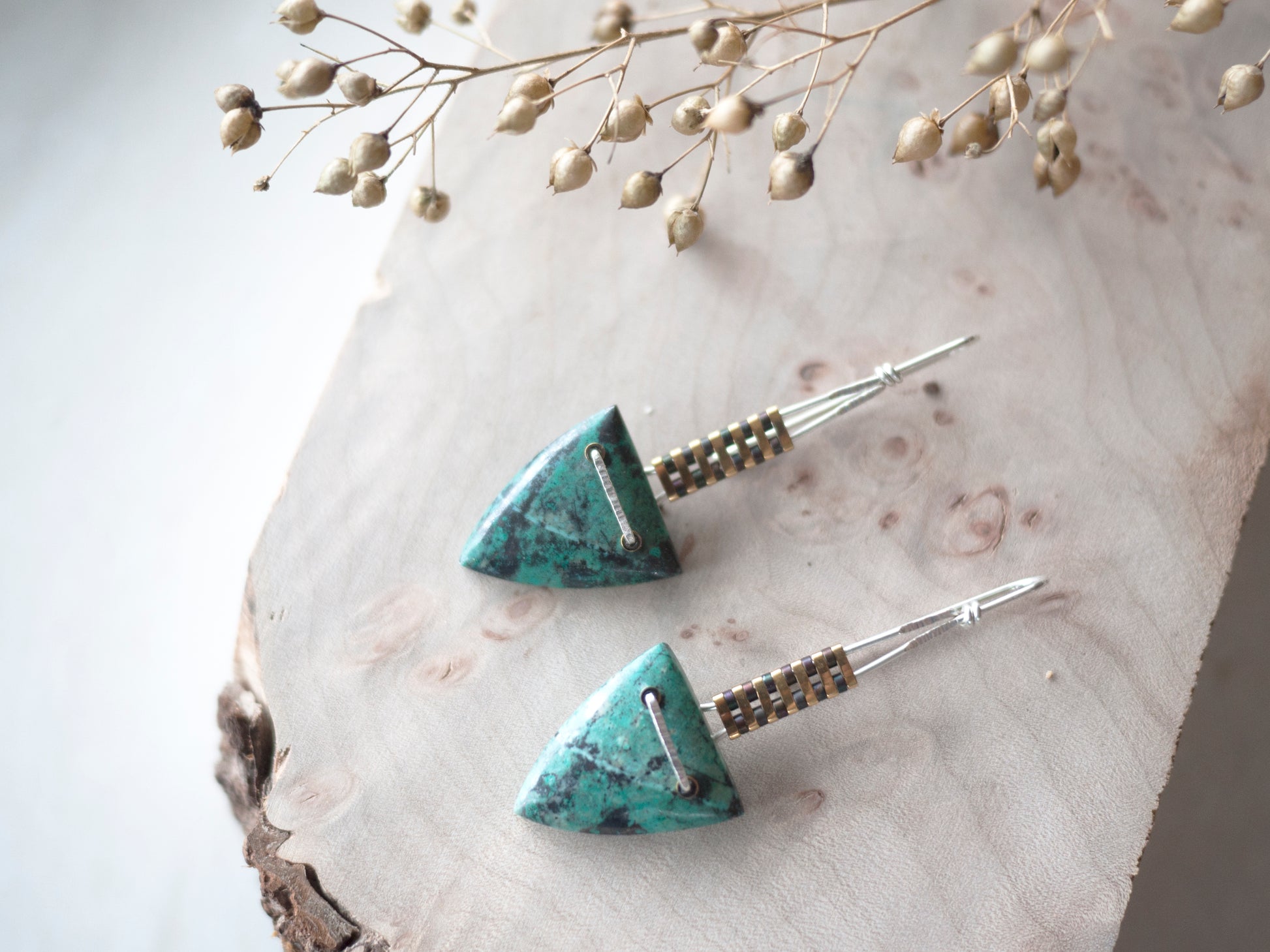 These beautiful specimens of chrysocolla are rich in color. Chrysocolla gets it vibrant blues from copper but is a mixture of stone including malachite, turquoise and azurite. The earrings are accented with a line of copper colored hematite beads on sterling silver wire. The wire has portions that are hammered giving them sparkle.