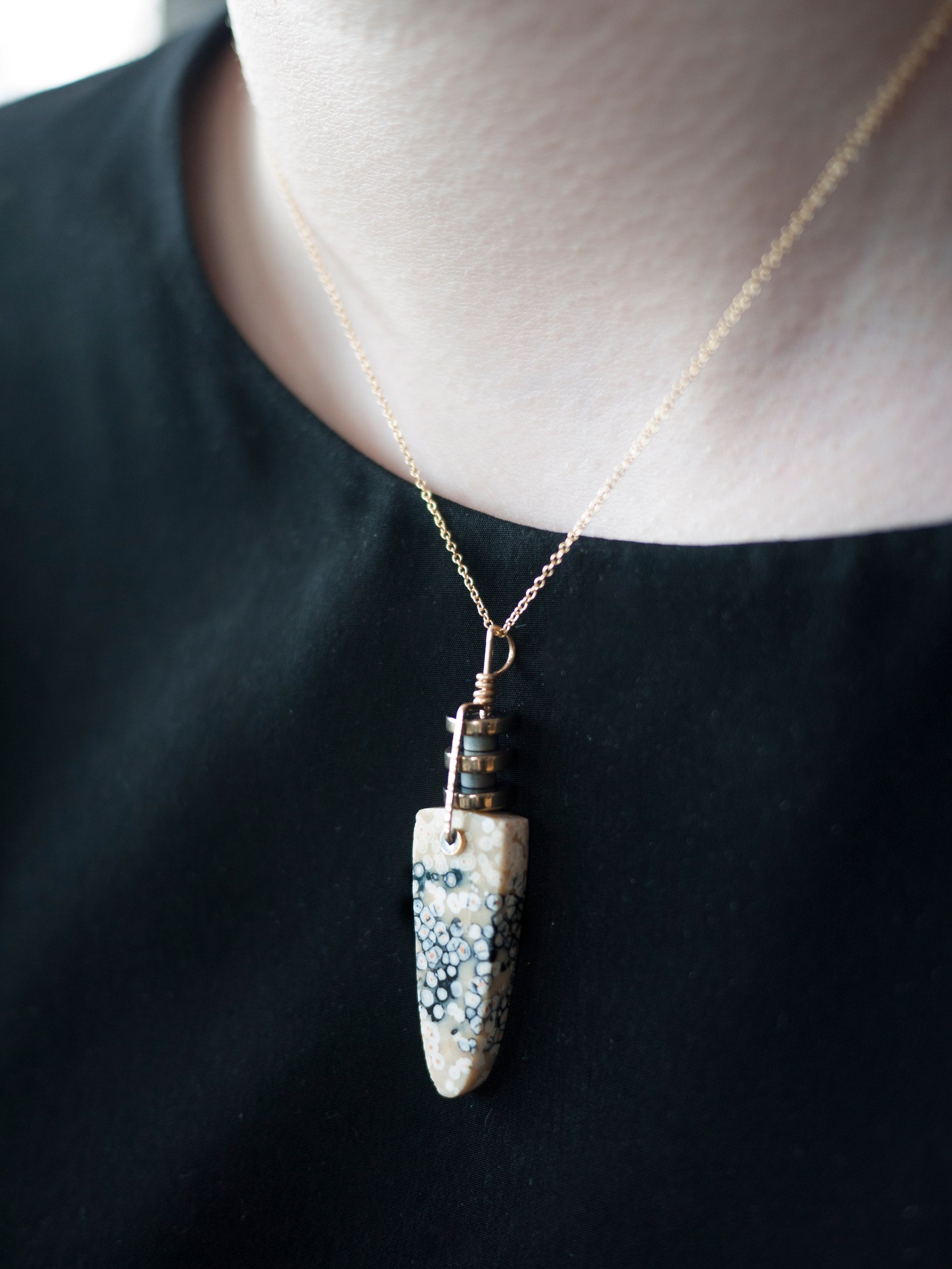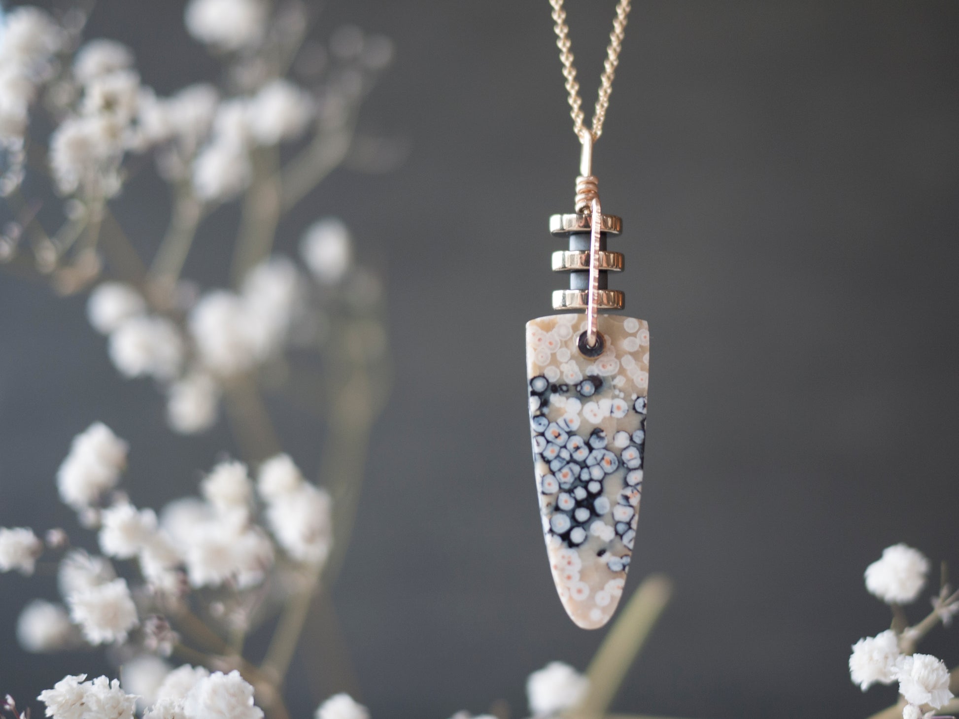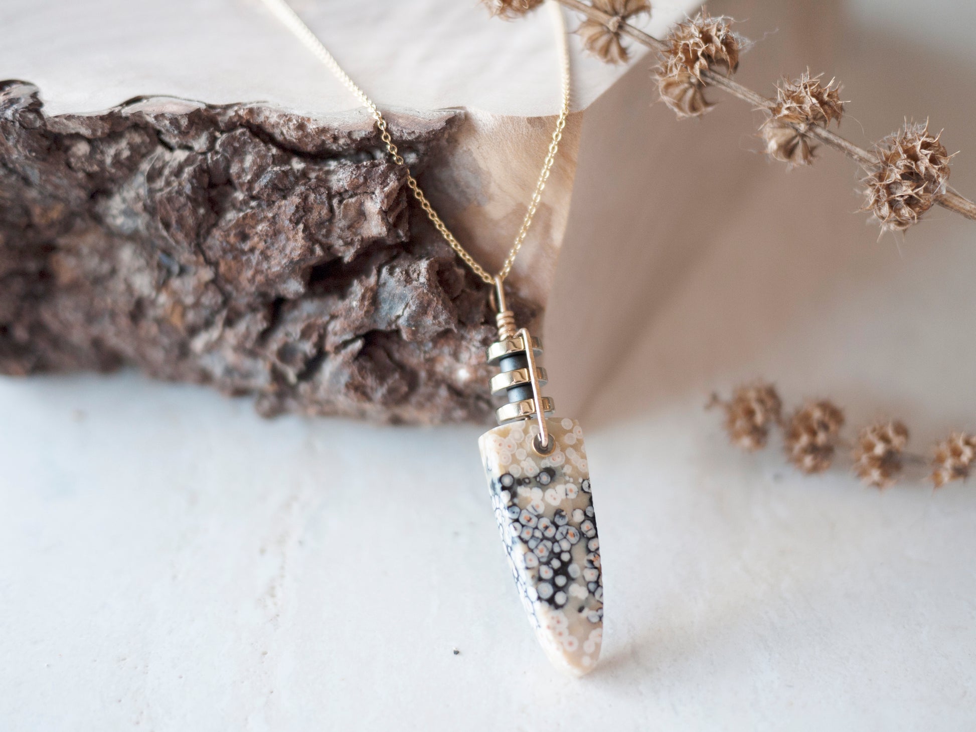 Made from yellow gold filled wire and hematite beads. A beautiful speckled hand cut ocean jasper bead hangs from hand formed wire. The wire has portions that are hammered to give the pendant a unique combo of textured and smooth. The wire is adorned with different hematite beads for this unusual look.