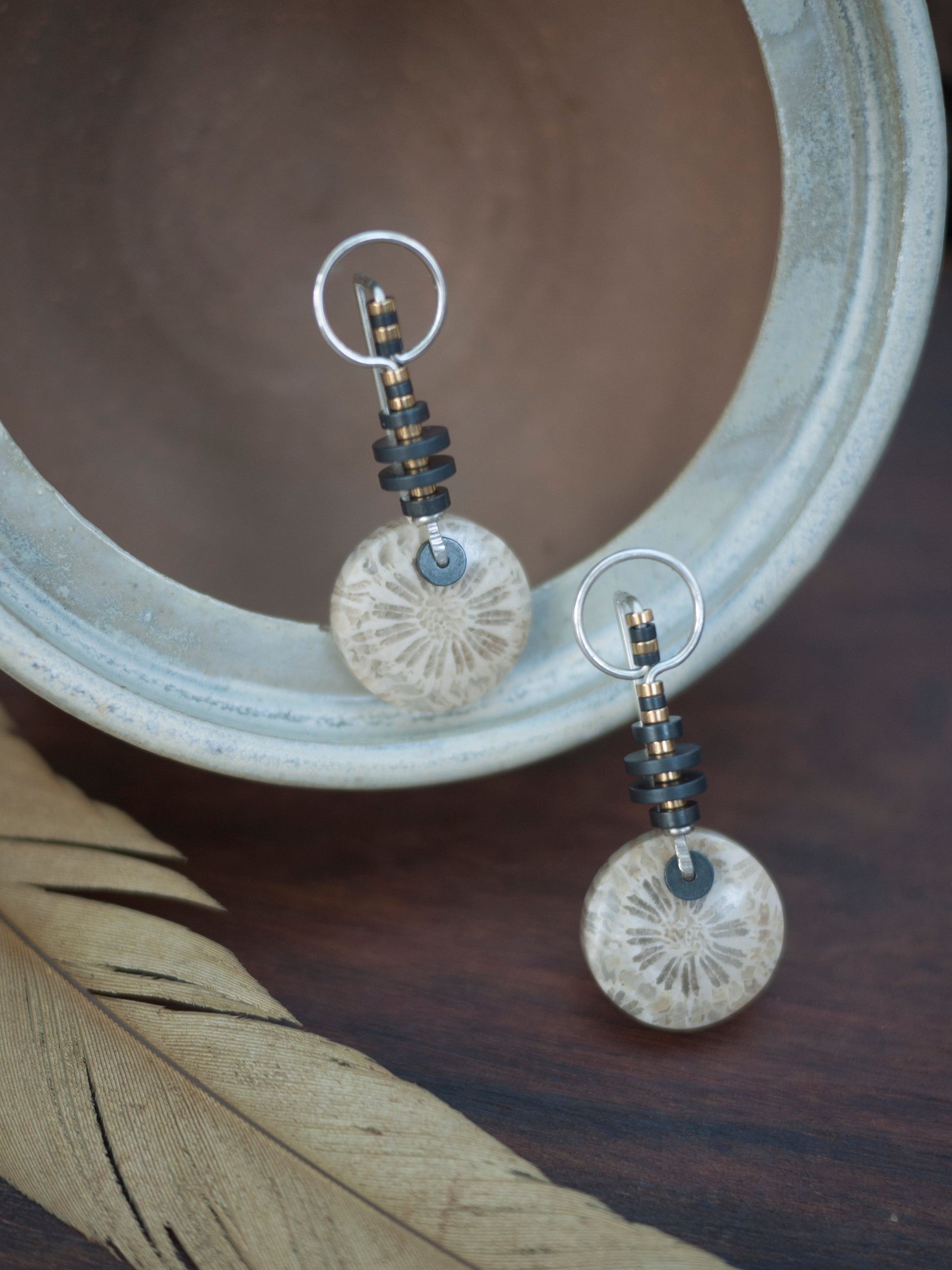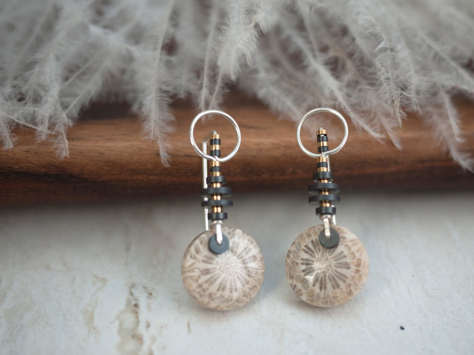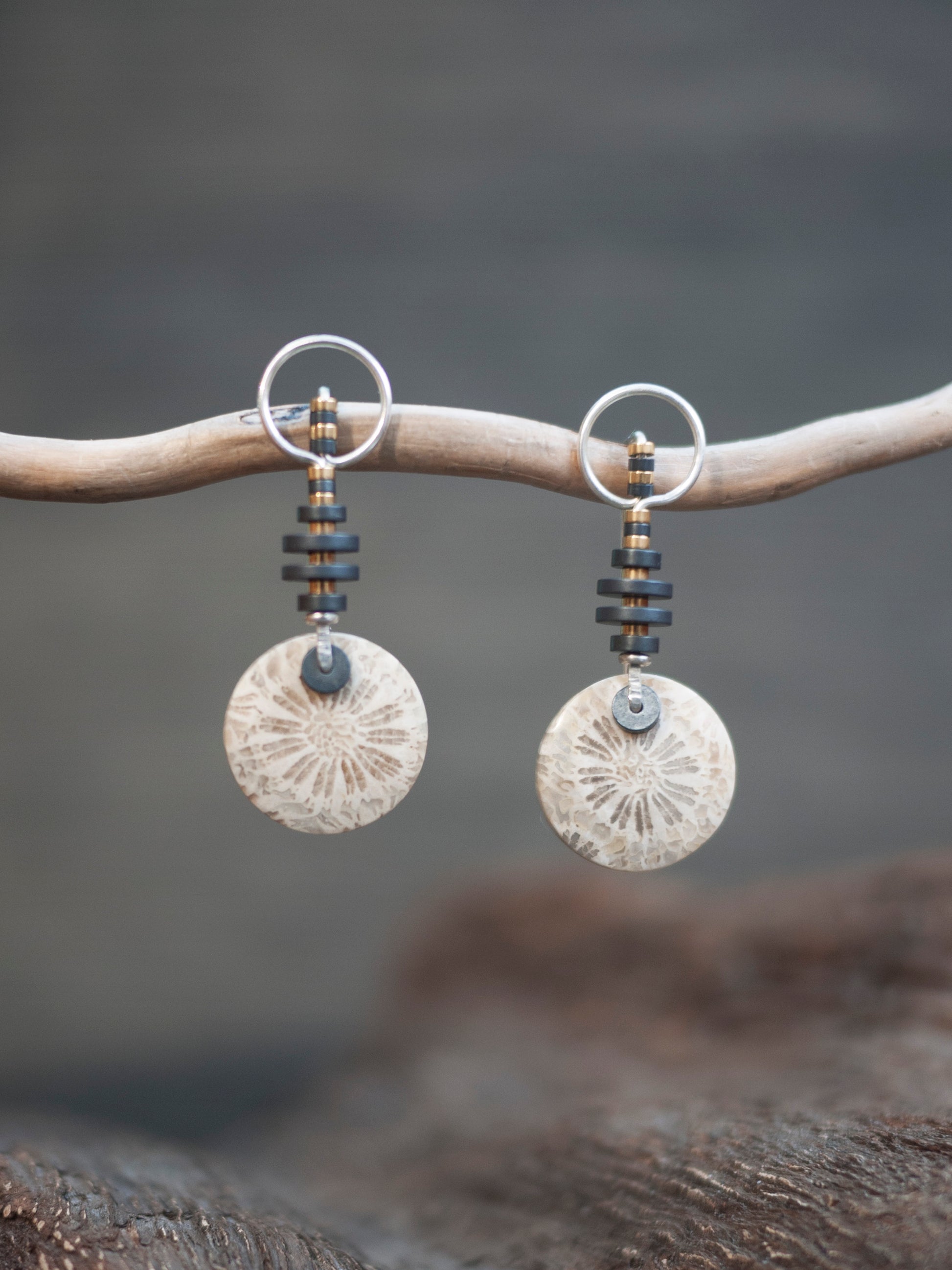 The subtle snowflake pattern on these fossilized coral beads gives them a sophisticated look. The sterling silver wire is adorned with a pattern of gold and dark gray hematite beads.