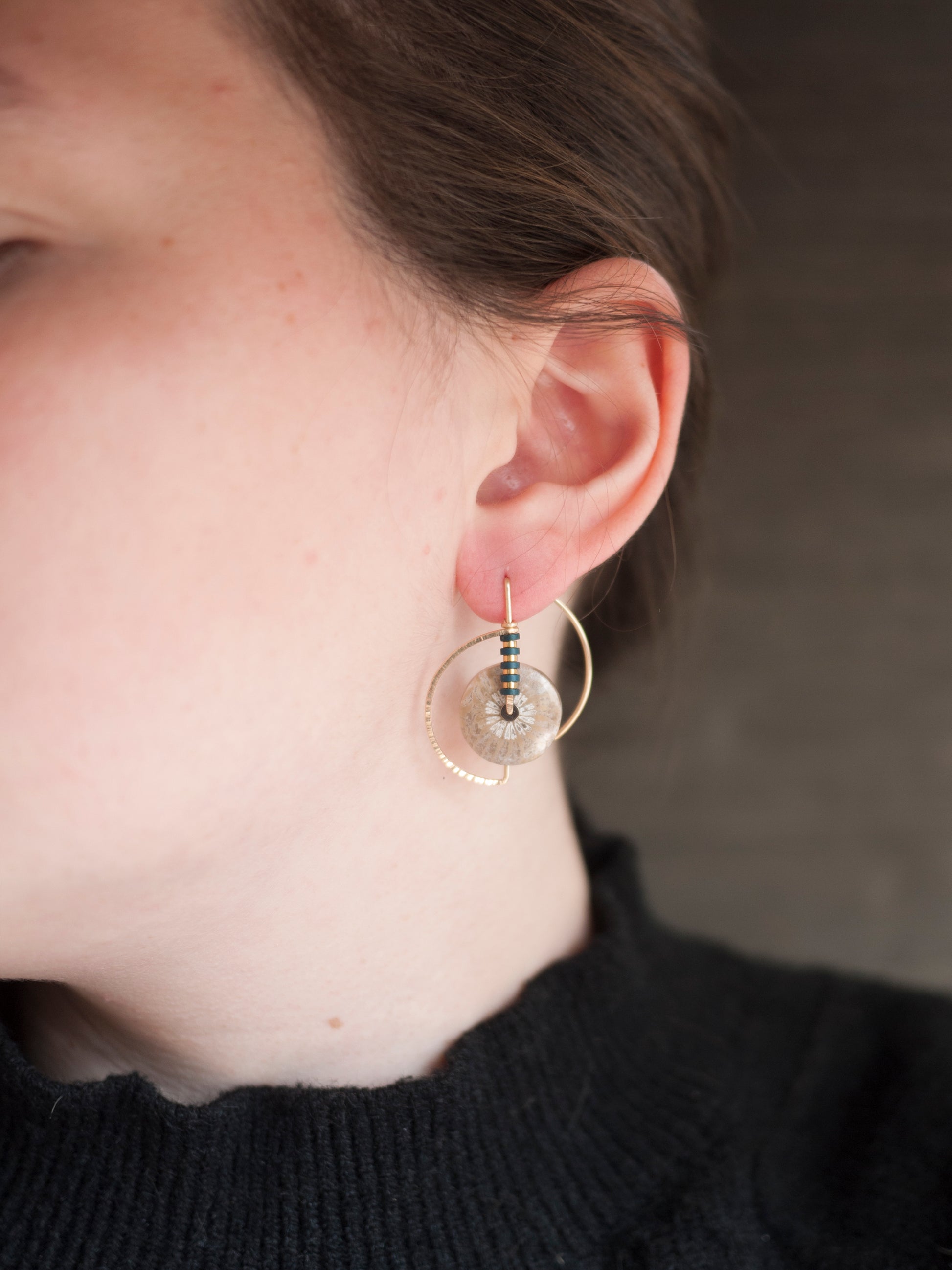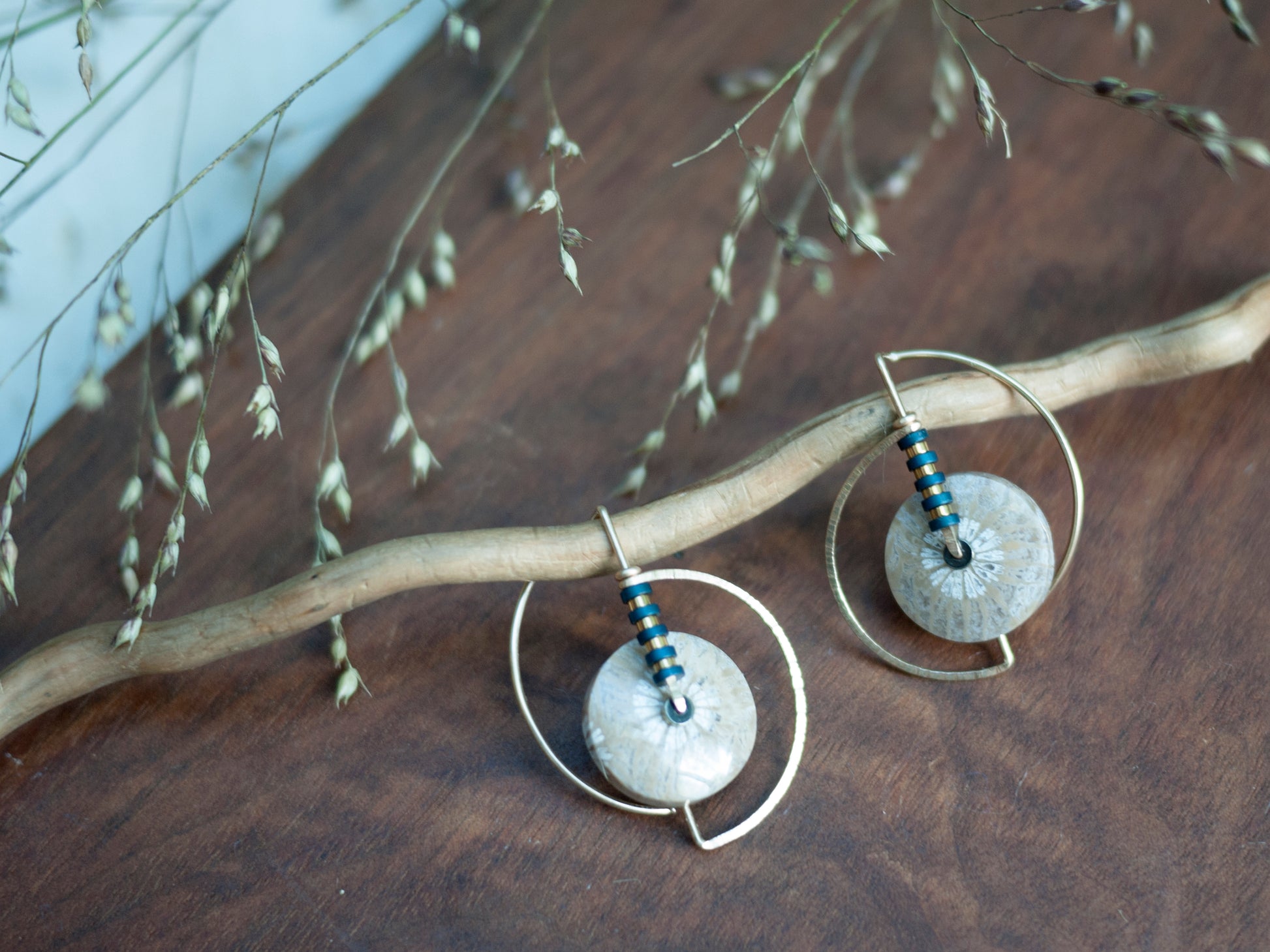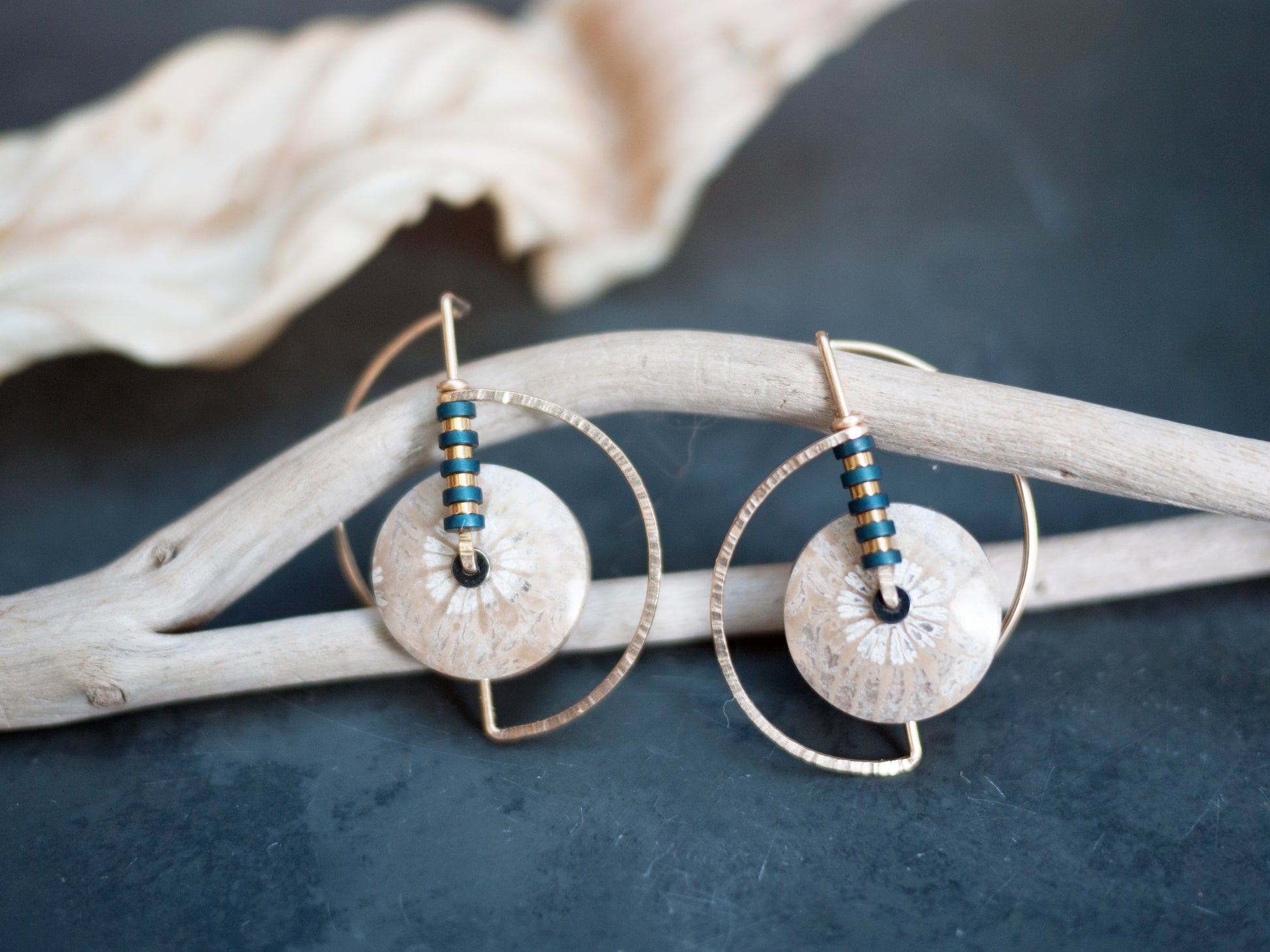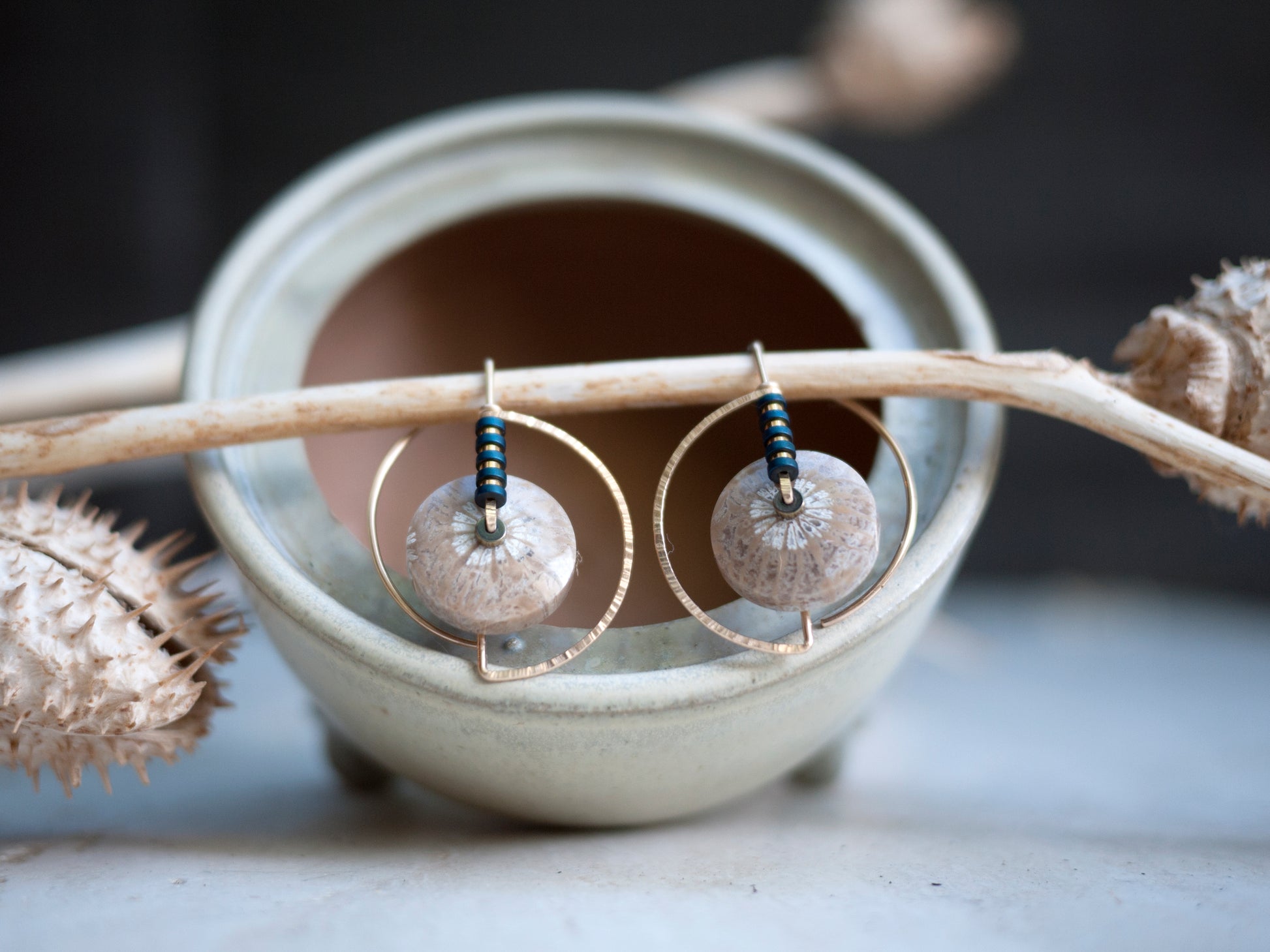The snowflake coral pattern on these fossilized coral beads gives the earrings a classic sophistication. The hammered gold fill wire frames the stones. Gold and blue hematite beads accent the wire. Earrings come with rubber backings.