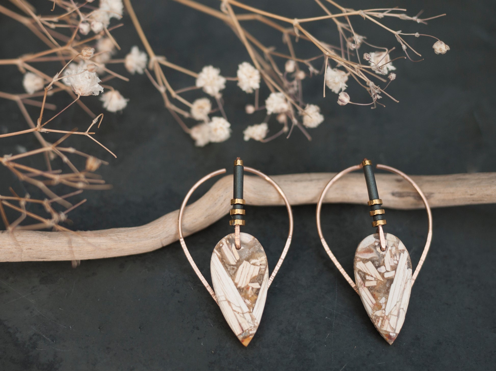 Looking for a striking jewelry accessory that will surely make a statement? These unique ear jackets could be the perfect fit! Made in rose gold fill, brecciated jasper stones hang in front of a leaf shaped silhouette. The wire is accented with hammer marks to add texture a sparkle. A line of grey and gold hematite beads draw your eye to the hand cut stones. The big wire leaf threads through the ear hole and sits behind the lobe.