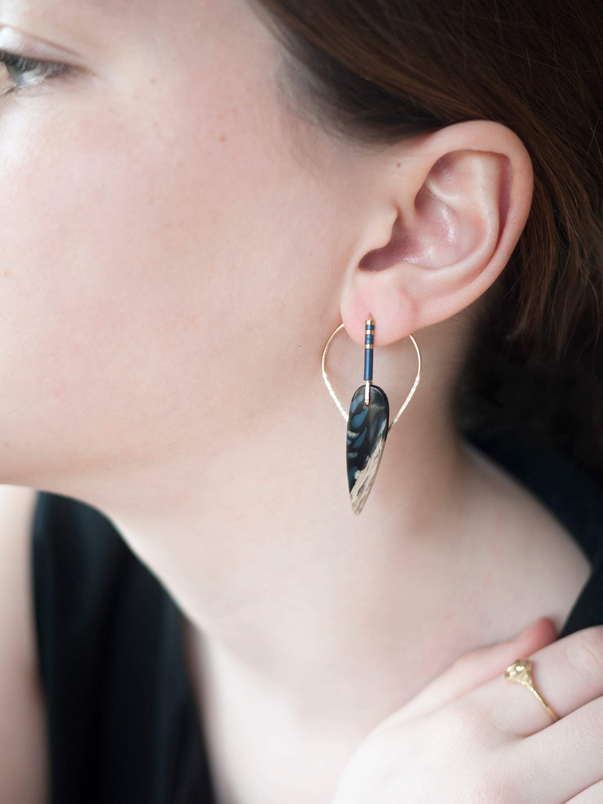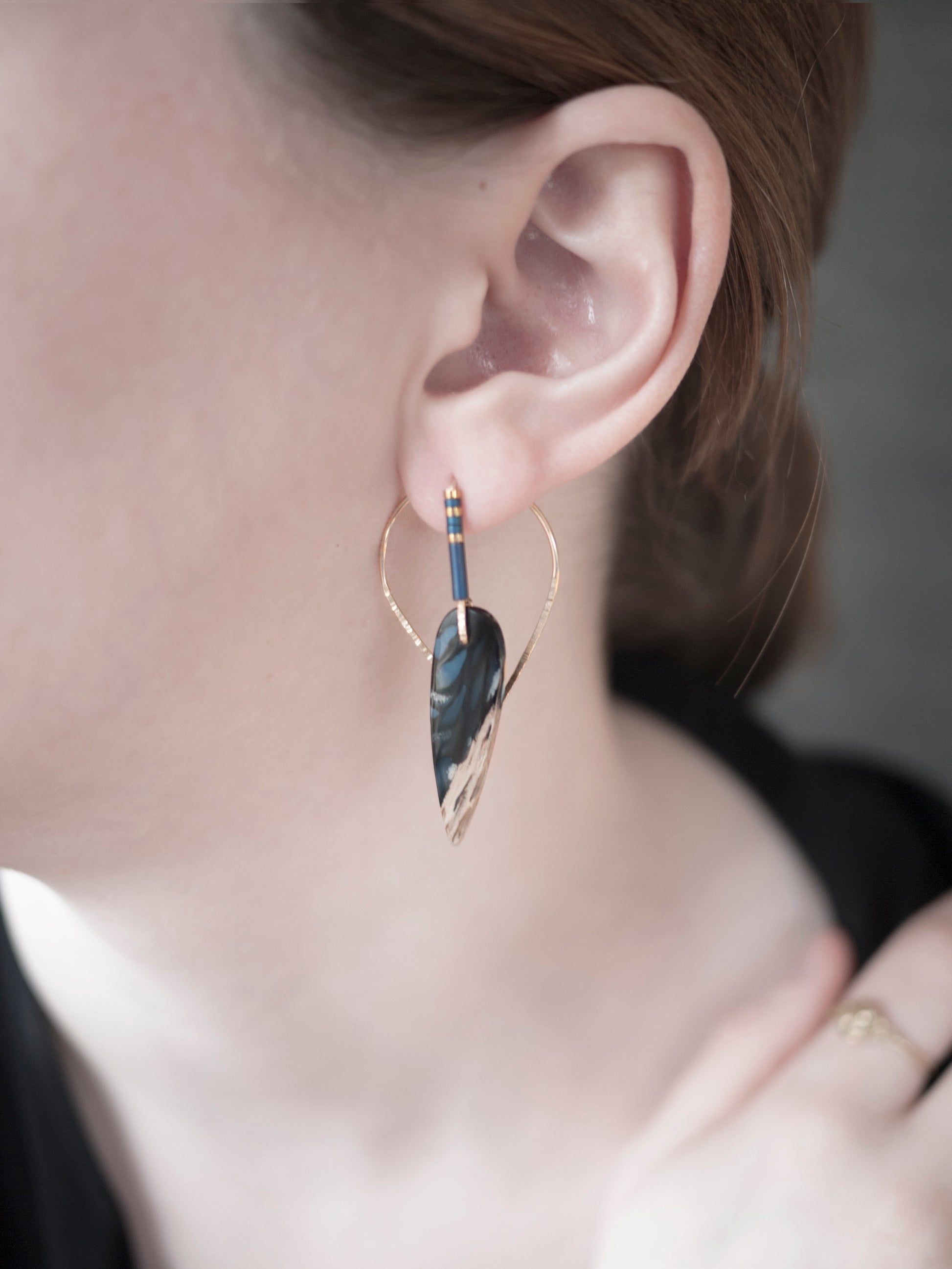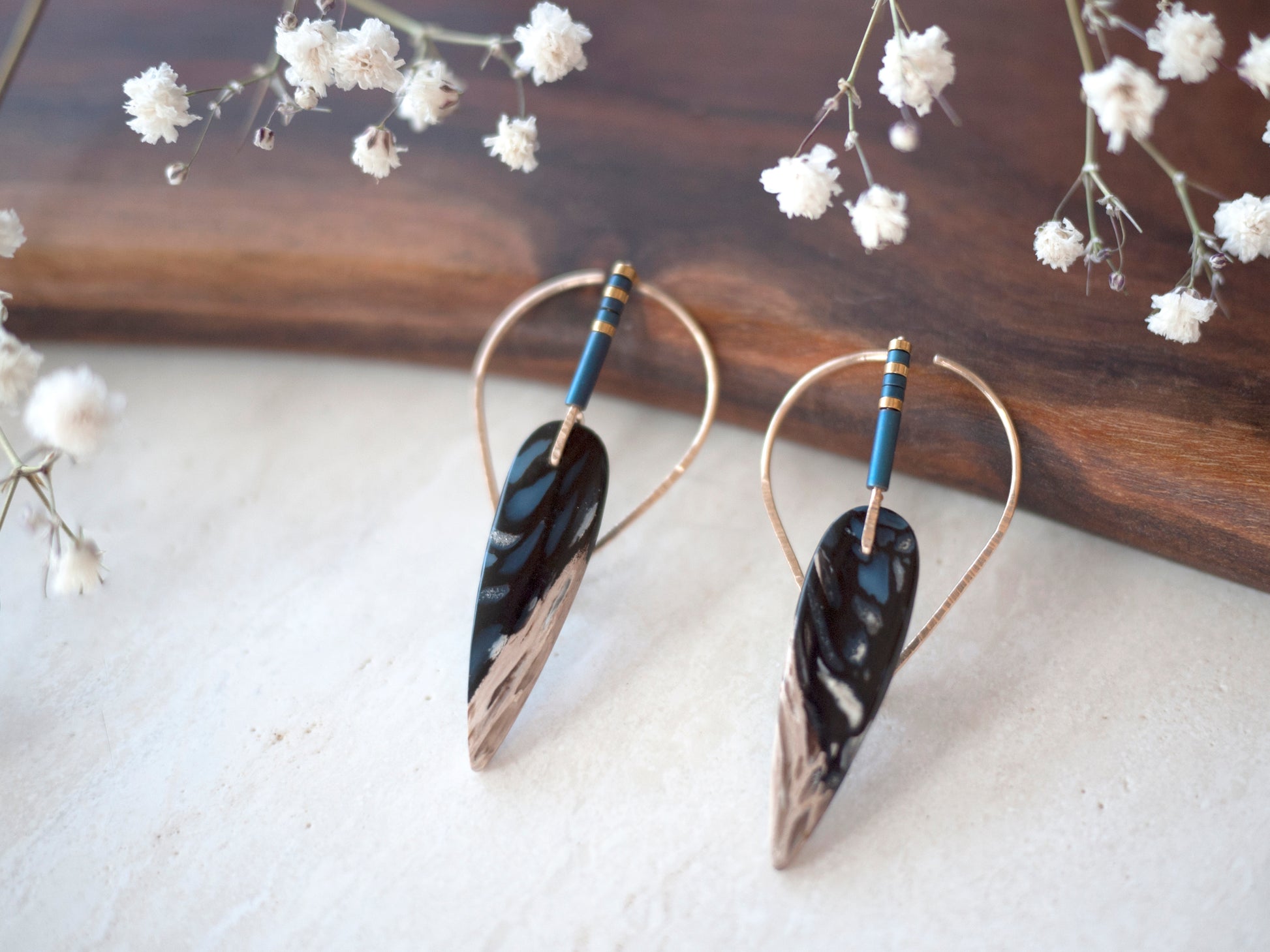 Looking for a striking jewelry accessory that will surely make a statement? These unique petrified palm wood ear jackets could be the perfect fit! Made in rose gold fill, the leaf shaped wire is accented with hammer marks to add texture a sparkle. A line of blue and gold hematite beads draw your eye to the hand cut stones. The big wire leaf threads through the ear hole and sits behind the lobe.