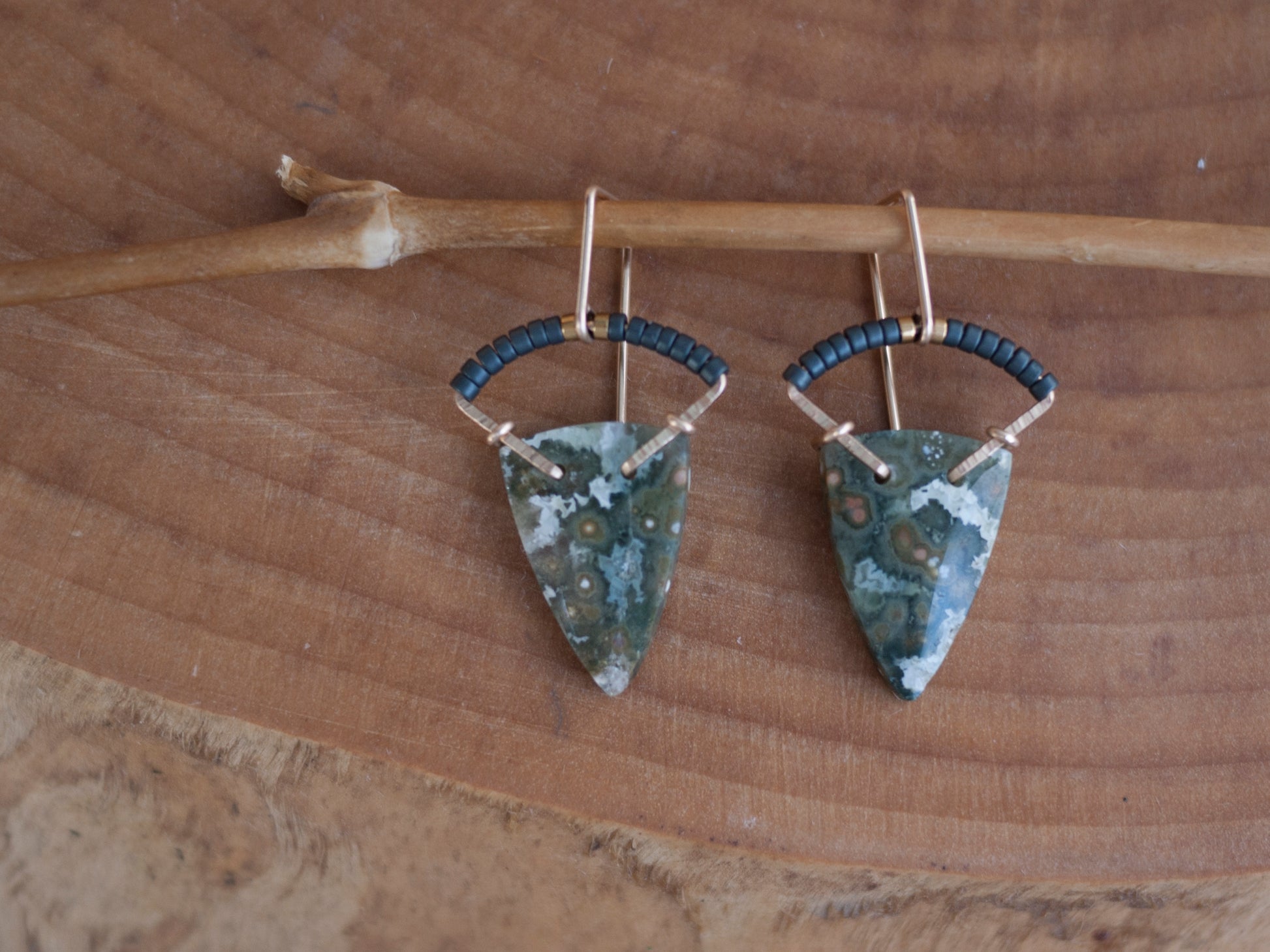 These striking green and white ocean jasper beads are hand cut from Indonesia. The stones are accented with an arch of intricate bent rose gold fill wire and tiny hematite beads. The wire is hammered to give texture and sparkle.