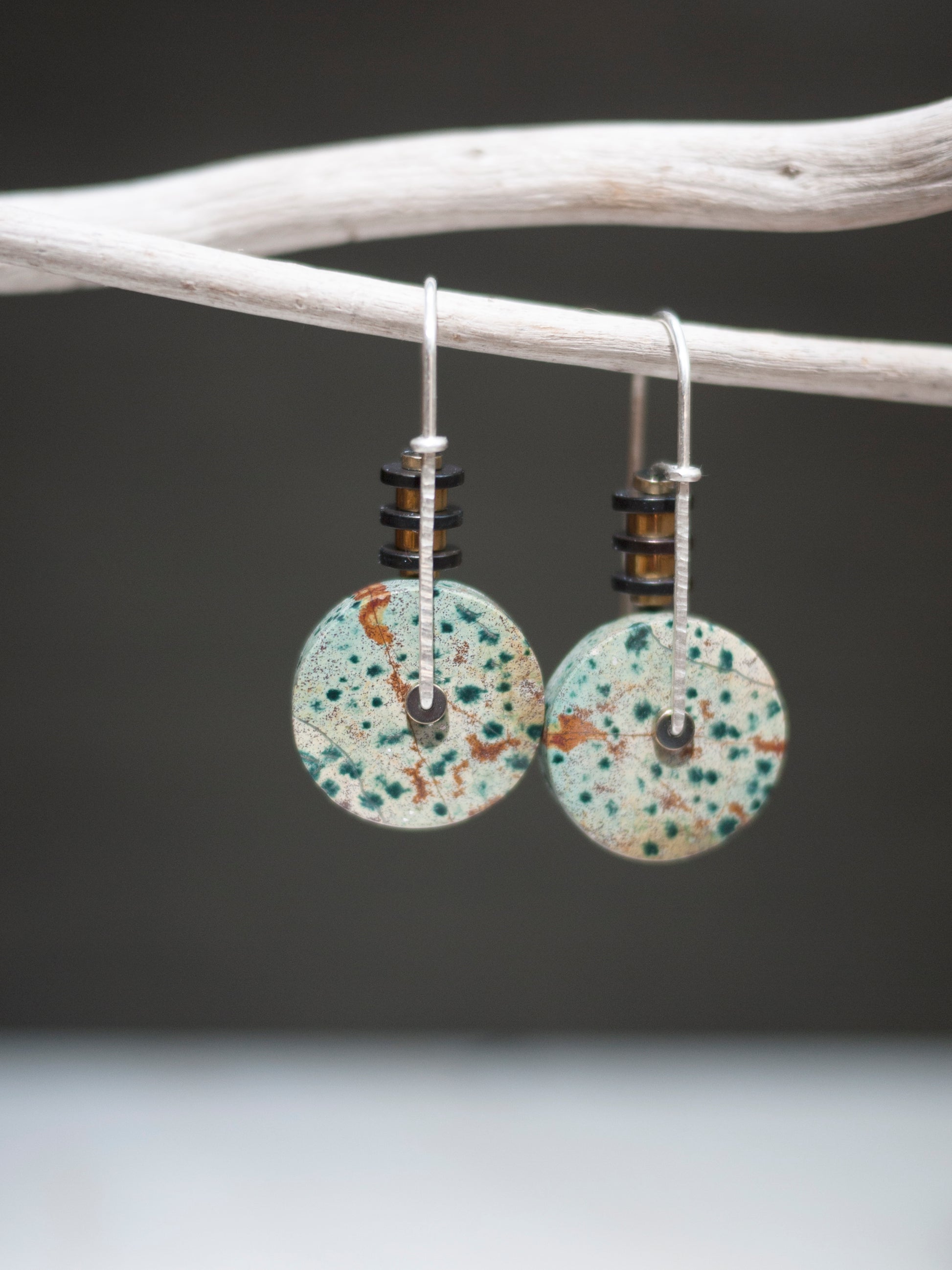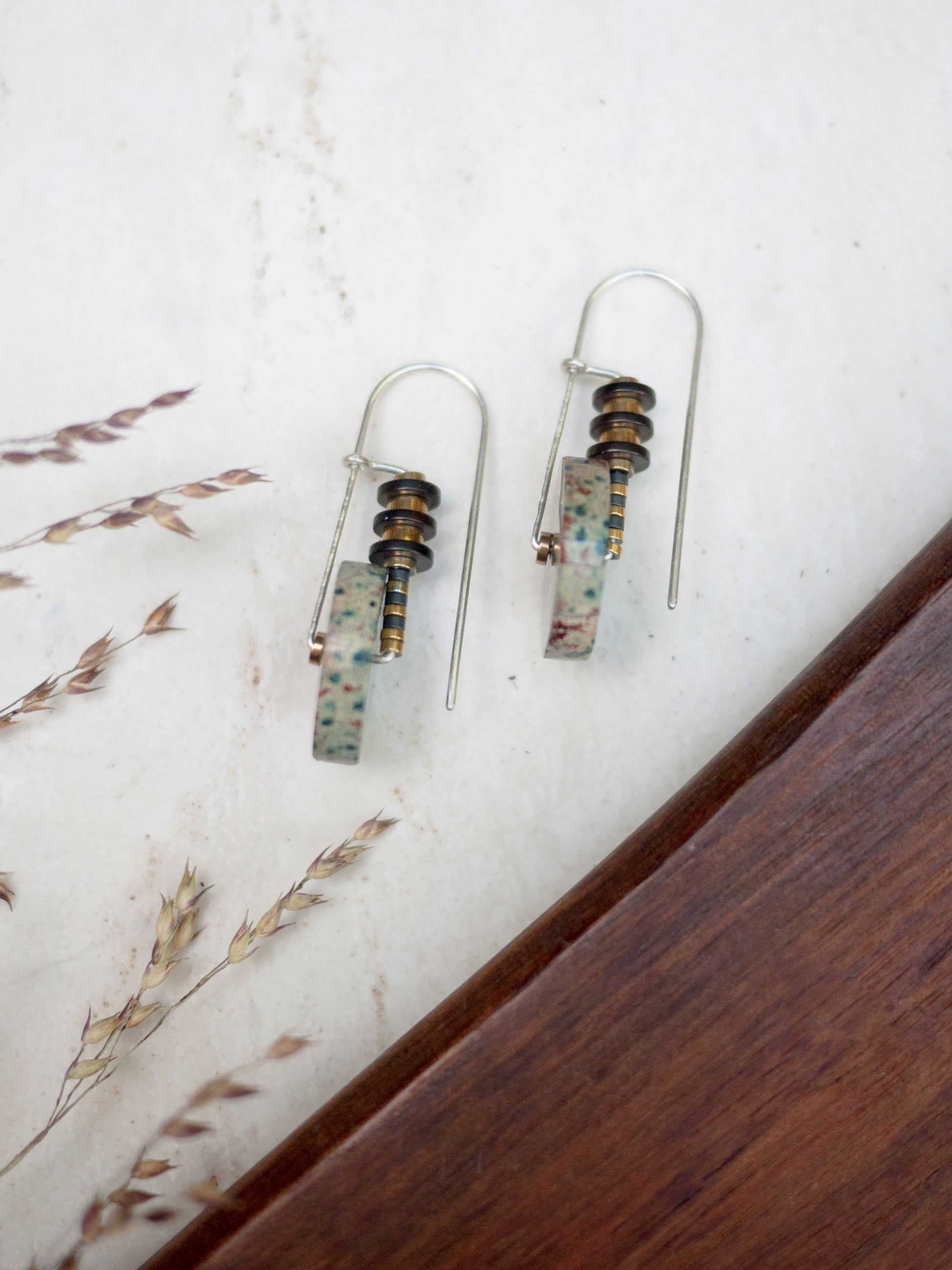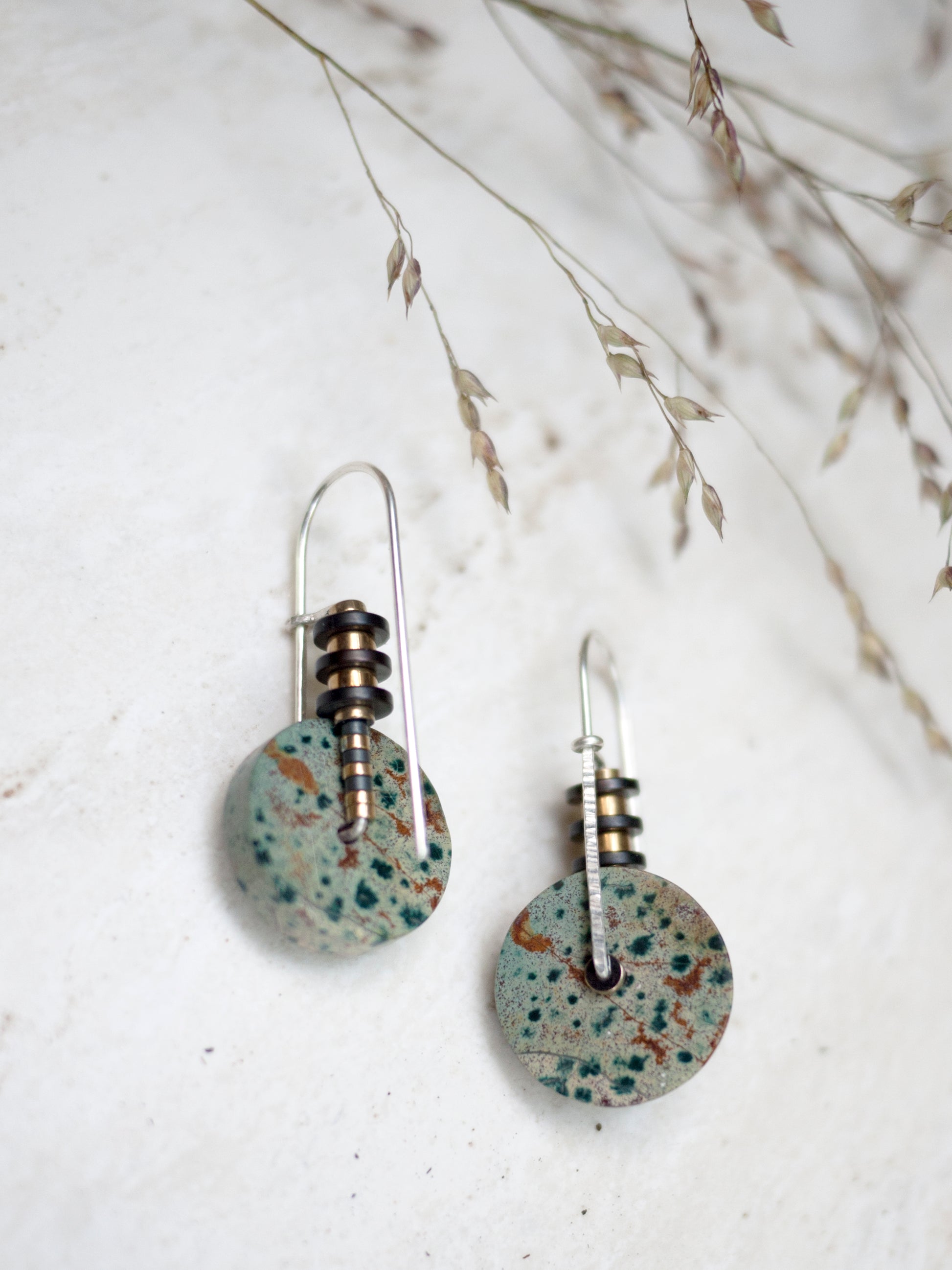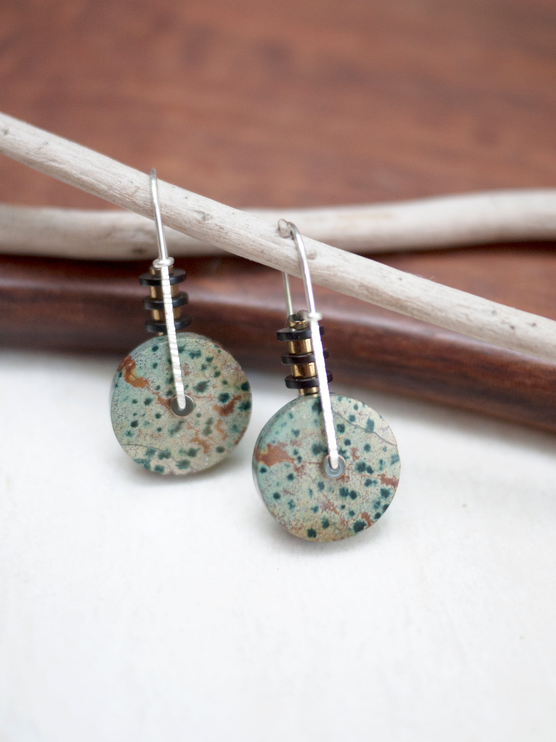 These forest jasper stones are magnificent. The have a rich pattern in rust, light and teal green, and cream colors. The solid sterling silver wire is adorned with gold and dark grey hematite beads. The ear wires are long and add intrigue to the style. Earrings come with rubber backings.