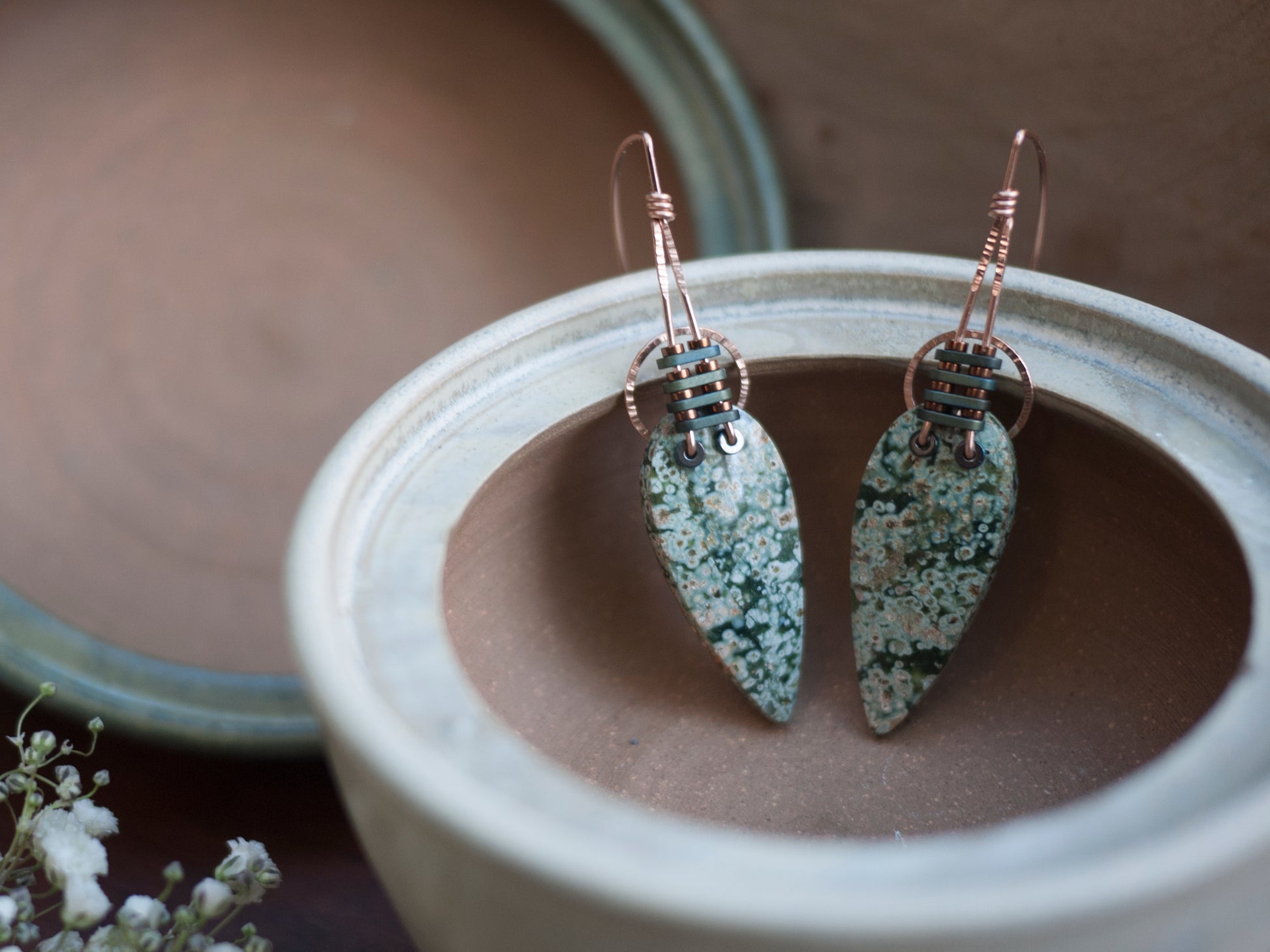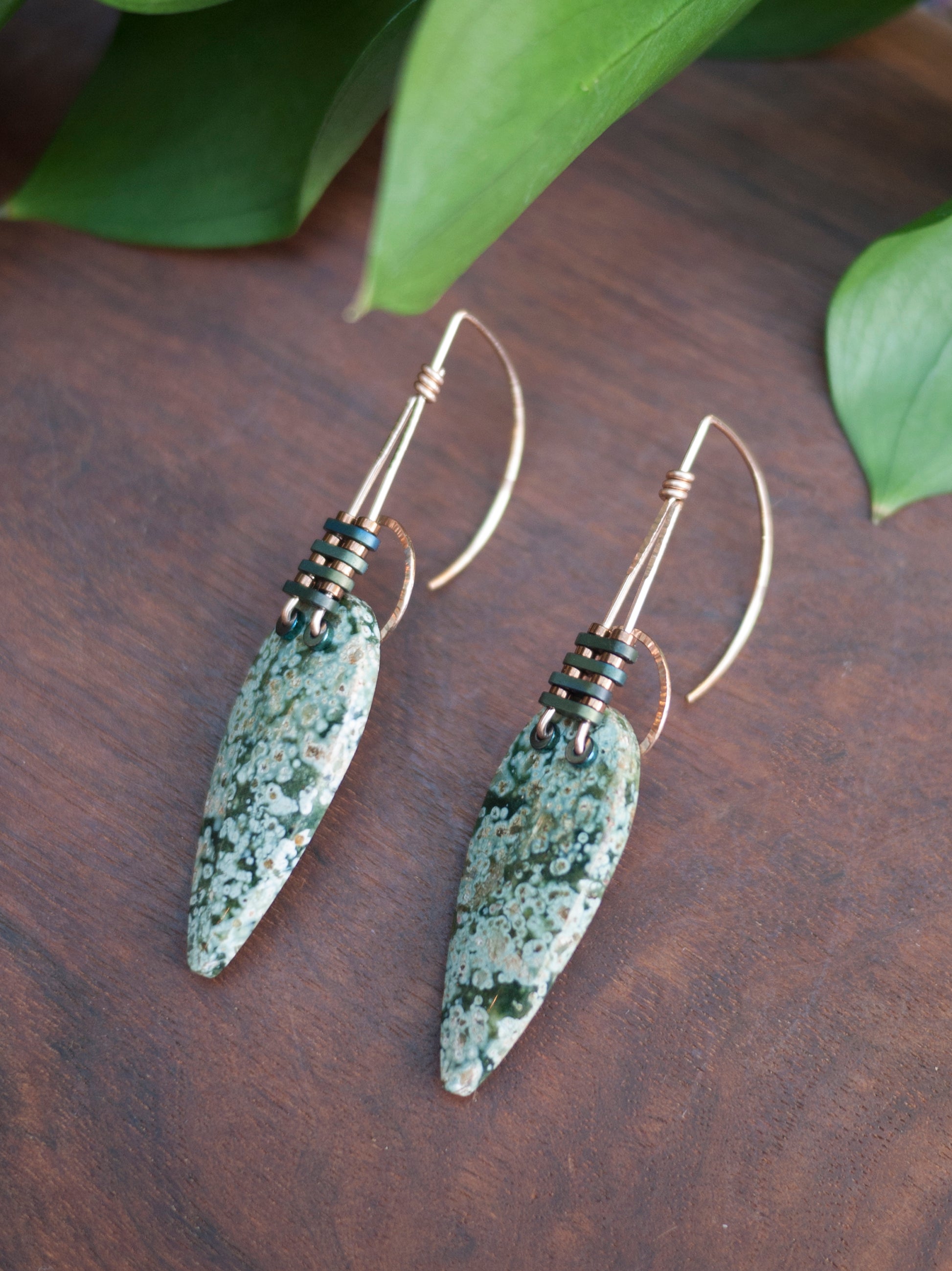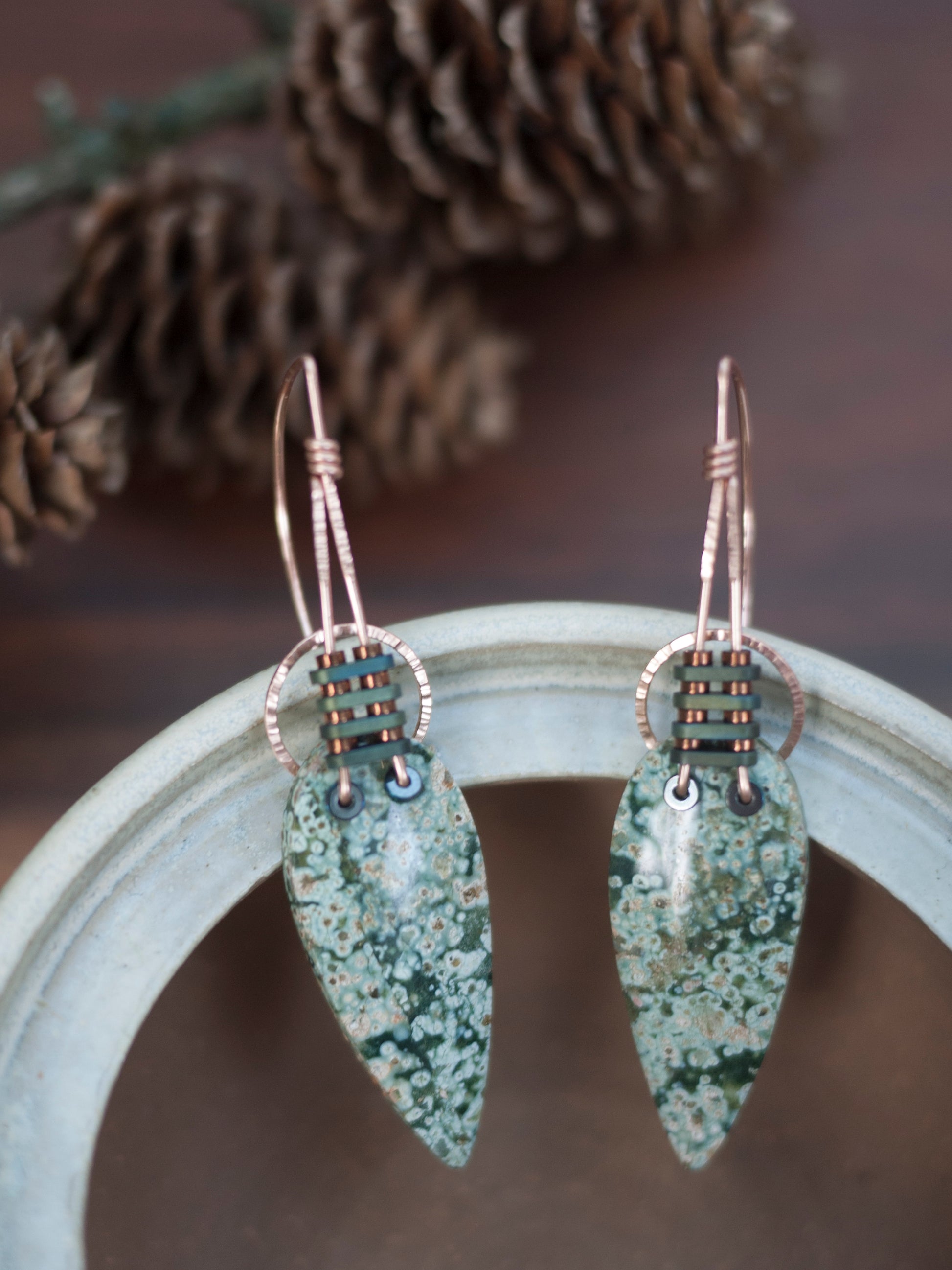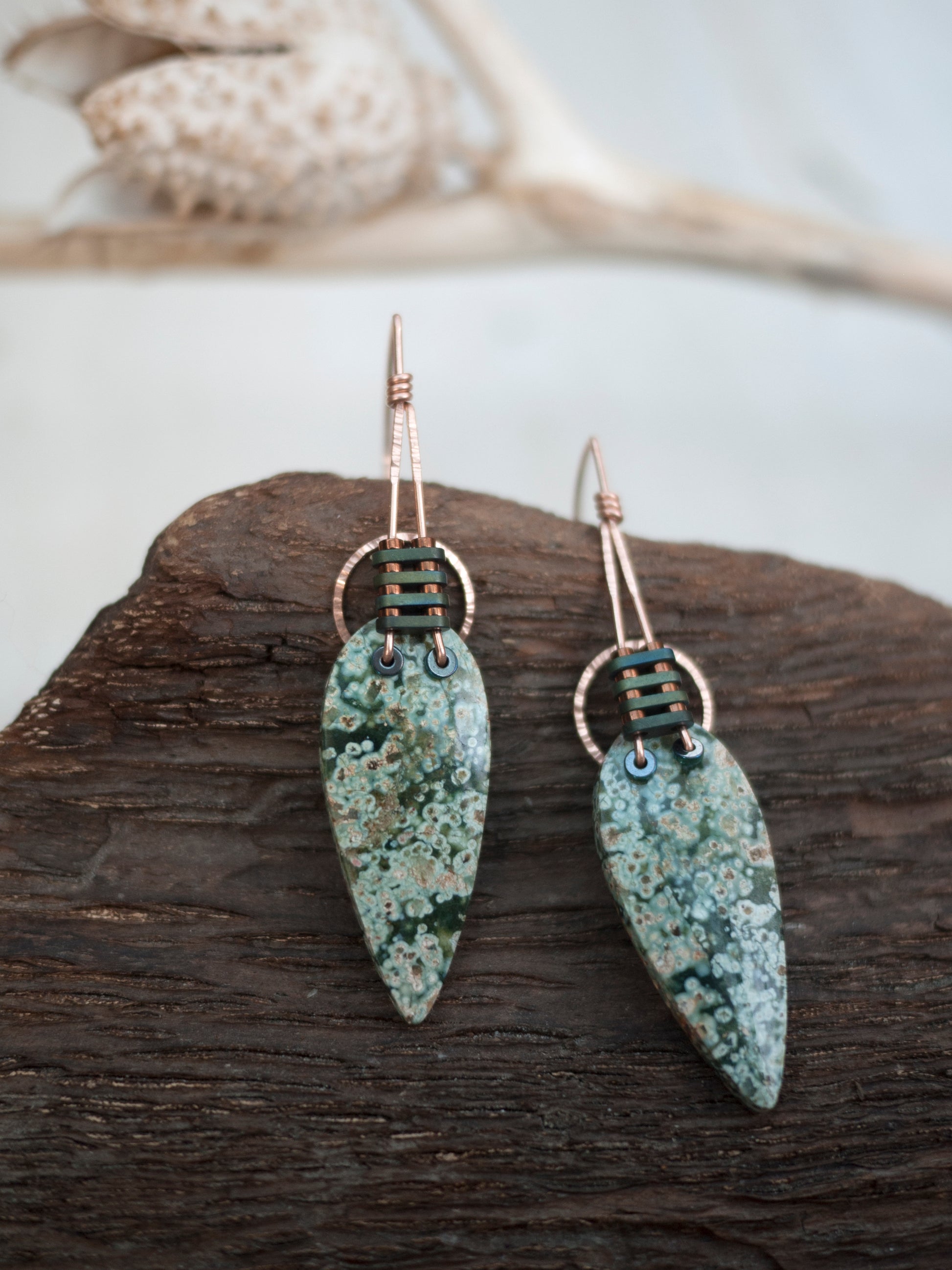 The blue/green tones are unusual in color for forest jasper. These beautiful specimens are accented with copper and grey colored hematite beads and rose gold filled wire. The wire has portions that are hammered giving them sparkle. The earring wires have a sculptural curve to them.