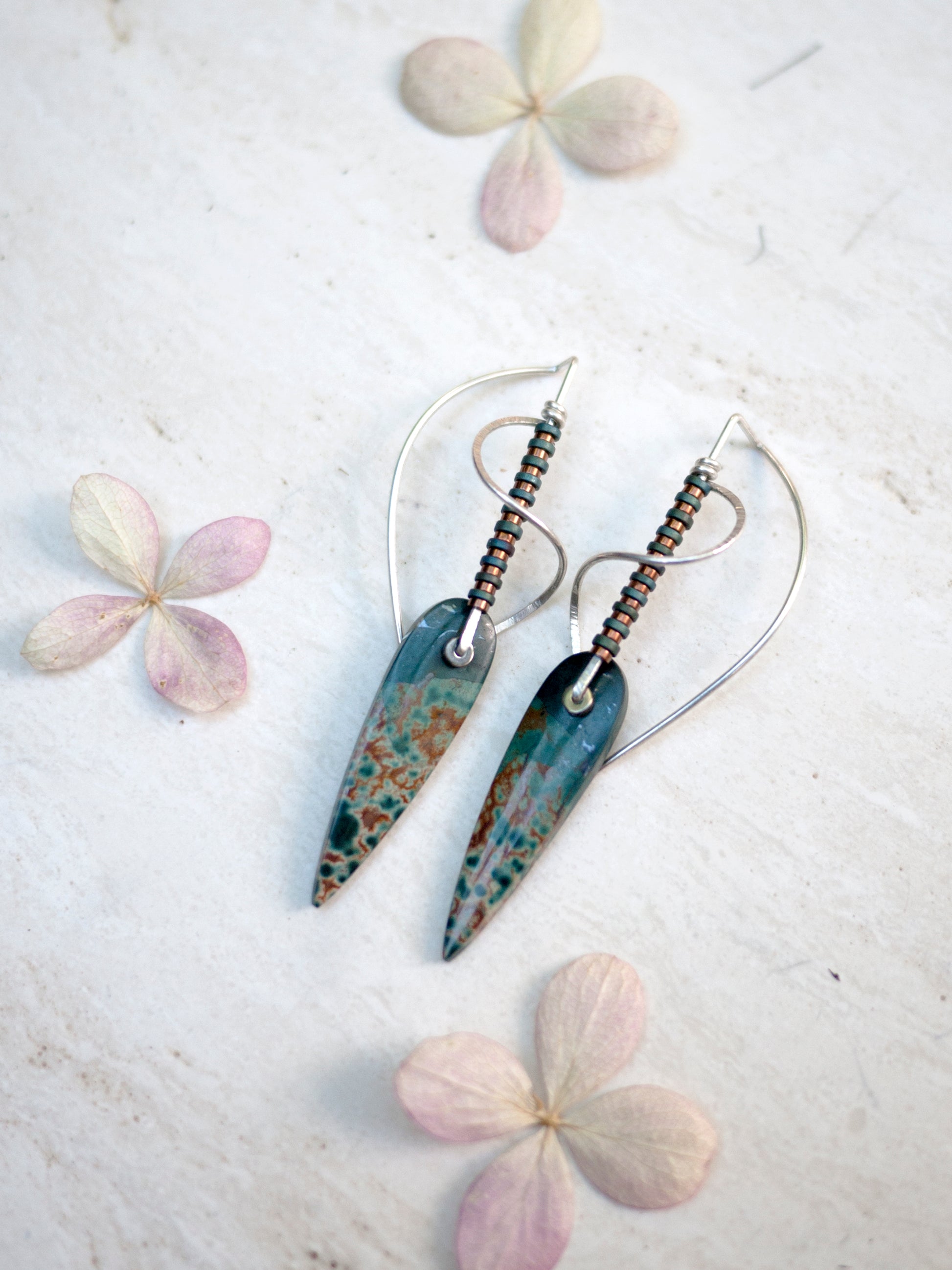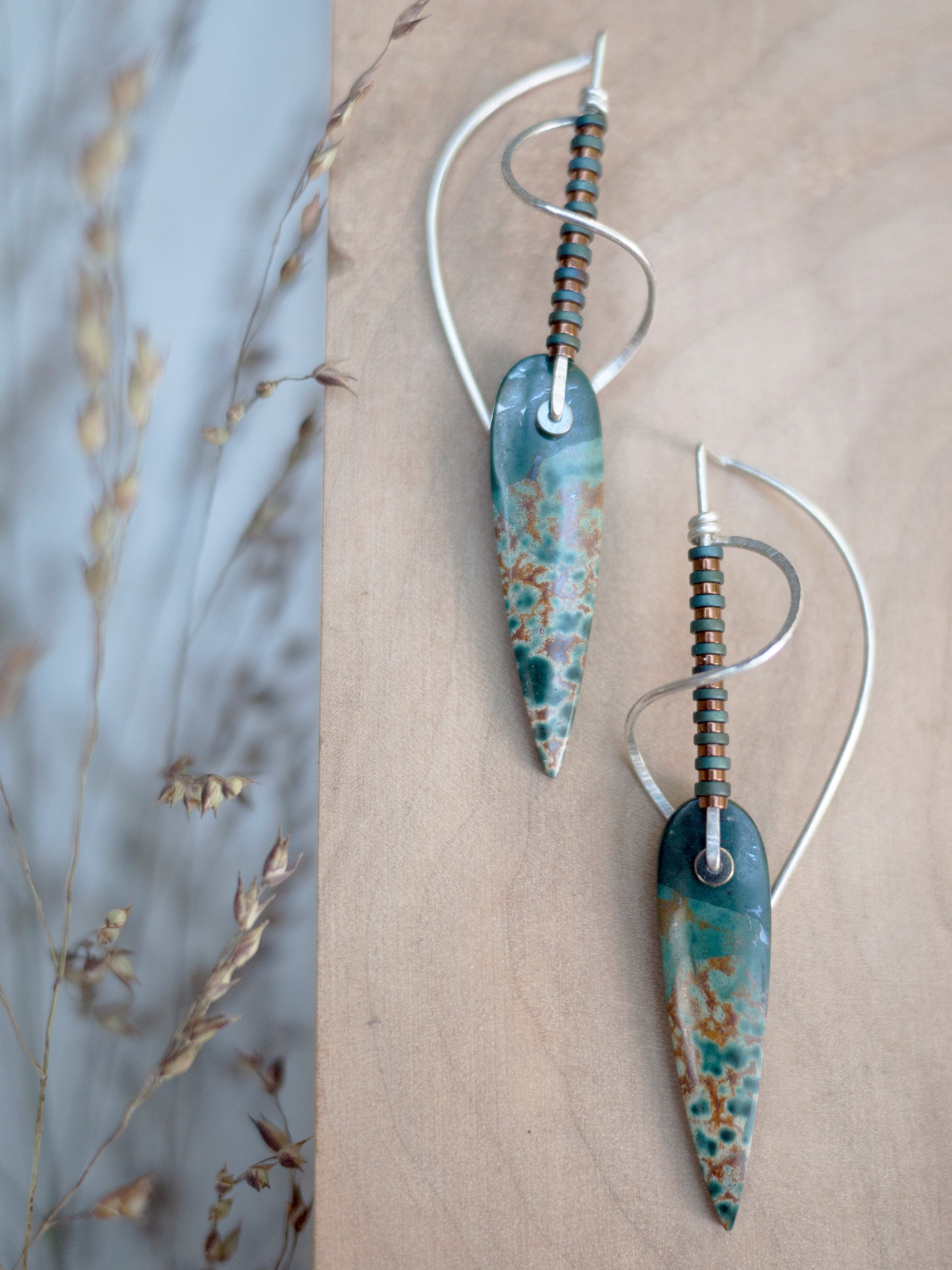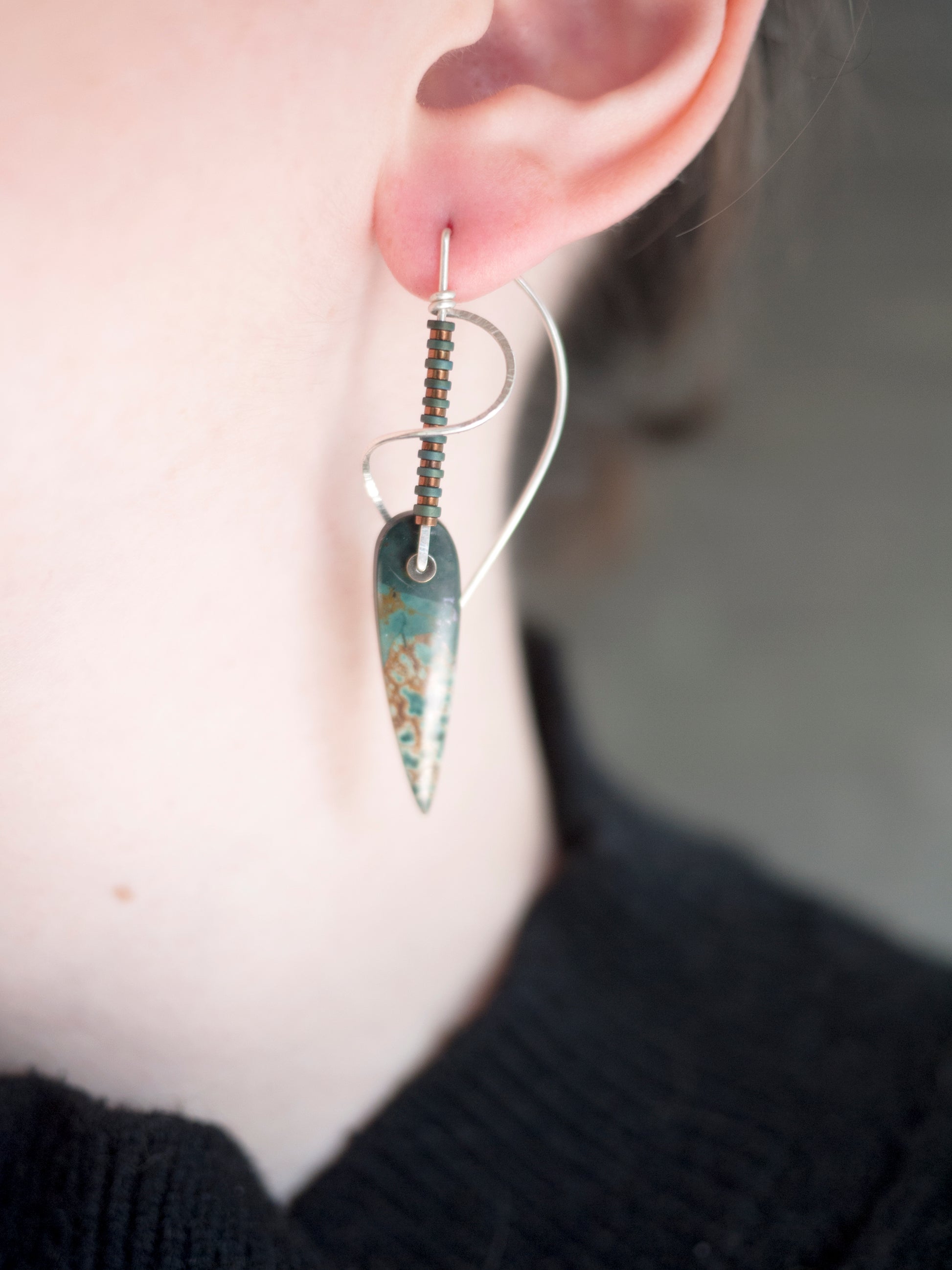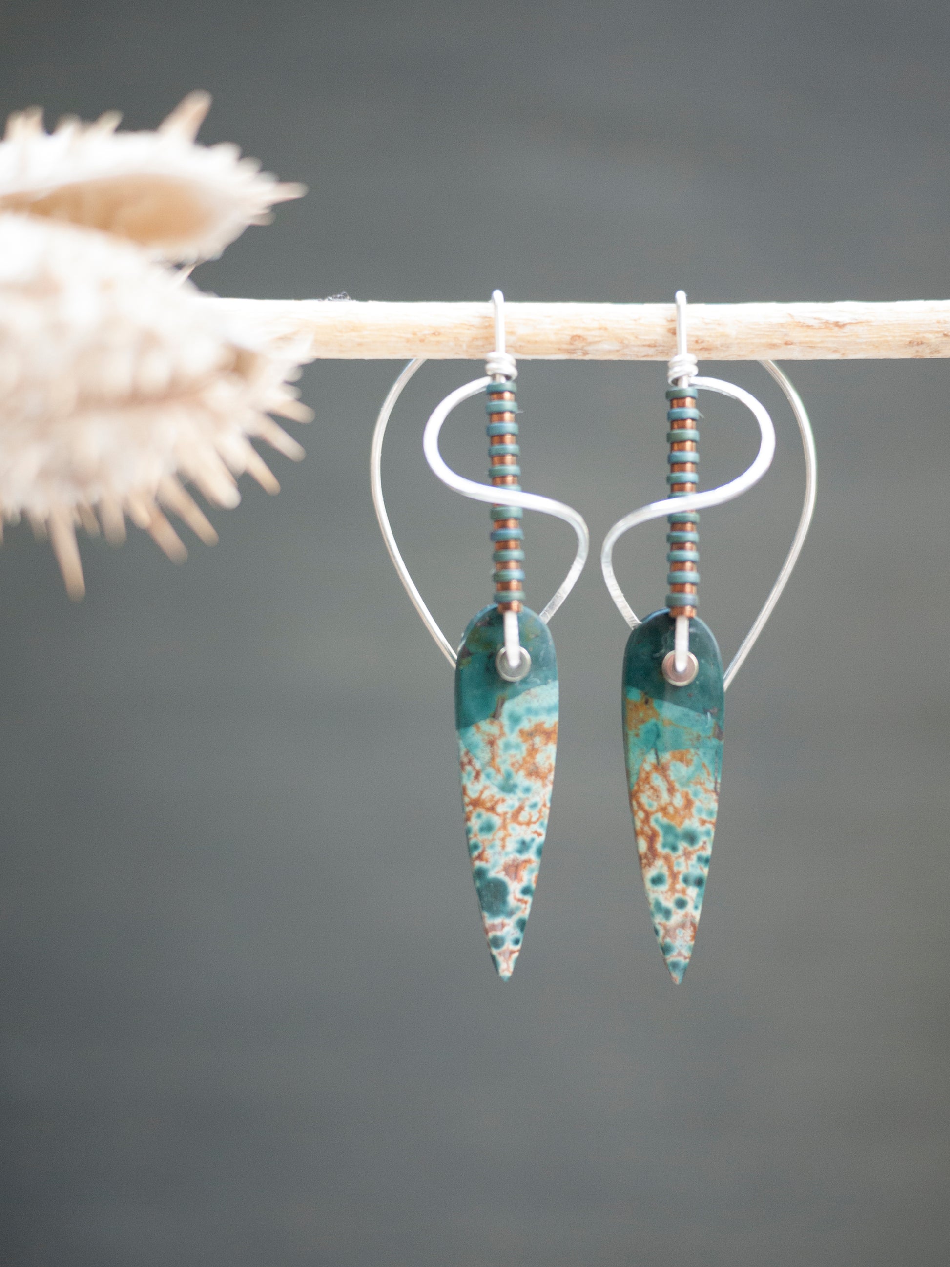 These beautiful natural forest jasper stone beads have an ombre of aqua blue into cream splattered with rust red and green. The sterling silver wire is adorned with copper and green hematite beads and round red jasper beads. The ear wires are arched to add design interest. Earrings come with rubber backings.