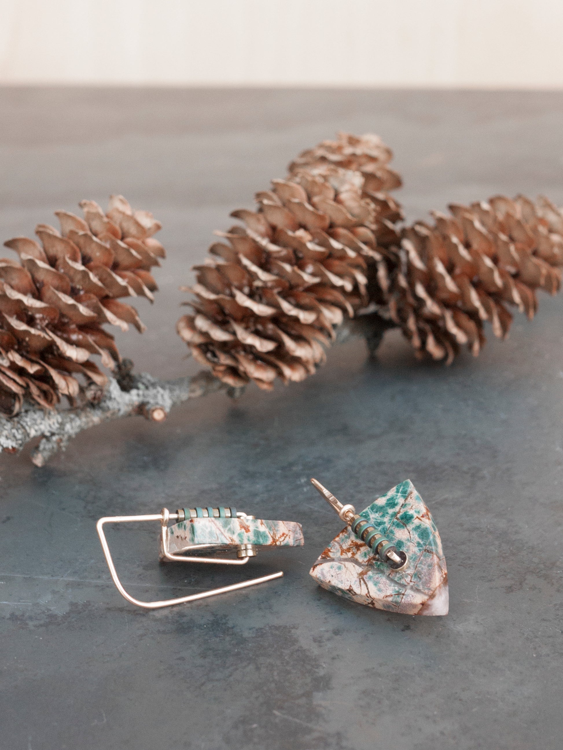These forest jasper stones are magnificent. They have a rich pattern in rust, green, and cream colors. The wire is adorned with gold and green hematite beads. The ear wires are long and add intrigue to the style. Earrings come with rubber backings.