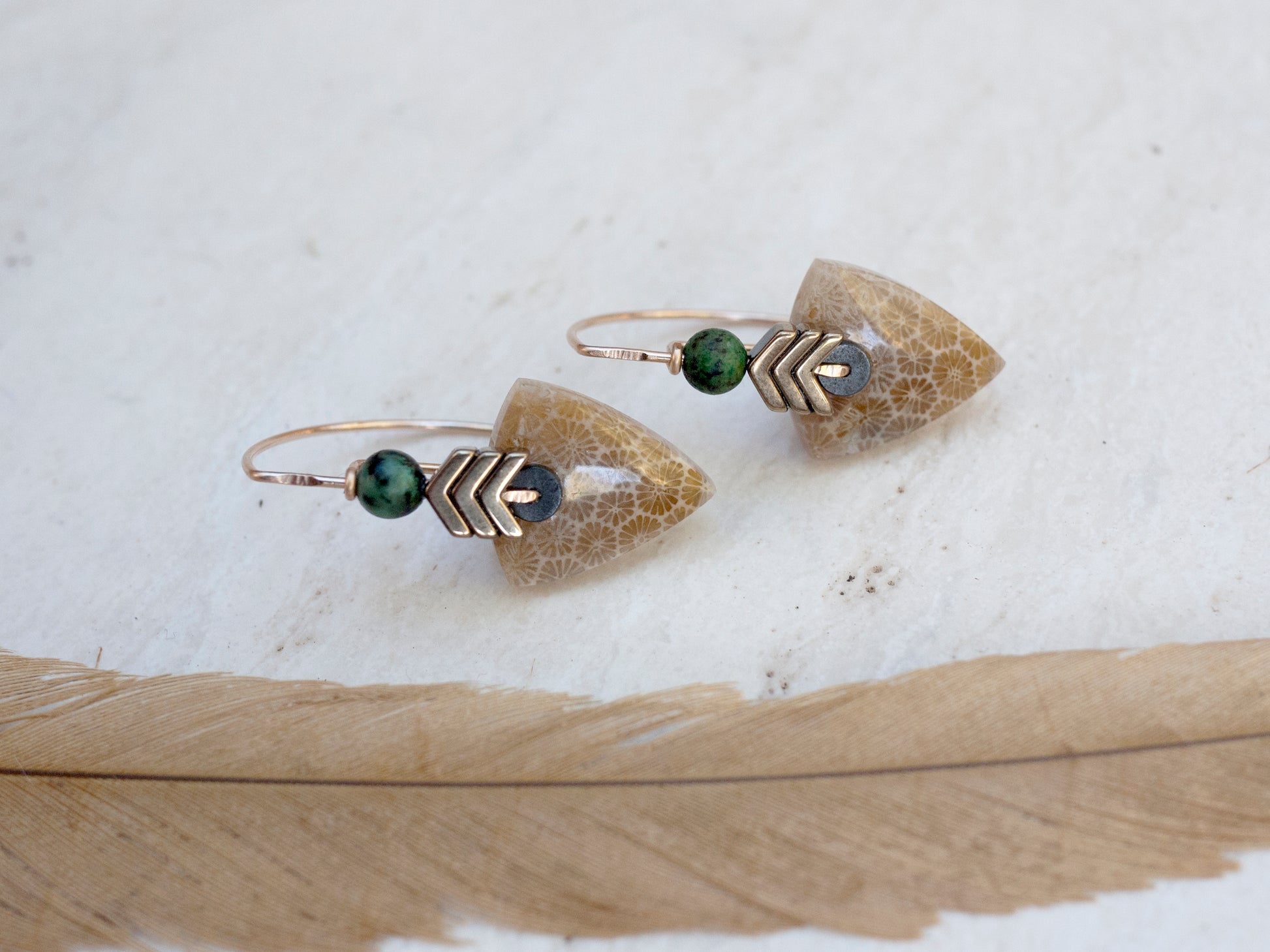 These beautiful fossil coral stones are accented with gold chevron shaped hematite beads and yellow gold fill wire. The wire has portions that are hammered giving them sparkle. African turquoise beads adds pop of color. The earring wires have a sculptural curve to them. Earrings come with rubber backings.