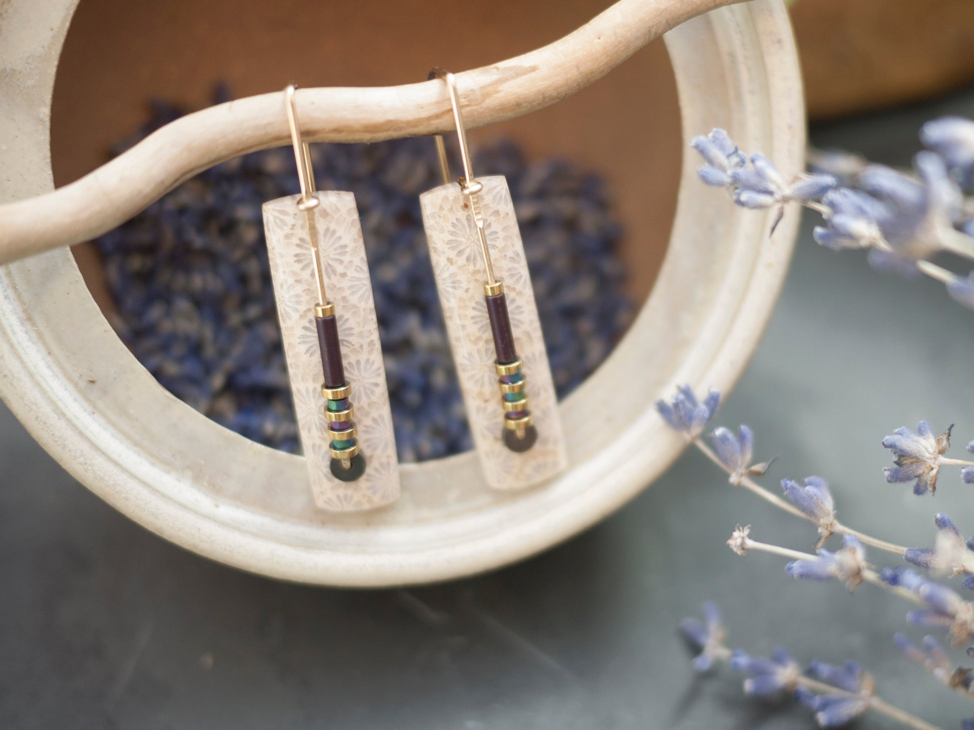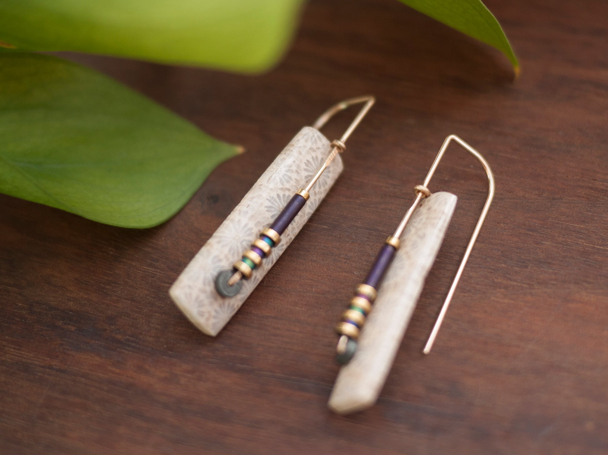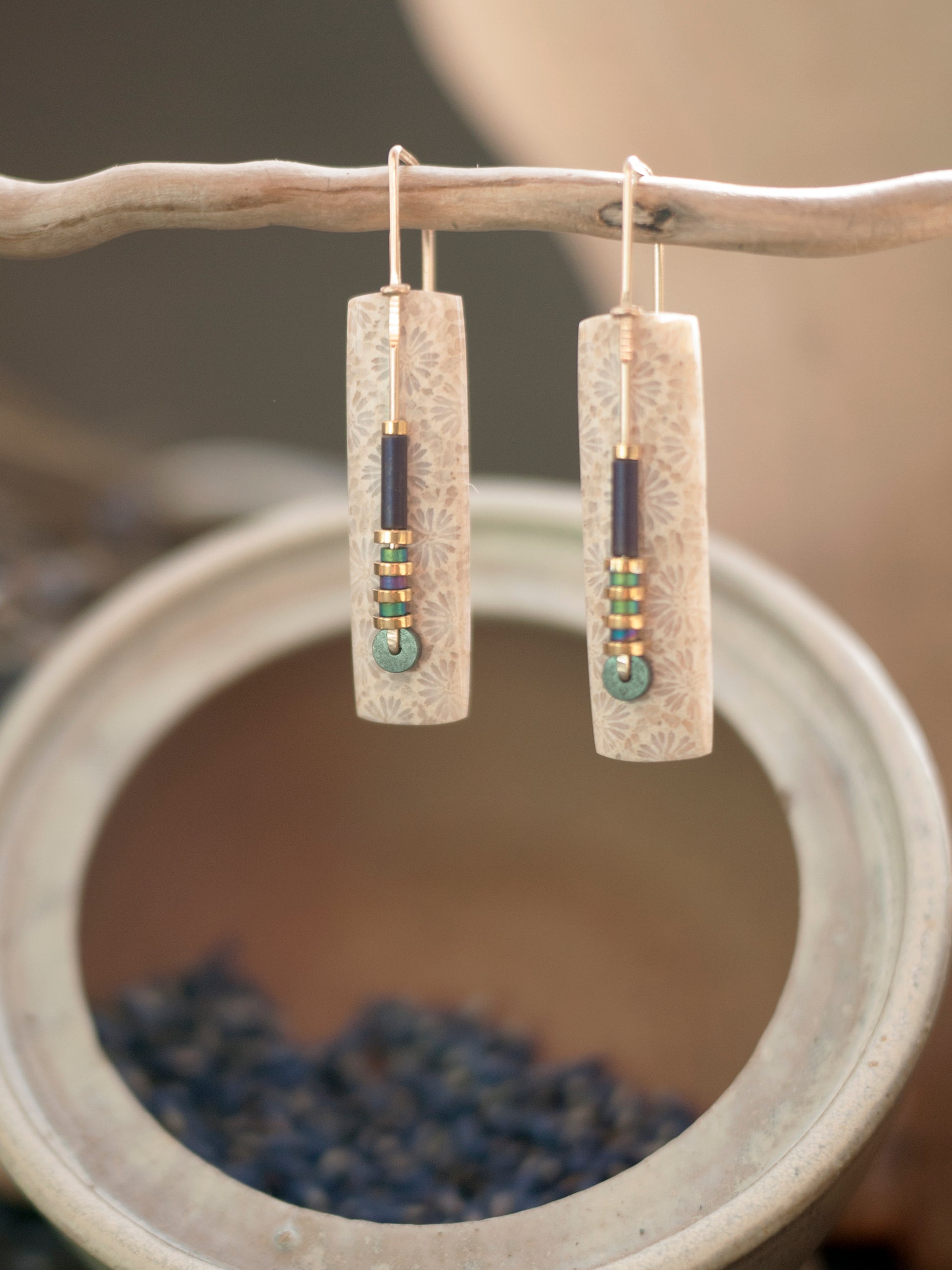 Wear a piece of natures past with these fossil coral earrings. Indonesian hand cut fossil coral beads are accented with yellow gold filled wire and tiny hematite beads. Earrings come with rubber backings.