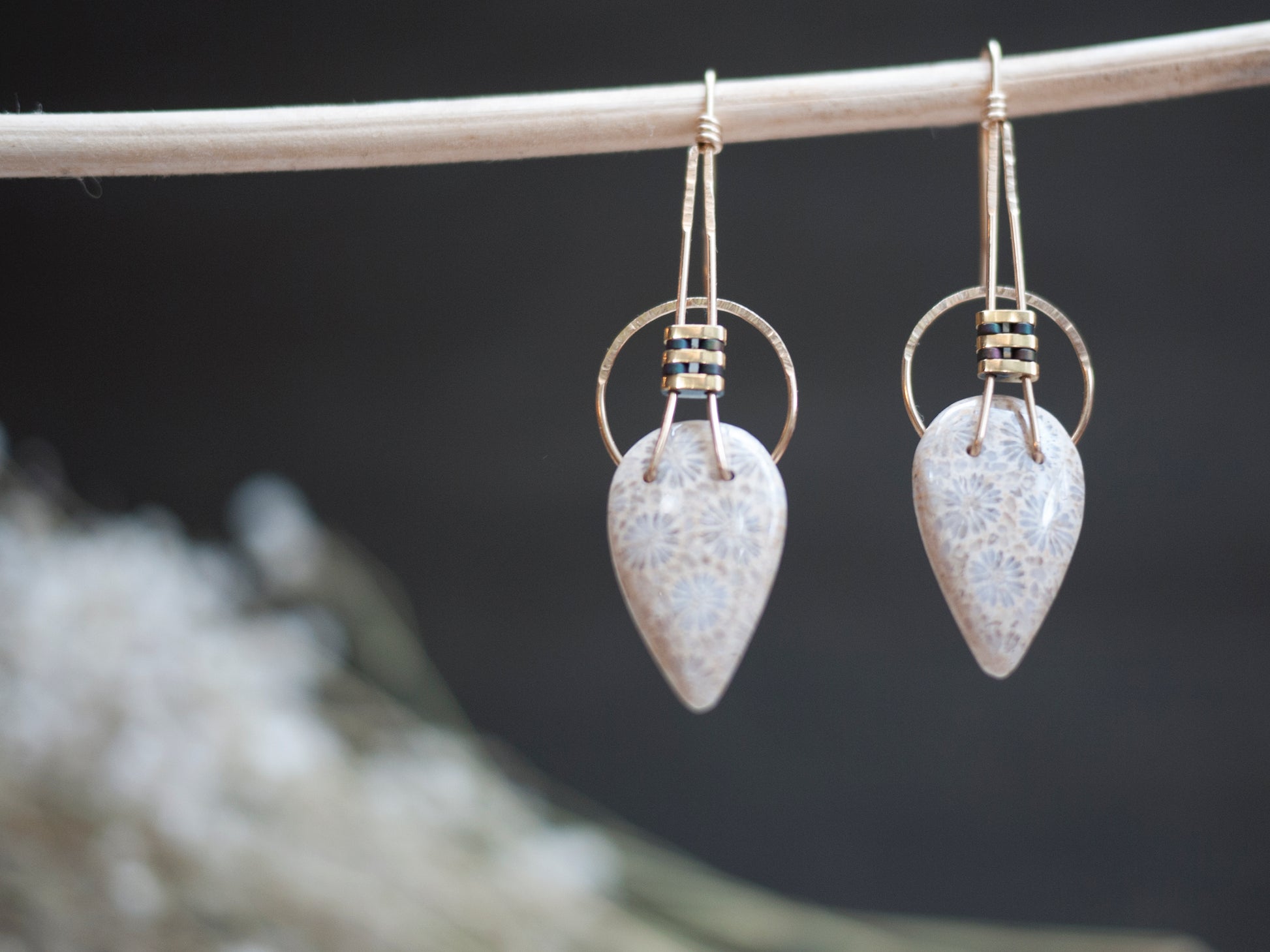 Wear a piece of natures past with these fossil coral earrings. Indonesian hand cut fossil coral beads are accented with intricate bent gold fill wire and tiny hematite beads.