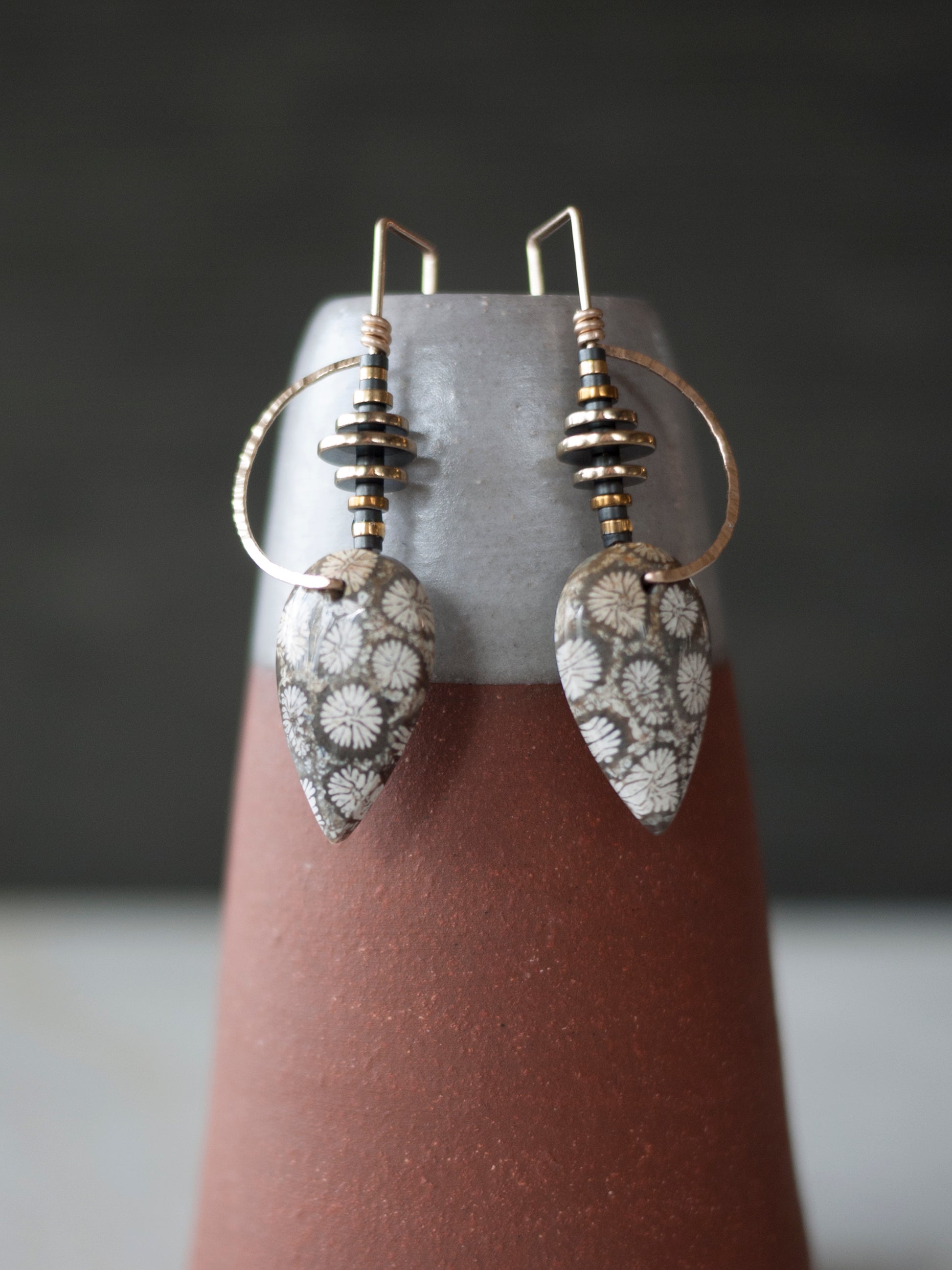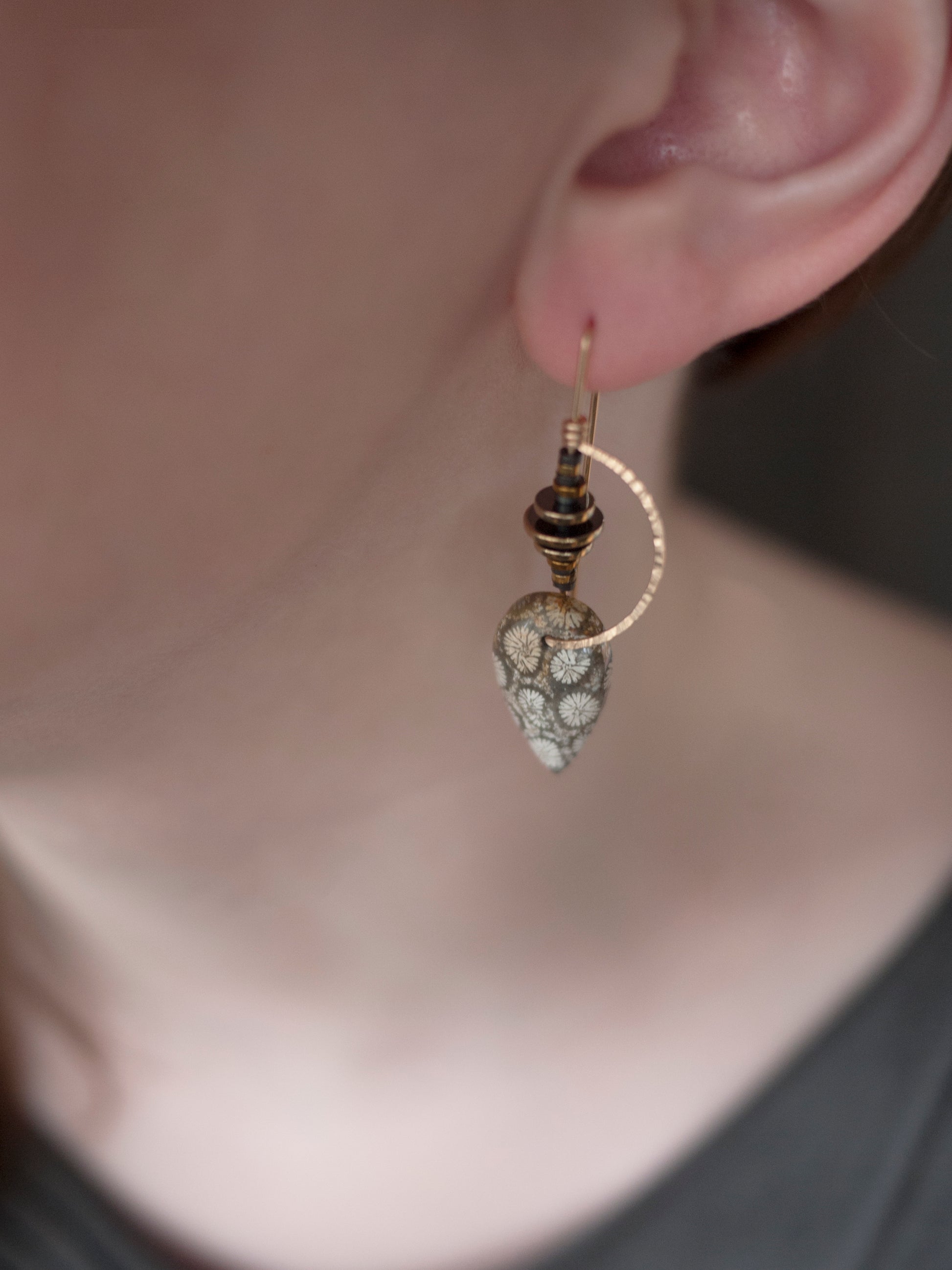 Wear a piece of natures past with these fossil coral earrings. Indonesian hand cut fossil coral beads are accented with intricate bent gold fill wire and tiny hematite beads. The wire is hammered to give texture and sparkle.
