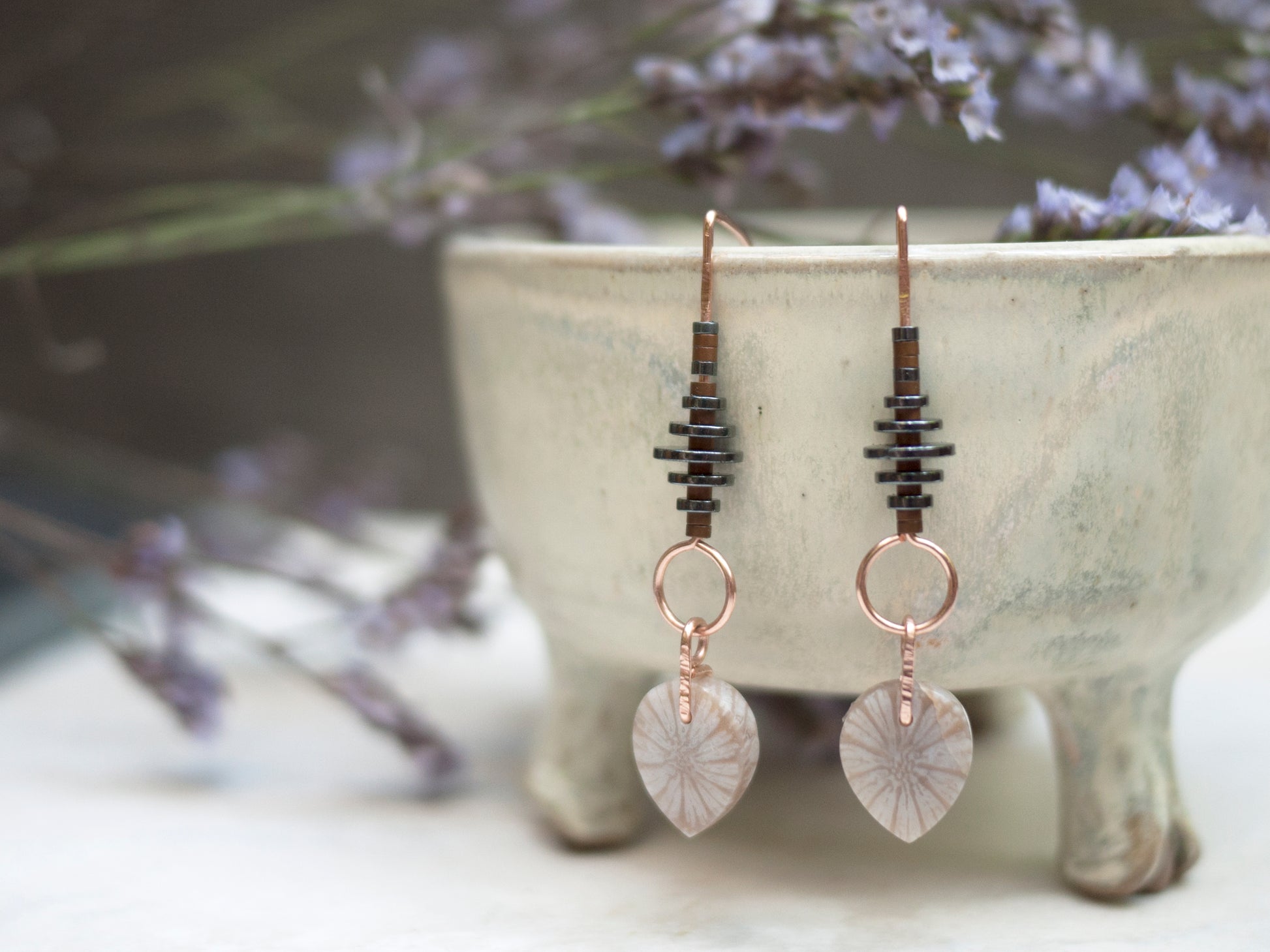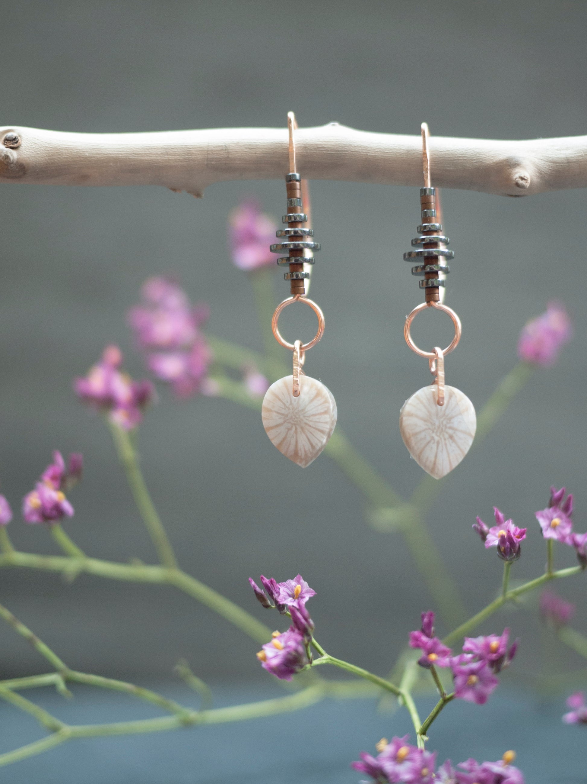 The sweet star pattern on these fossilized coral beads is so dainty and unique. The rose gold fill wire is adorned with a pattern of hematite disc beads. Earrings come with rubber backings.