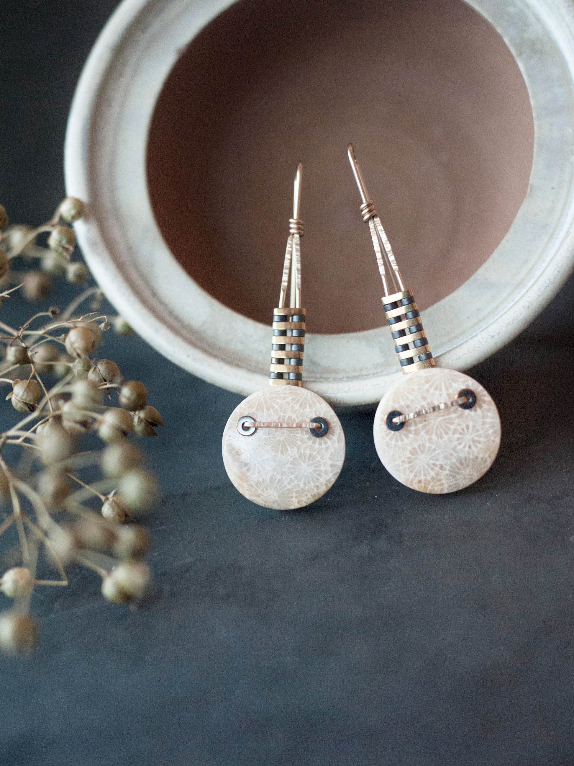 The subtle pattern on these fossilized coral beads gives them a classic sophistication. The gold fill wire is adorned with a pattern of hematite gold and purple beads. Earrings come with rubber backings.
