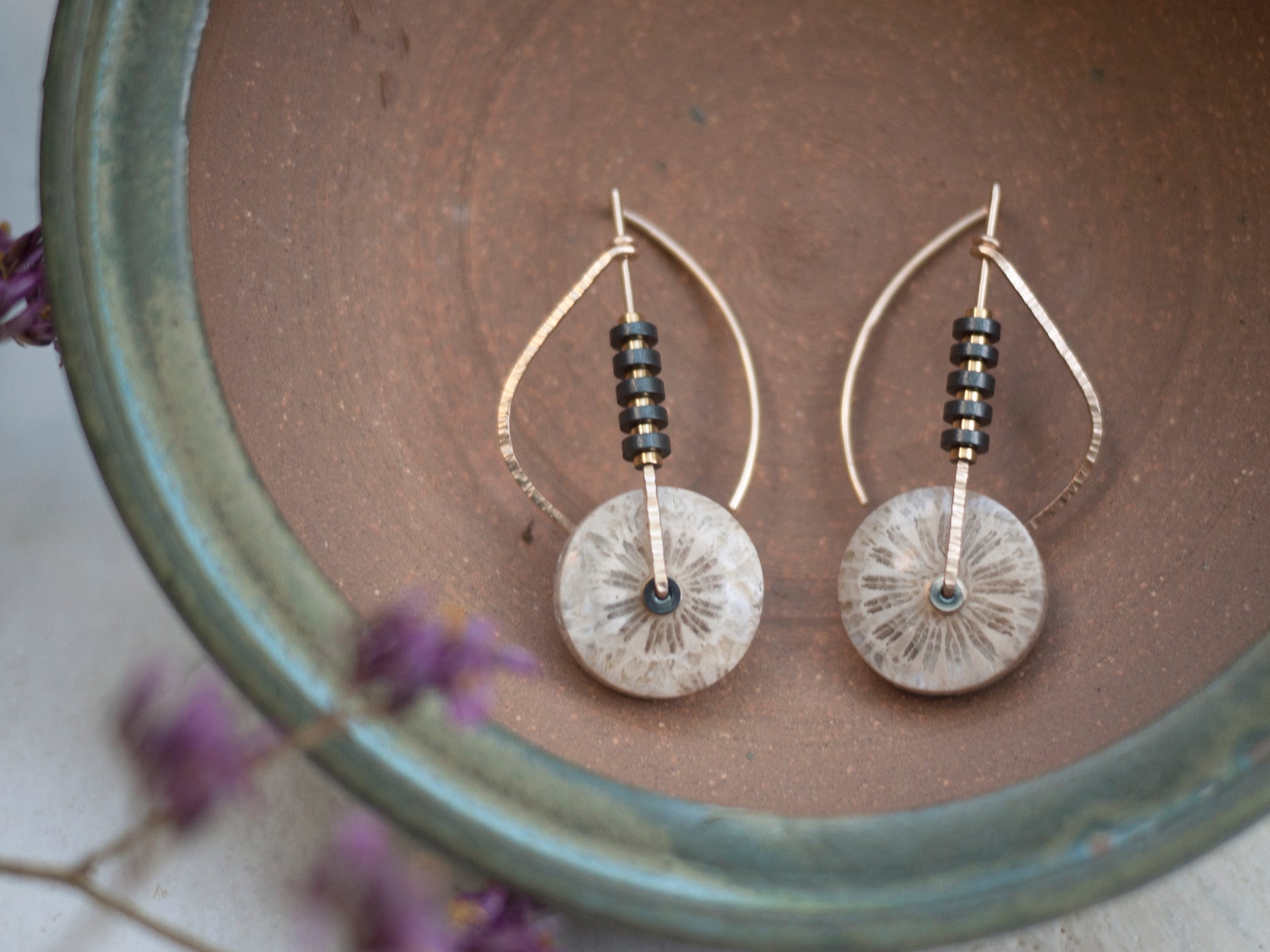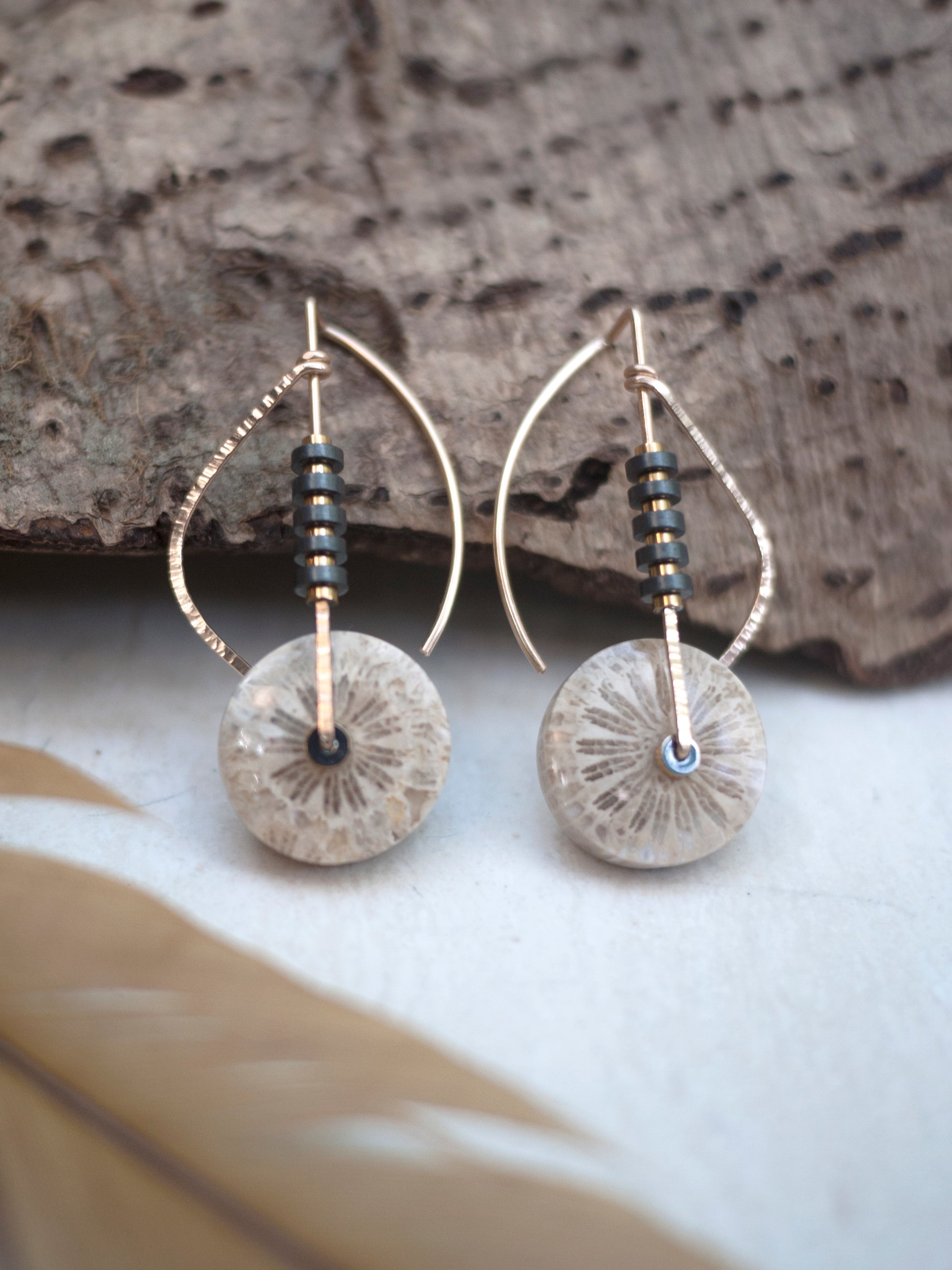 Wear a piece of natures past with these fossil coral earrings. Indonesian hand cut fossil coral beads are accented with intricate bent gold fill wire and matte grey and shiny gold hematite beads. The wire is hammered to give texture and sparkle. The curved ear wire adds sculptural interest to these earrings. Comes with rubber backings.