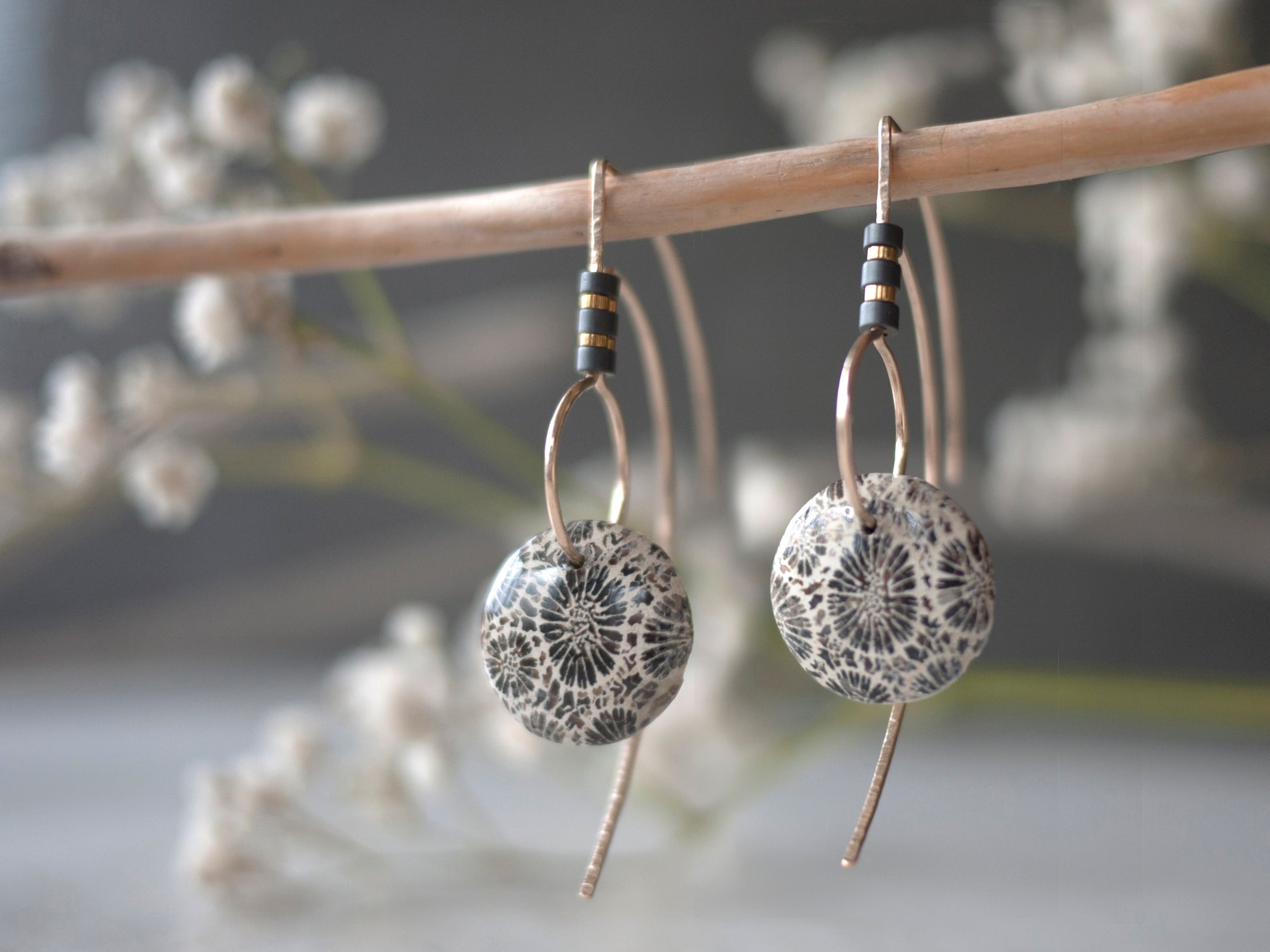 The flower like pattern on these fossilized coral beads gives them a classic sophistication. The gold fill wire is uniquely formed making these earrings look good from every angle.