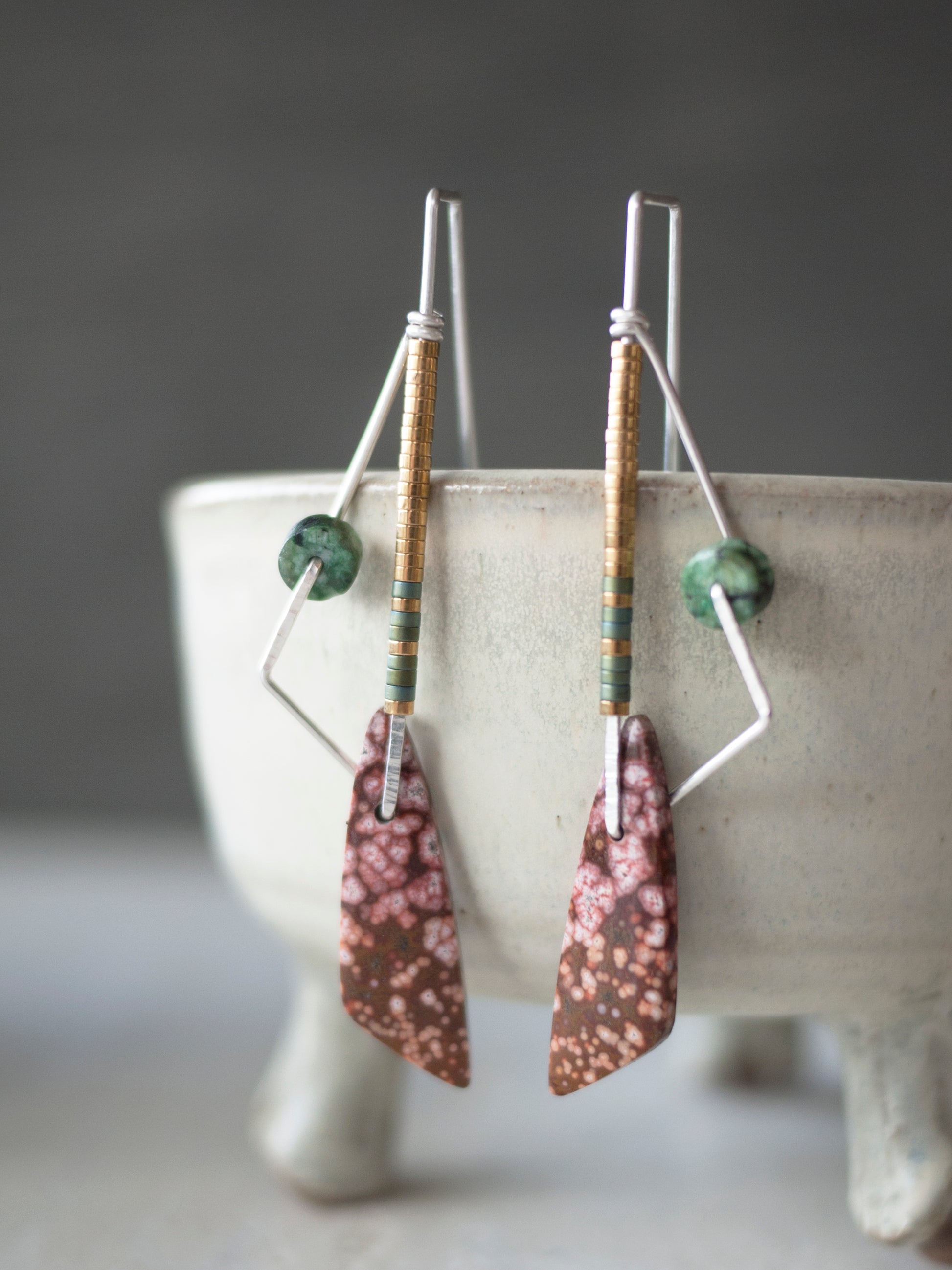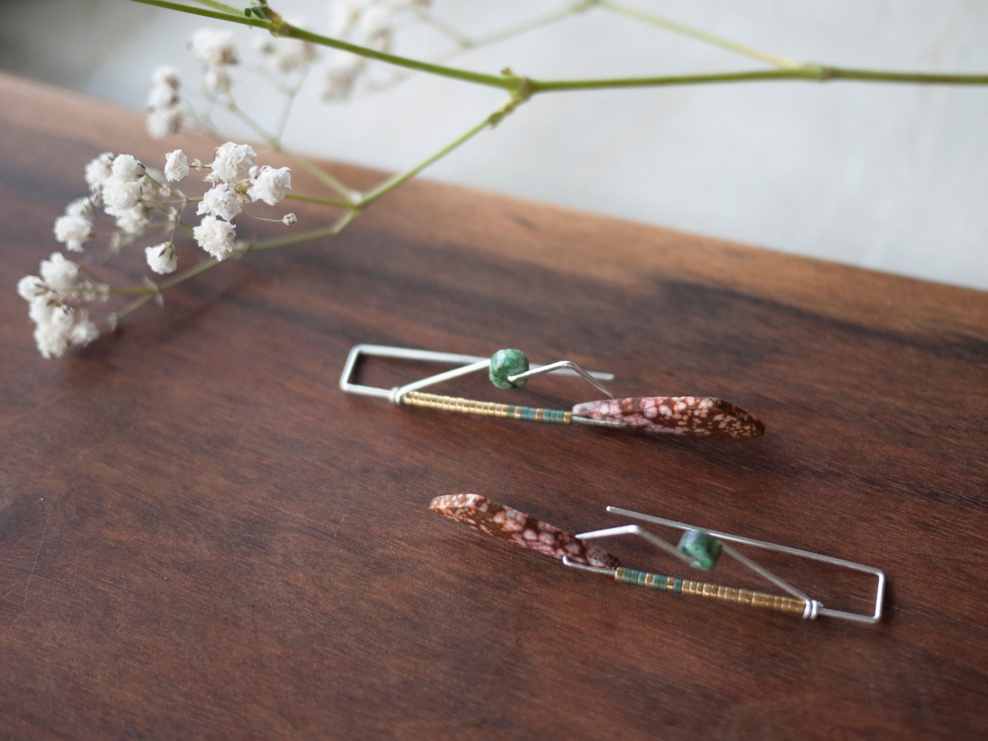 These beautiful specimens are a beautiful mix of pinks and browns. They hang from sterling silver wire, embellished with hematite and African turquoise beads. The ear wire is long and more interest in their form.