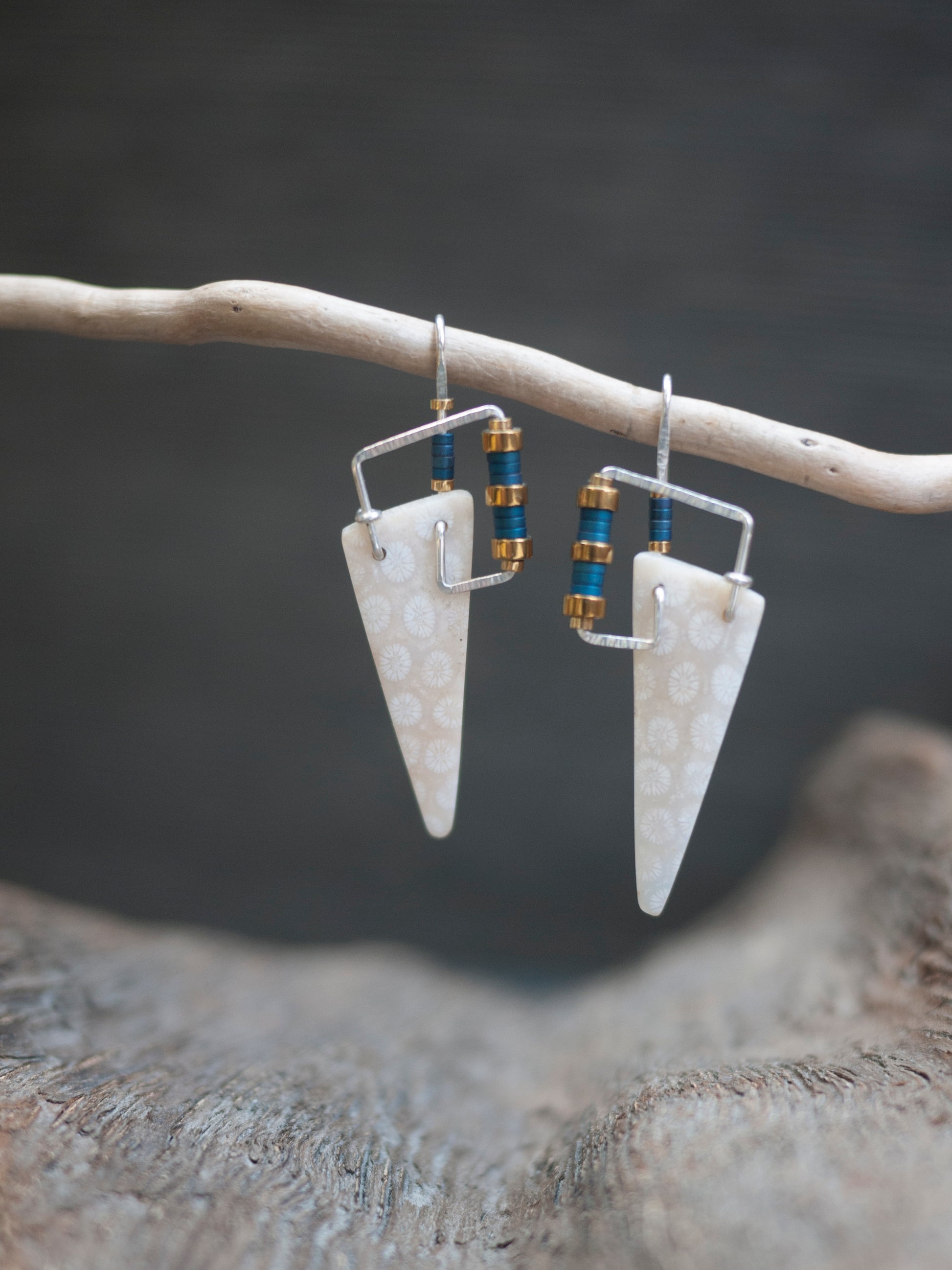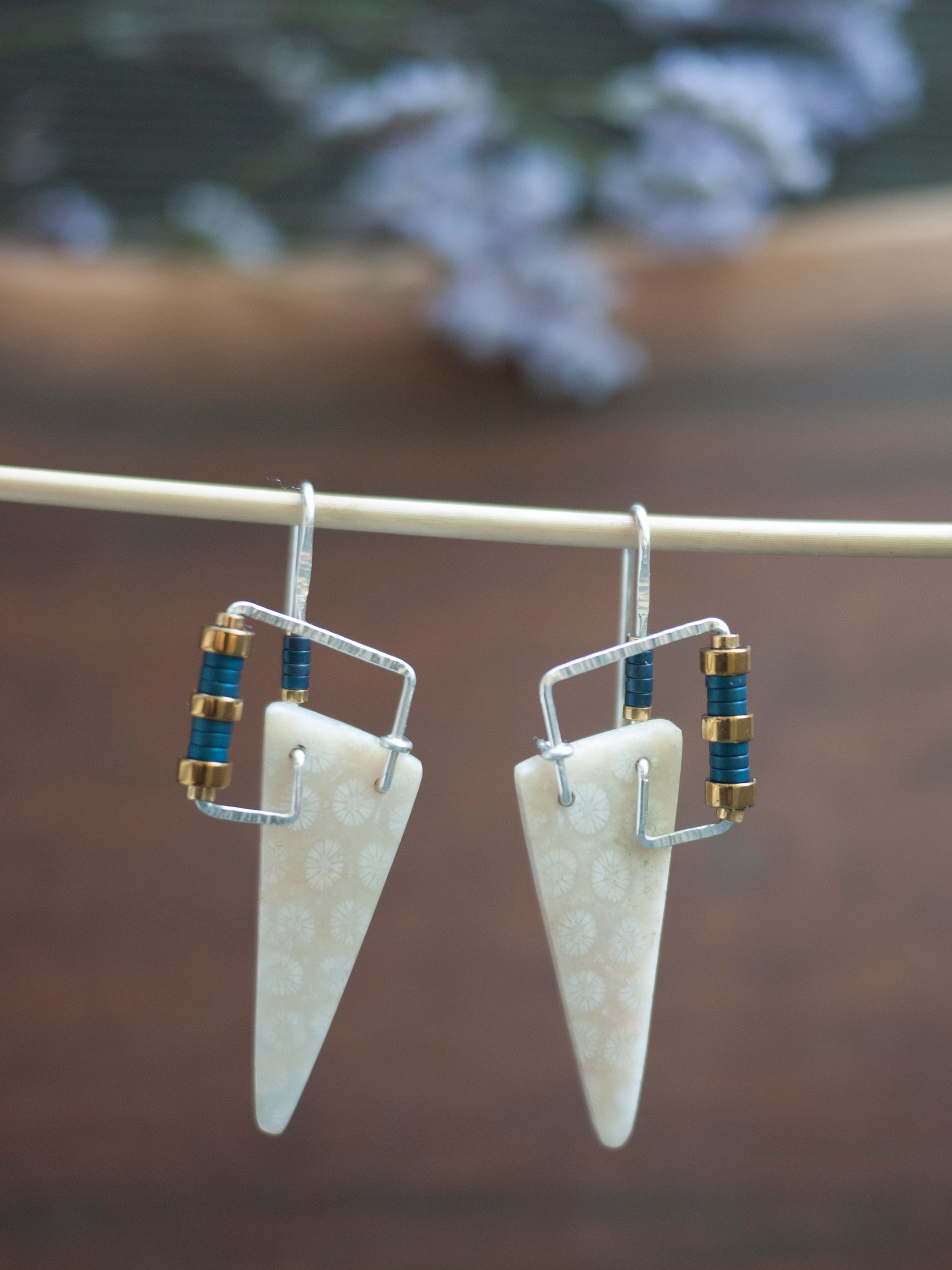 Wear a piece of natures past with these fossil coral earrings. Indonesian hand cut fossil coral stones are accented with intricate bent solid sterling silver wire and blue and gold hematite beads. Earrings come with rubber backings.