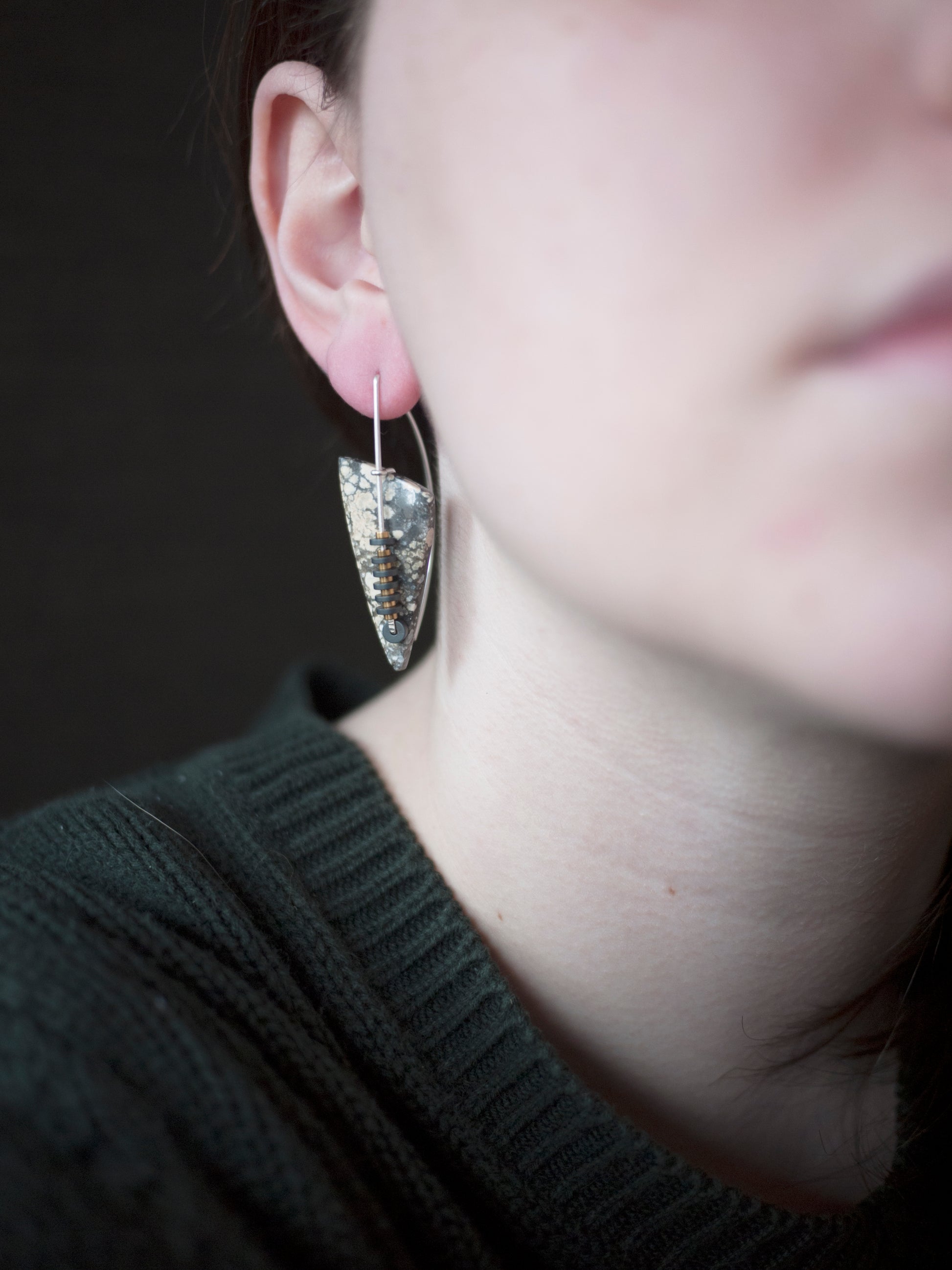 These beautiful magnesite stones were hand cut for my designs in a collaboration with a lapidary artist from Indonesia. Sterling silver wire creates an arched ear wire. A line of hematite beads on the front of the stone add sculptural interest. The wire is adorned with gold and grey hematite beads. Earrings come with rubber backings.