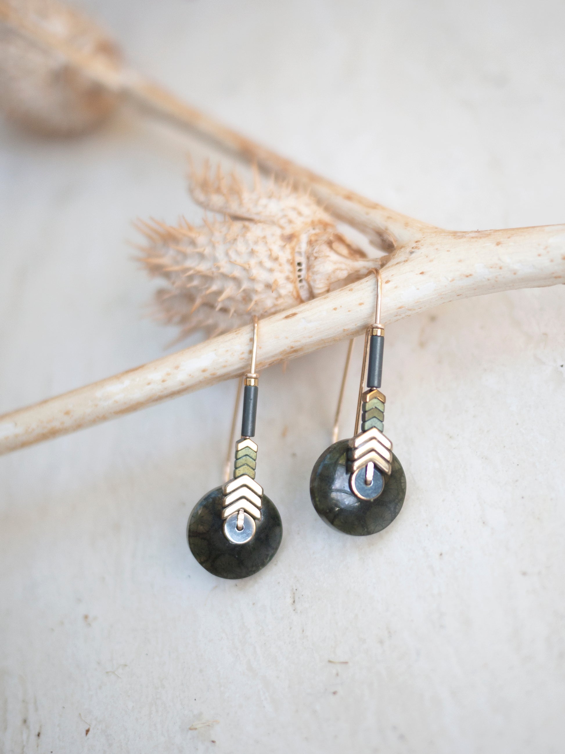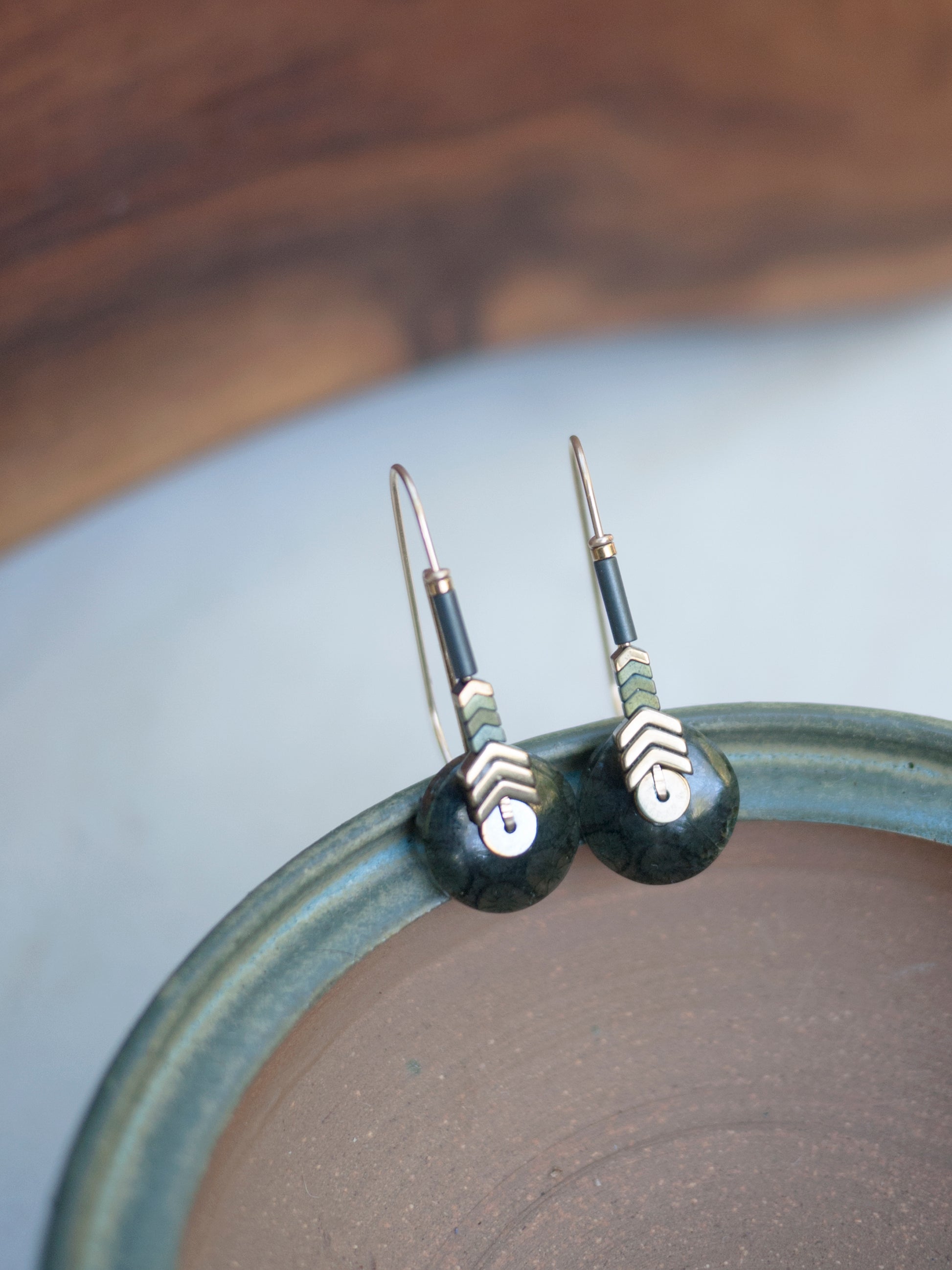 These unique fossilized coral are a rich green tone. The wire is embellished with a pattern of chevron shaped of hematite beads in green and gold. Portions of the wire are hammered to add sparkle. The ear wire has a curved form that incorporates into the design. Earrings come with rubber backings.