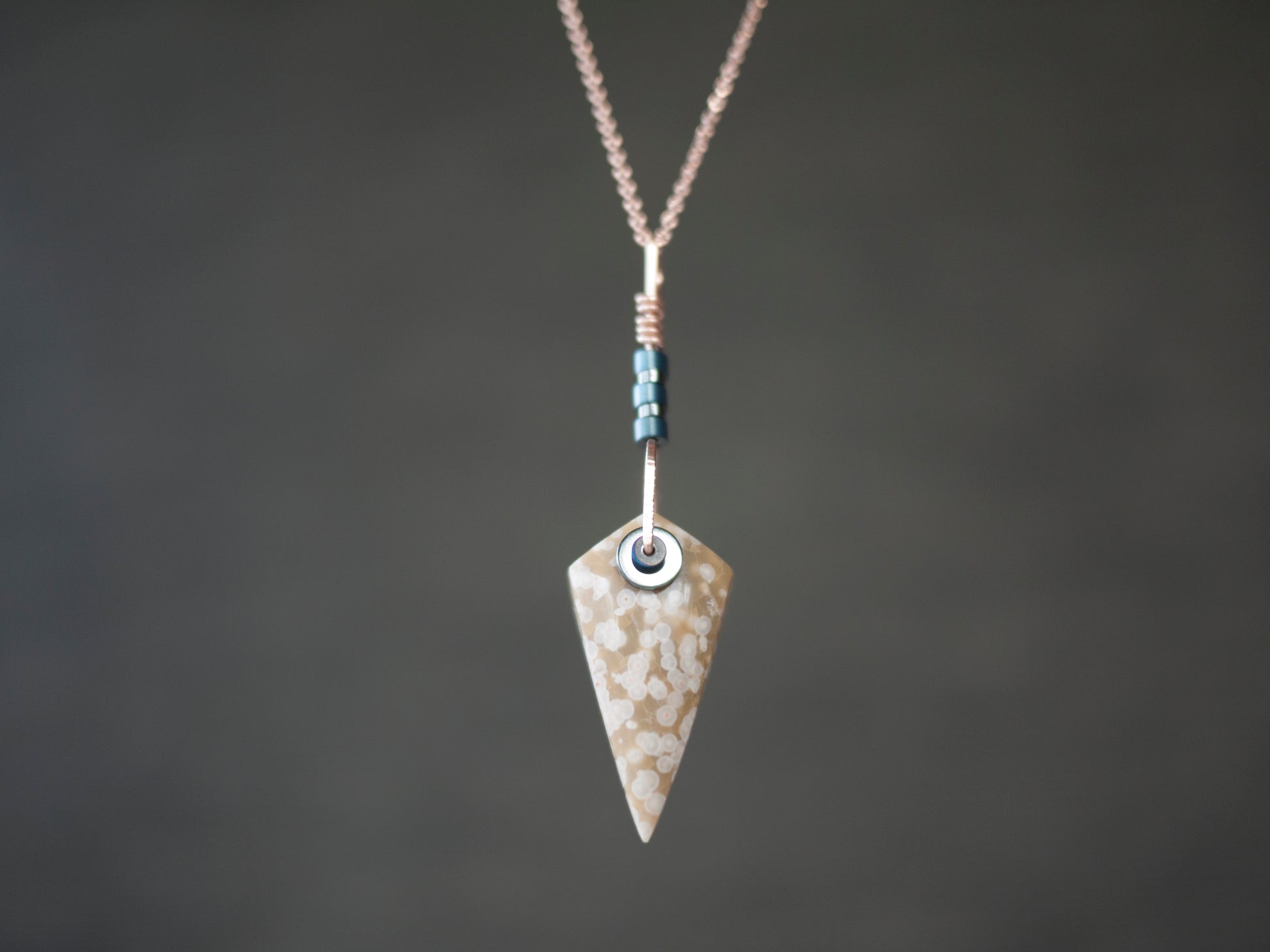Made from yellow gold filled wire and hematite beads. A beautiful speckled hand cut ocean jasper bead hangs from hand formed wire. The wire has portions that are hammered to give the pendant a unique combo of textured and smooth. The wire is adorned with different hematite beads for this unusual look.