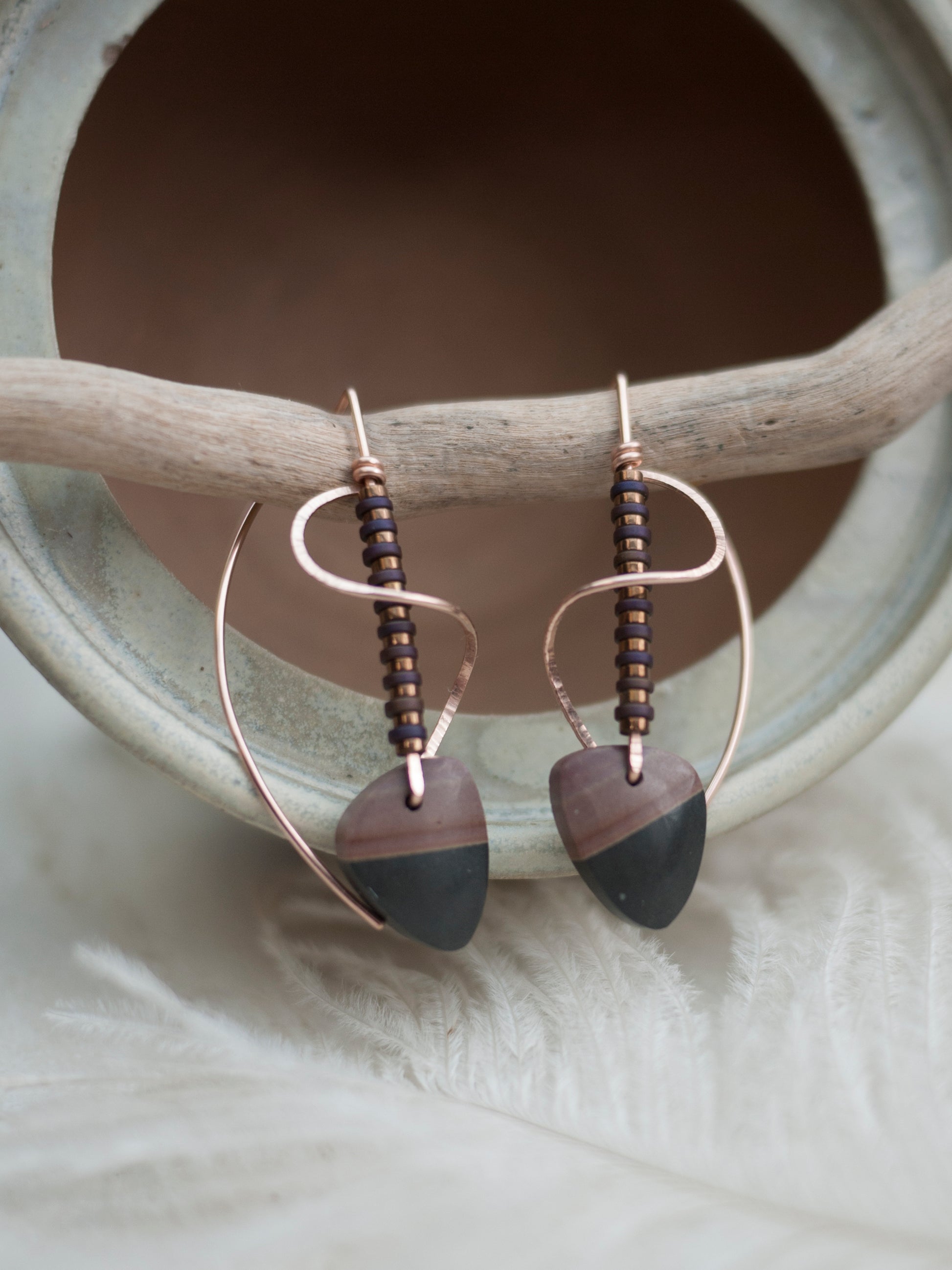 These earrings are unique in form. The unique hand cut polychrome jasper beads dangle from rose gold fill spirals and adorned with copper and purple colored hematite beads. The ear wires are long and add intrigue to the design. Earrings come with rubber backings.