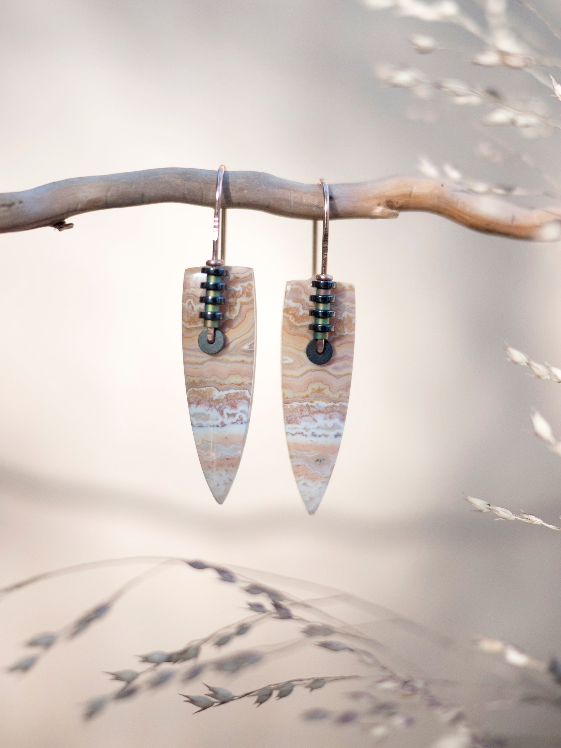 Made with rose gold fill wire. Hand cut lace agate stones are the centerpiece of these simple earrings. The wire has portions that are hammered to give the earrings a unique combo of textured and smooth. Adorned the wire are grey and rainbow colored hematite beads. These earrings come with rubber backings.