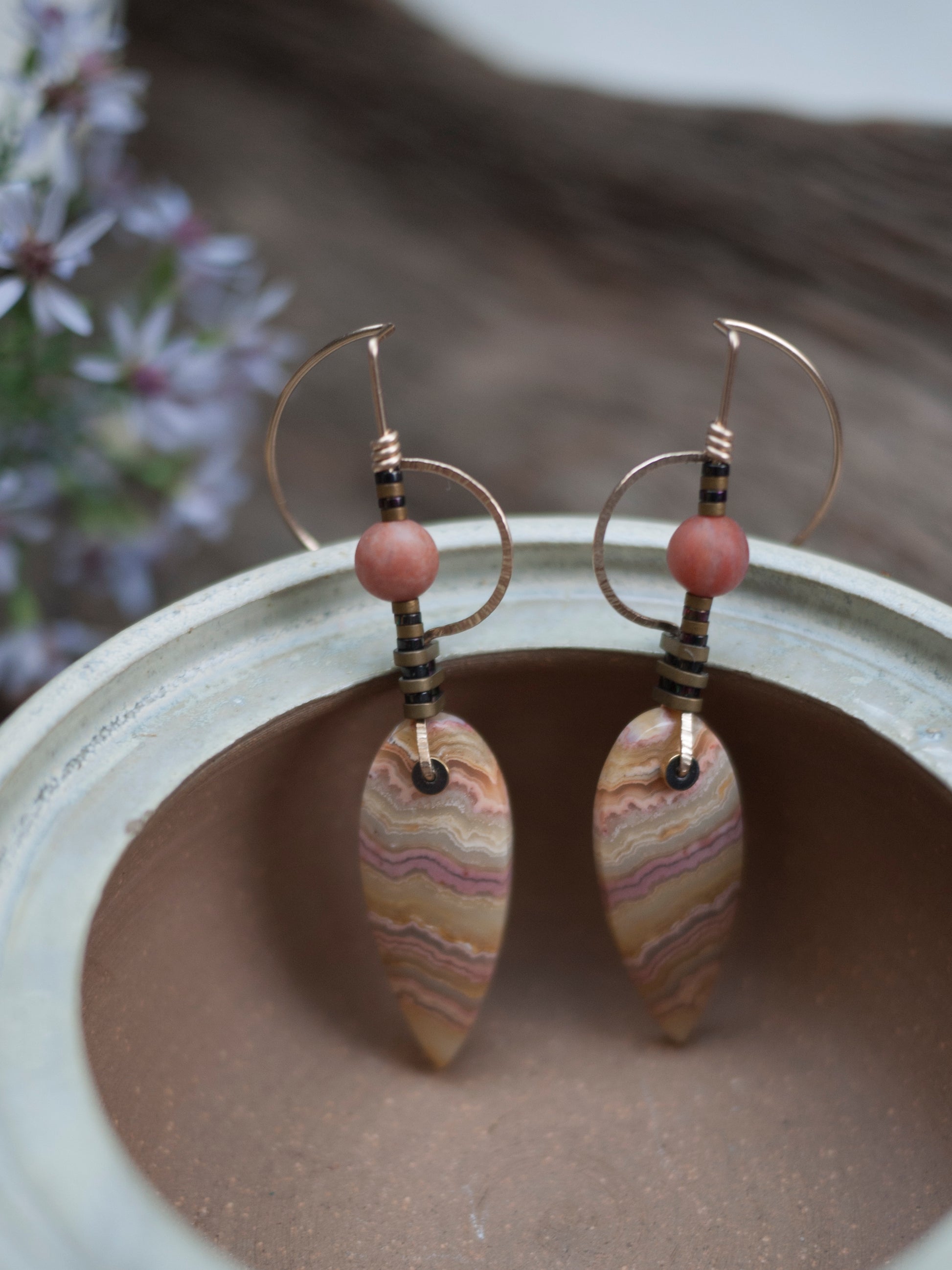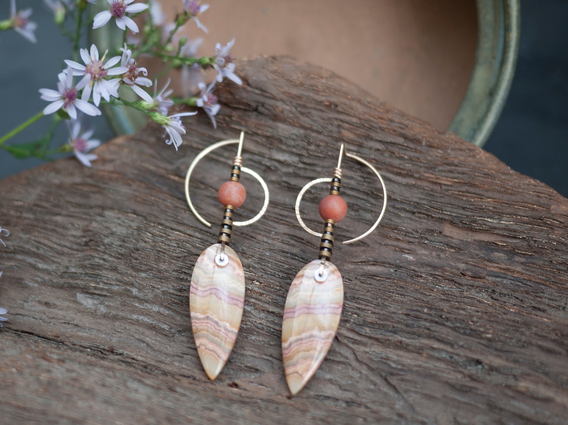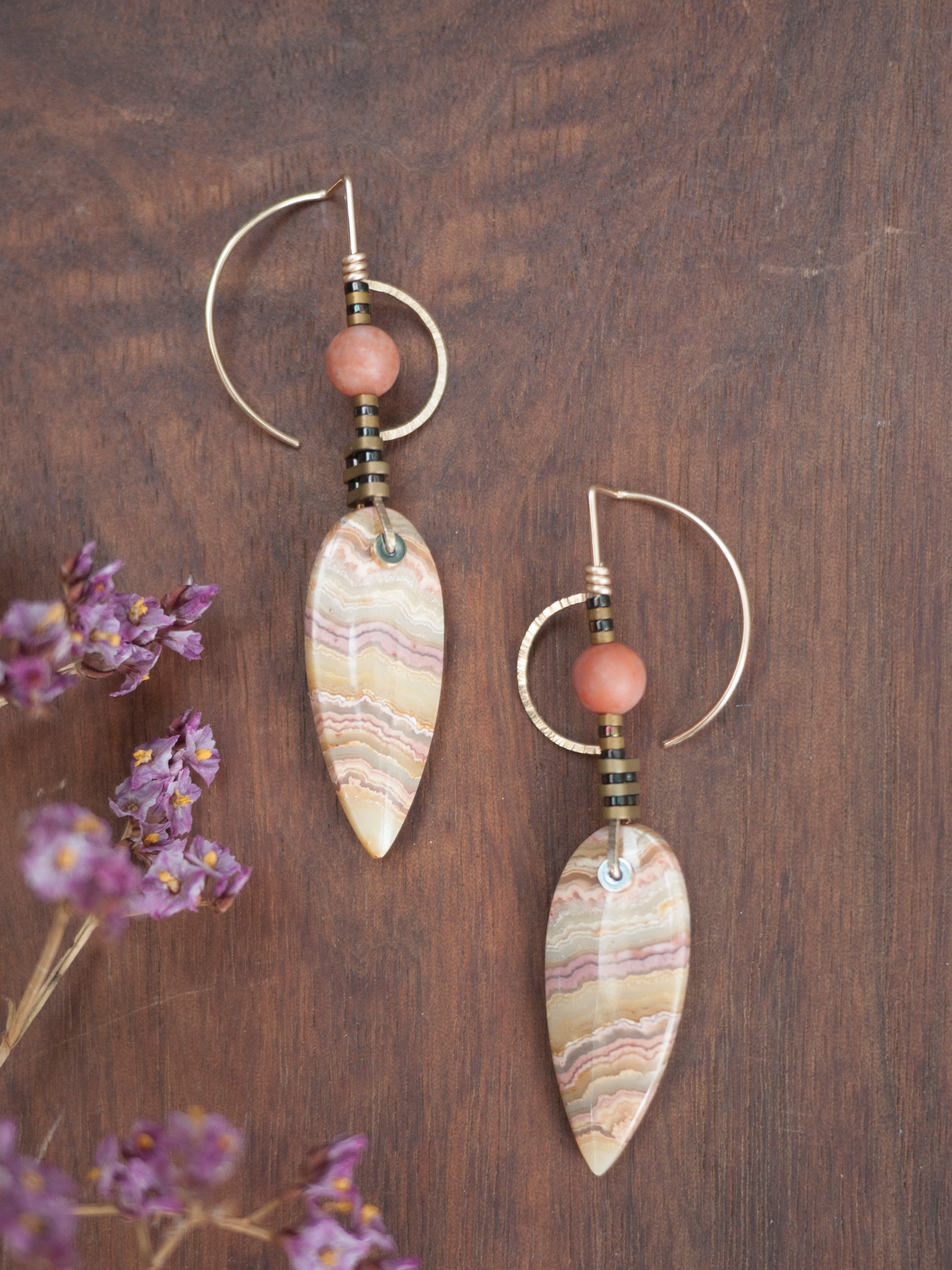 Made with gold fill wire, a hand cut lace agate stone are the centerpiece of these earrings. The wire has portions that are hammered to give the earrings a unique combo of textured and smooth. Adorning the wire are purple and gold hematite beads and pink jade. These earrings come with rubber backings.