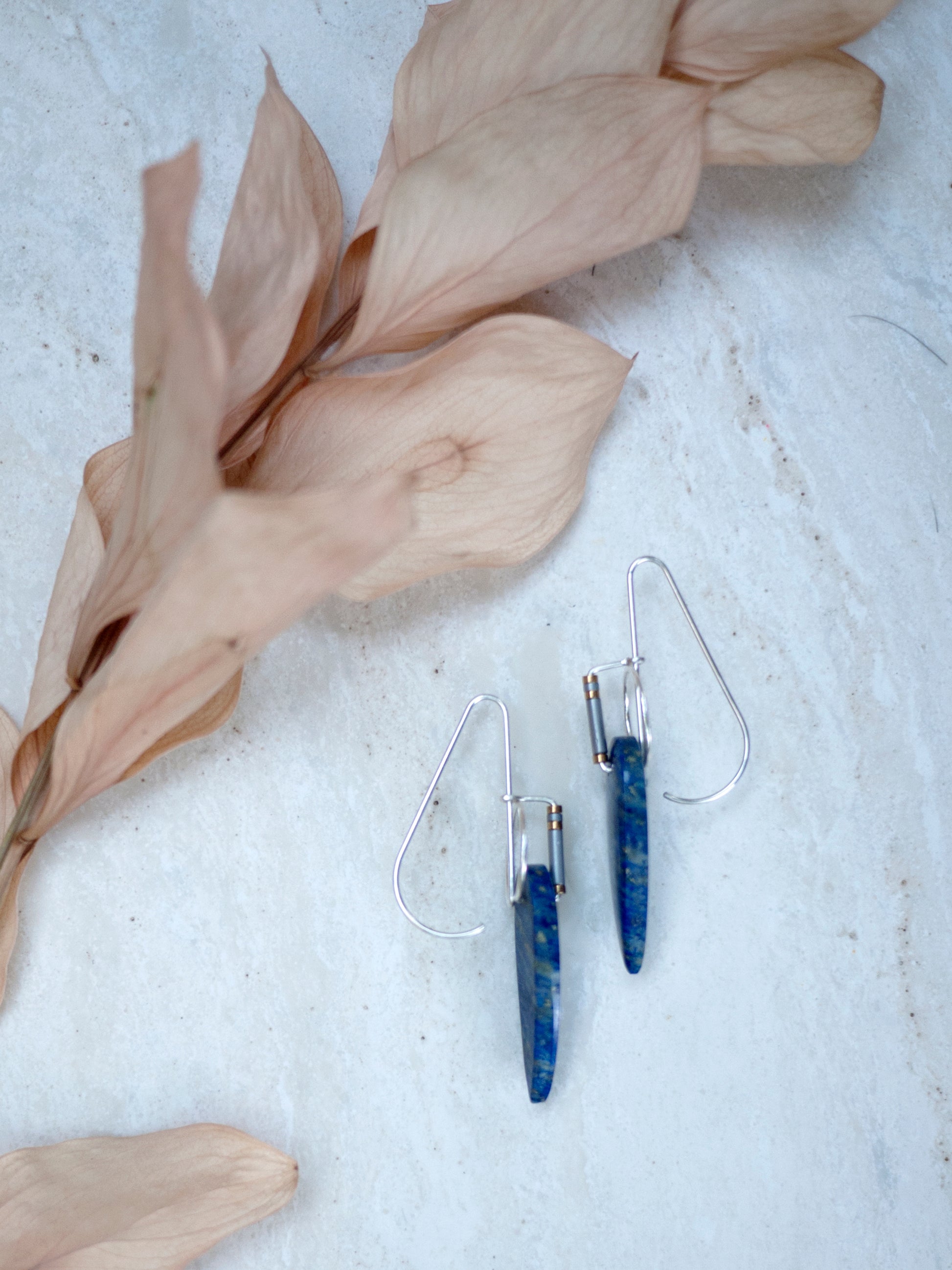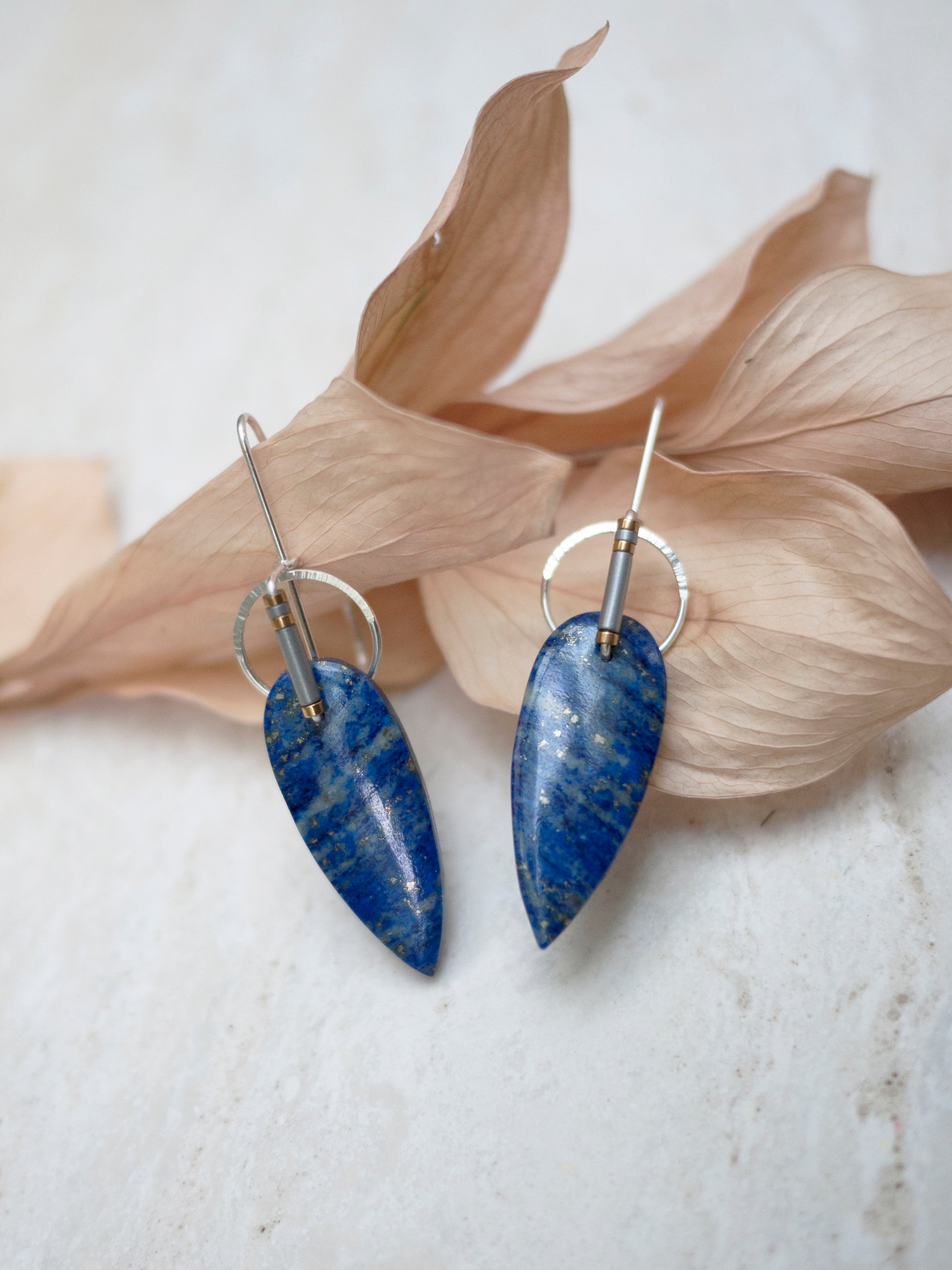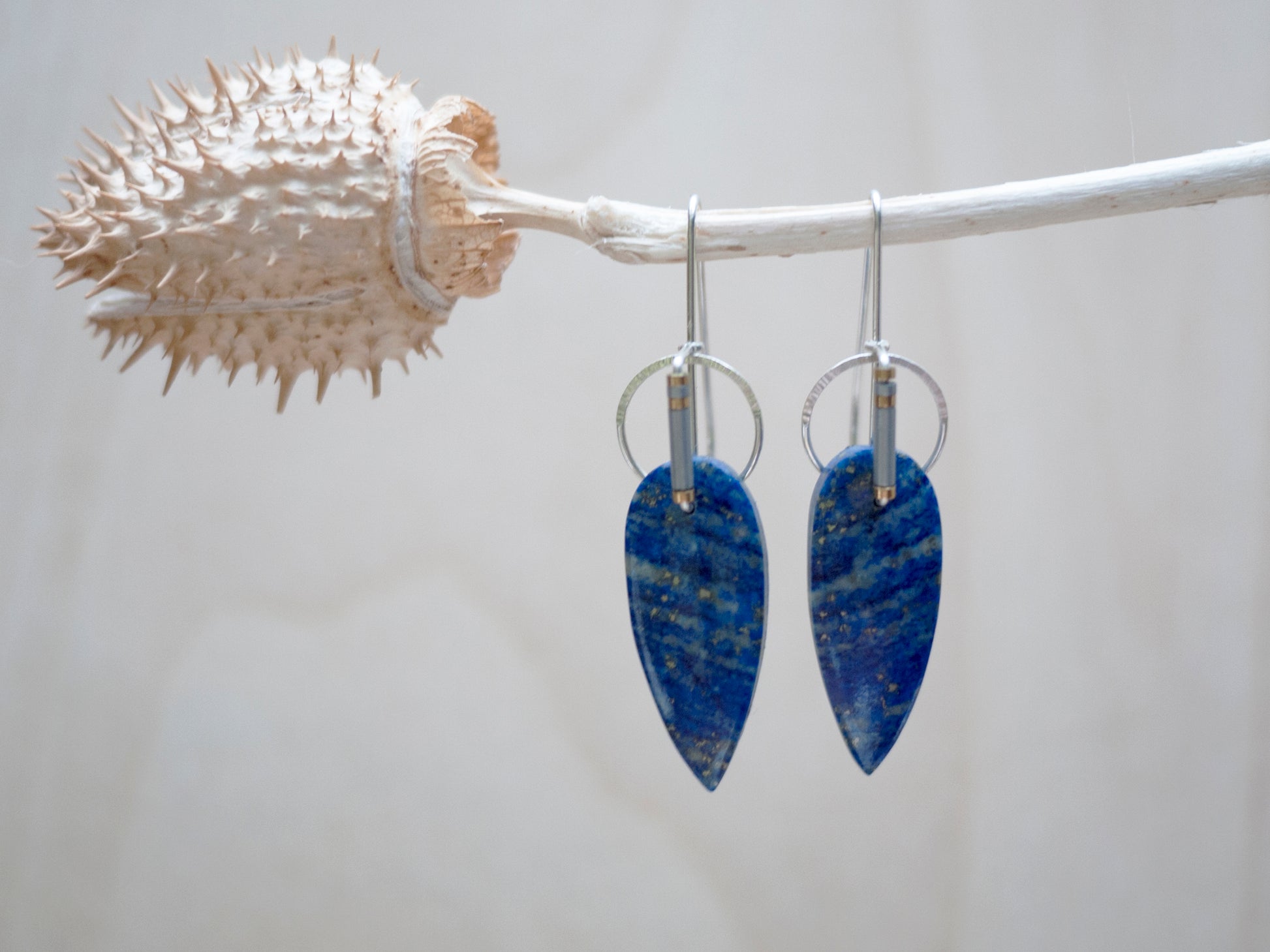 Lapis is one of my favorite stones to make into jewelry. It is one of the oldest stone materials used in jewelry making and I can see why. These stones' spear shape has been adorned with hand formed sterling silver wire. Silver and gold hematite beads adorn the wire. The wire circler is hammered to add sparkle and texture. These earrings come with rubber backings.