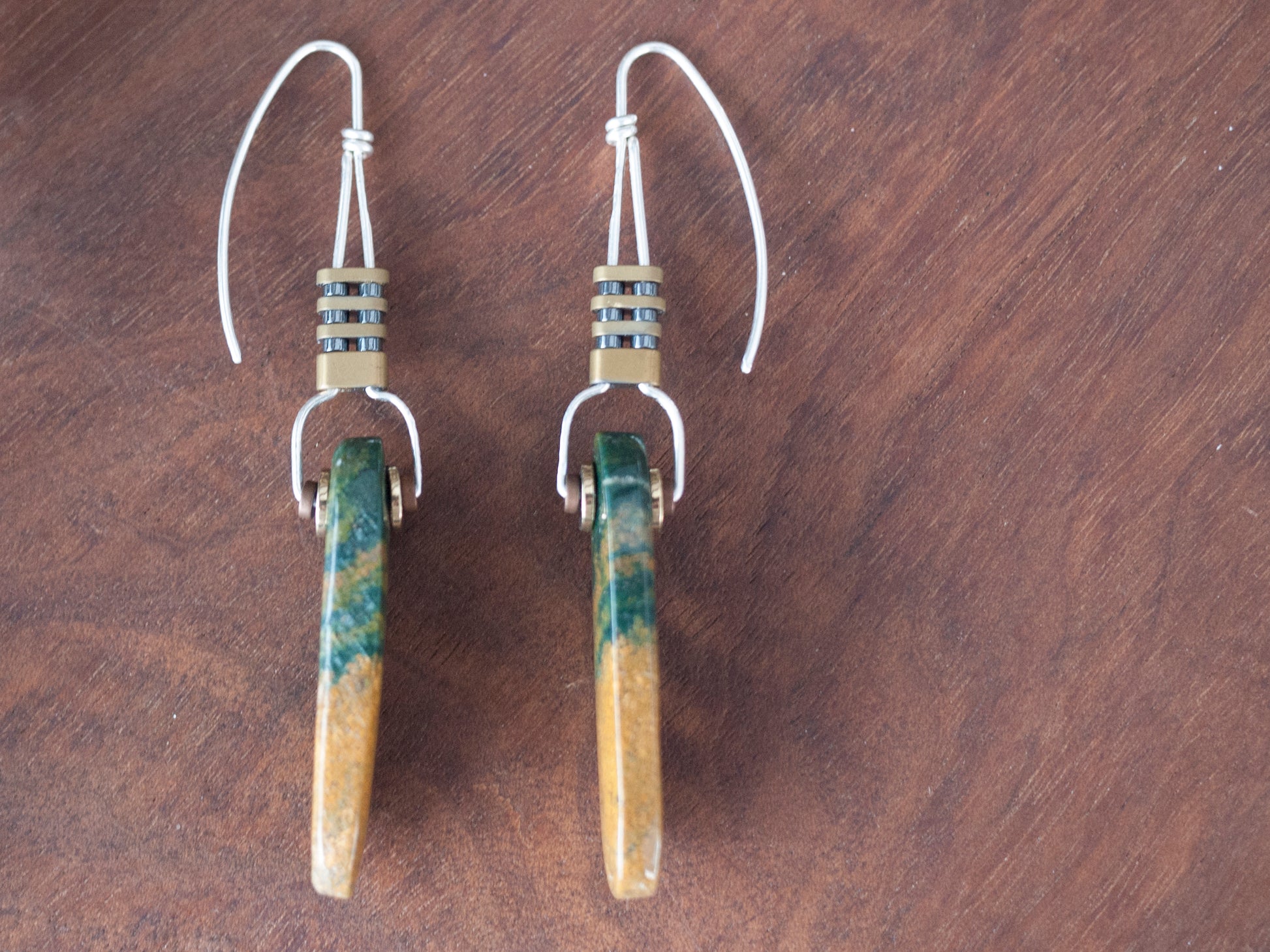 These colorful bloodstones are one of a kind hand cut pair from Indonesia. Adorned with hand formed solid sterling silver wire and hematite beads. The wire is hammered to add sparkle and texture. The long ear wires come with rubber backings to secure the earrings in place.