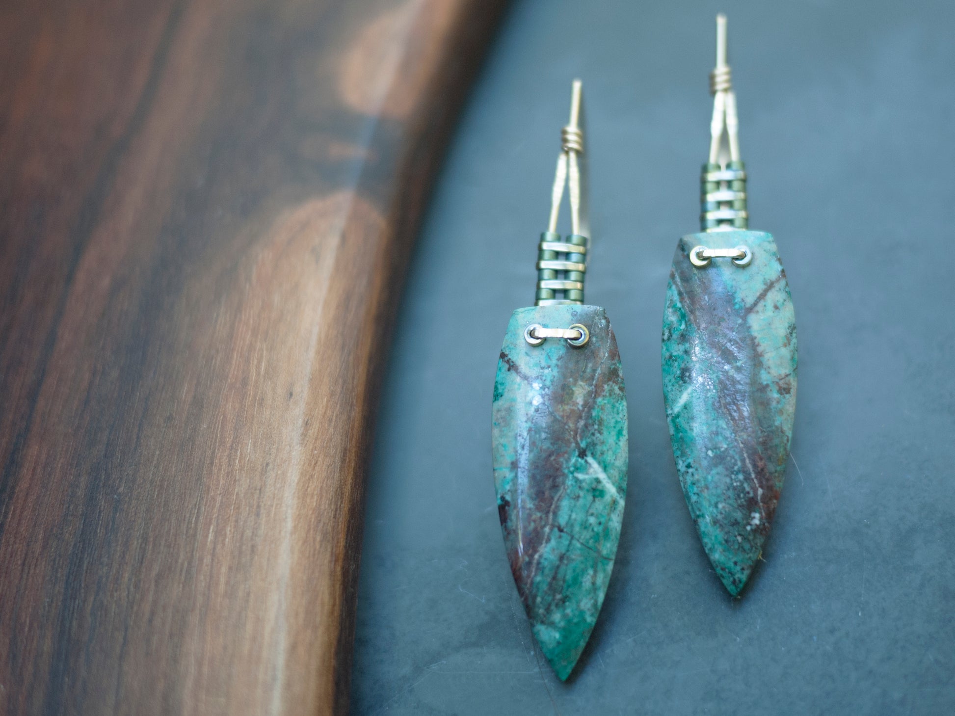 These beautiful chrysocolla stones were hand cut for my designs in a collaboration with a lapidary artist from Indonesia. Subtle accents of gold fill wire and hematite beads add a refined look to these earrings. These earrings have a long ear wire. All my earrings come with rubber backings.