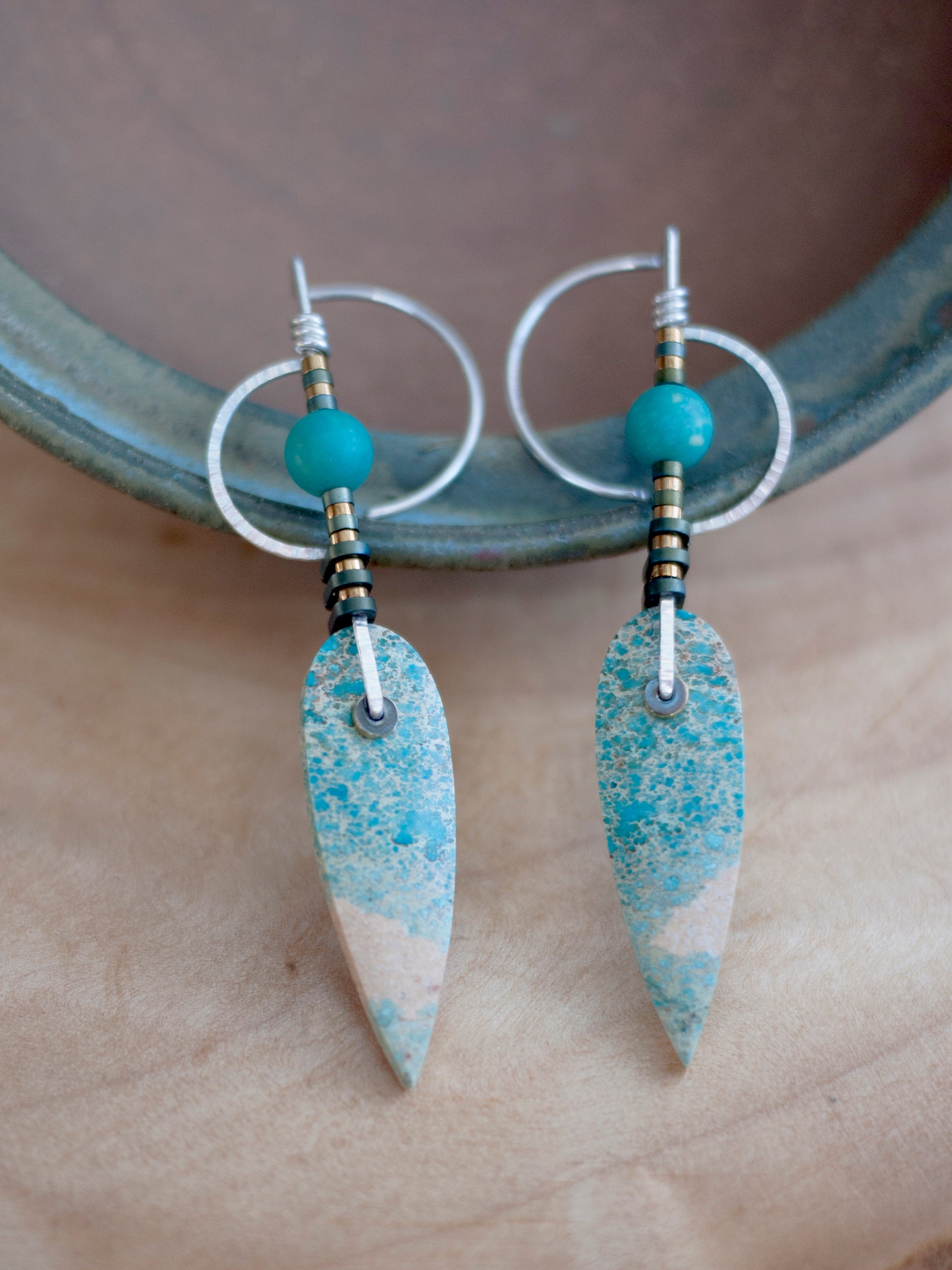 Soft cream and blue sea sediment jasper spear shaped beads are adorned with sterling silver wire and a pattern of gold and green hematite beads. The ear wire has a unique curved form. A turquoise bead adds an extra pop of aqua green. Earrings come with rubber backings.