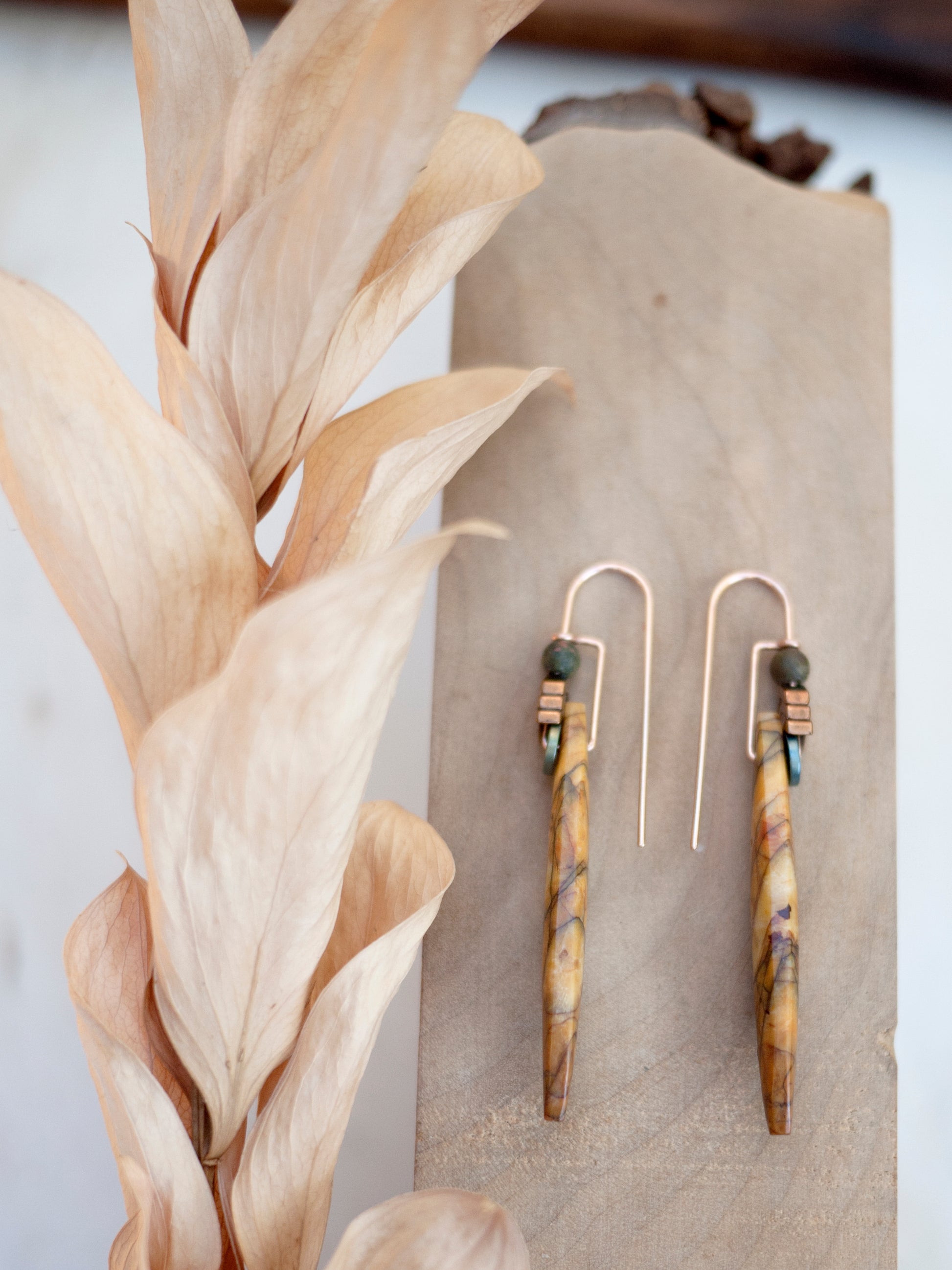 The combination of Picasso jasper and rose gold filled wire creates a beautiful earthy feel for these one-of-a-kind dangle earrings. Copper and dark grey colored hematite beads complement the hues in these unique stones.