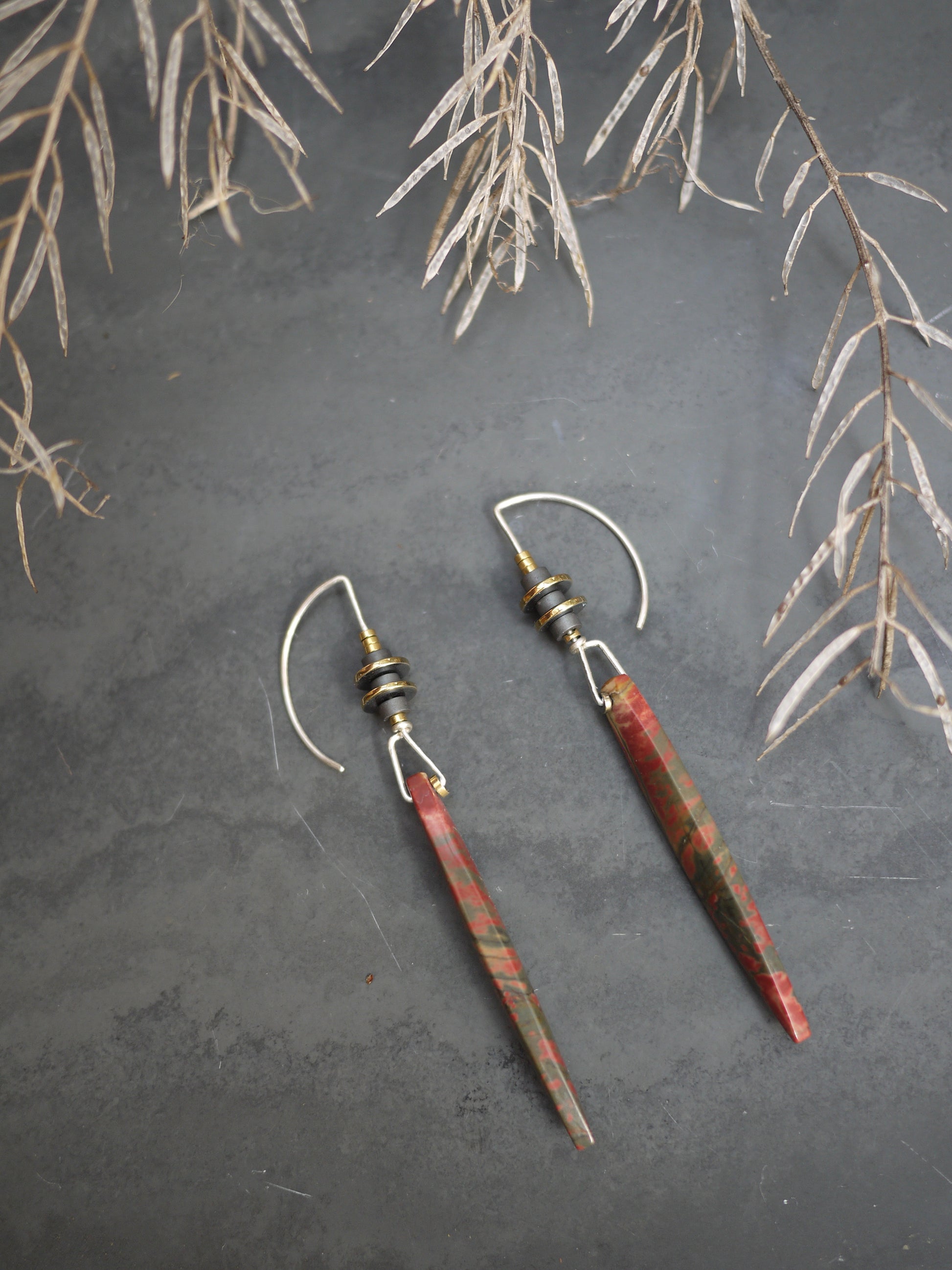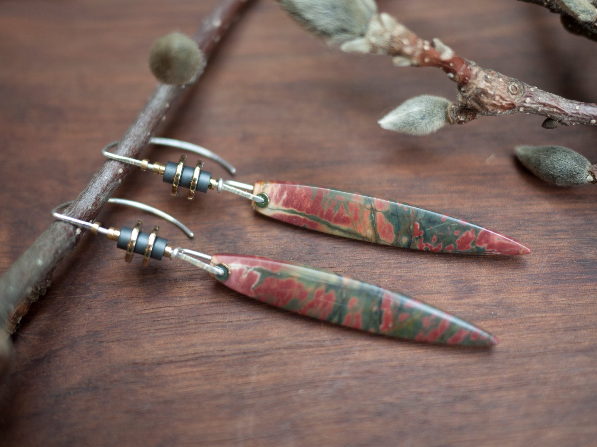 The combination of Picasso jasper and sterling silver wire creates a beautiful, earthy feel for these one-of-a-kind dangle earrings. Gold and dark grey hematite beads complement the hues in these unique stones.