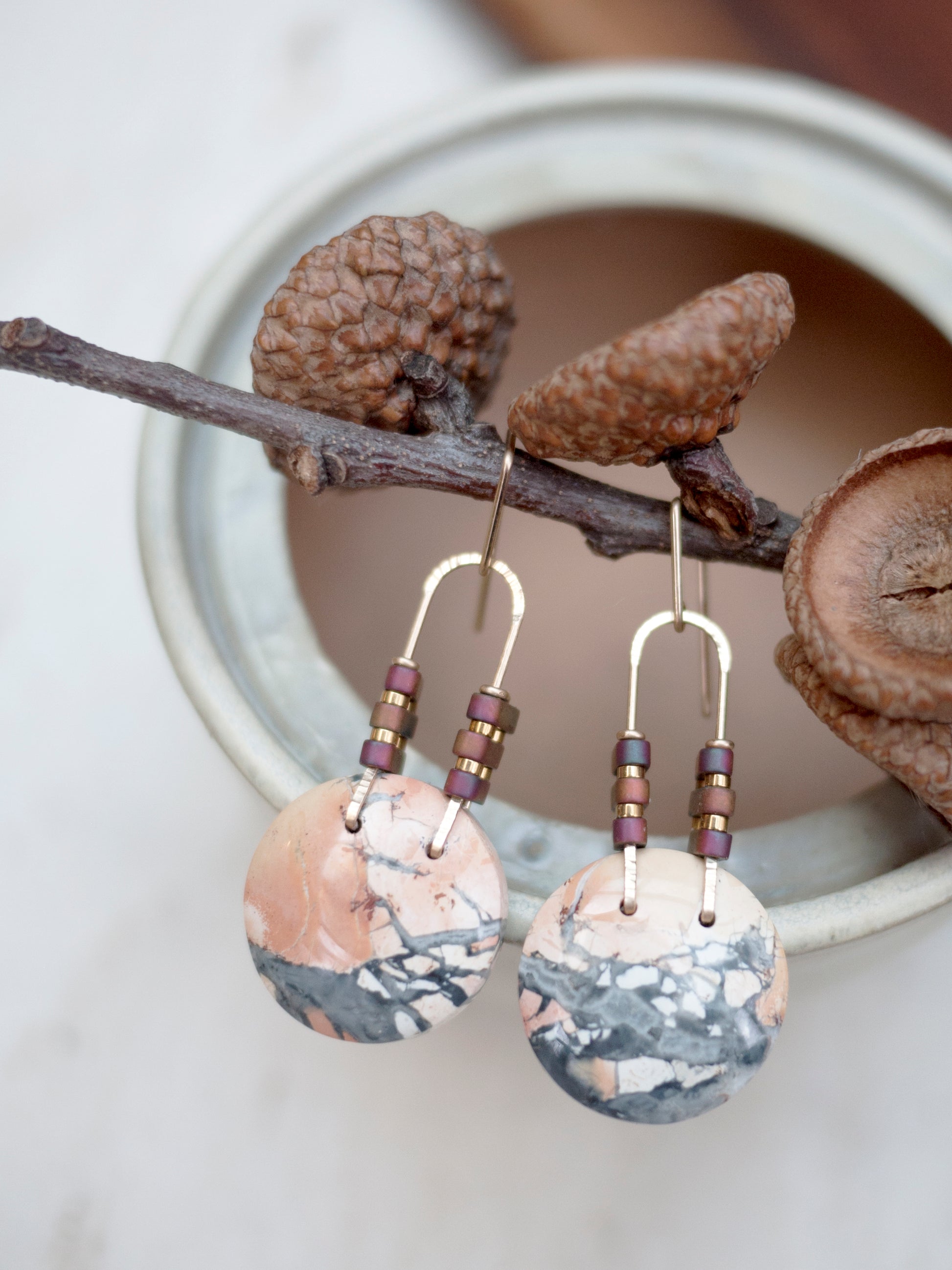 These beautiful maligano jasper stones were hand cut for my designs in a collaboration with a lapidary artist from Indonesia. An arch accent of yellow gold filled wire and hematite beads create an art deco style line pattern. Earrings dangle from hand made gold fill french hooks. Come with rubber backings