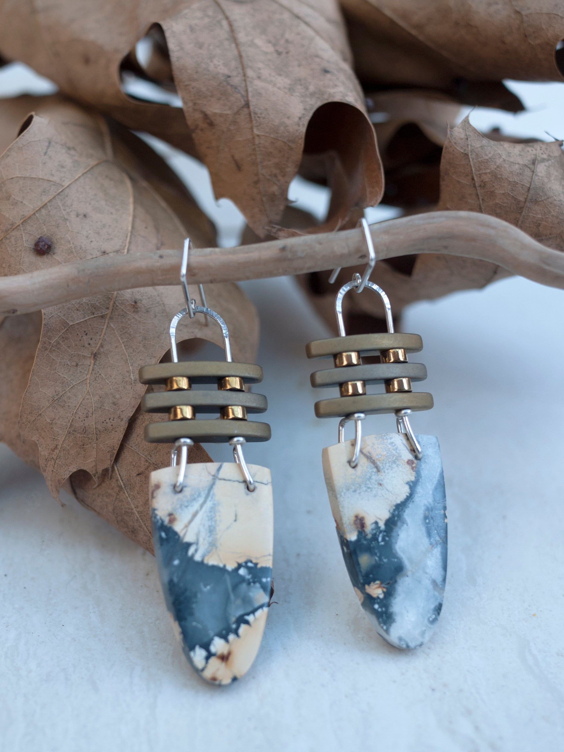 These beautiful maligano jasper stones were hand cut for my designs in a collaboration with a lapidary artist from Indonesia. An arch accent of sterling silver wire and hematite beads create an art deco style line pattern. The ear wires are solid sterling silver. Earrings come with rubber backings