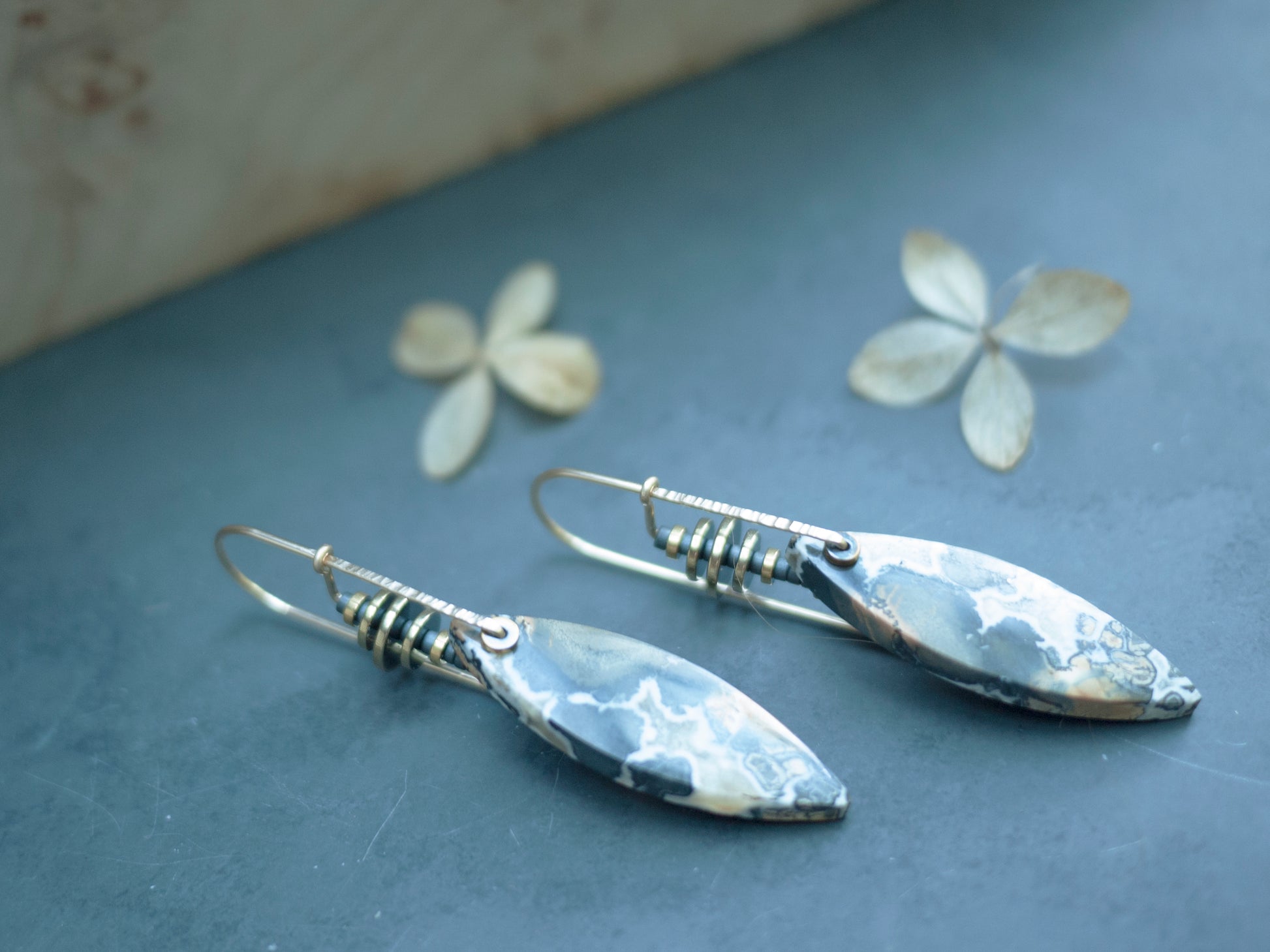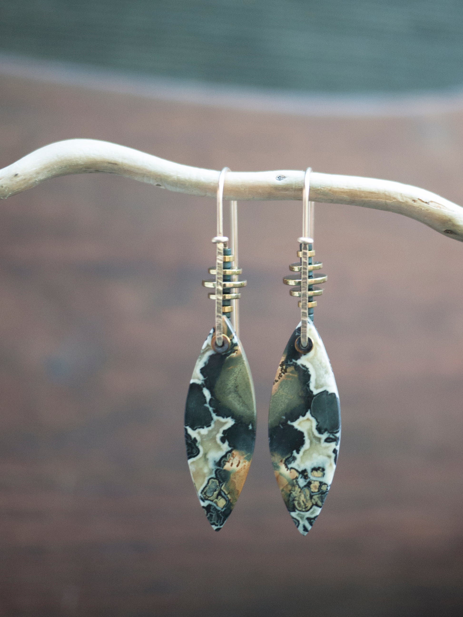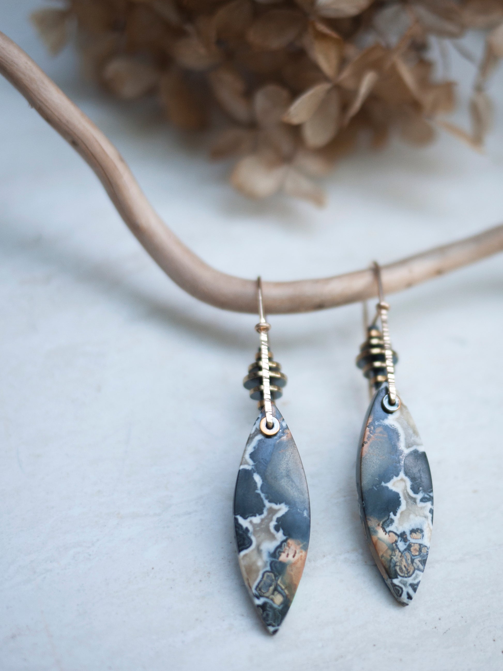 These beautiful Maligano jasper stones were hand cut for my designs in a collaboration with a lapidary artist from Indonesia. Accented with gold hematite disc beads. The ear wires have a unique arch to add dimension and form through the whole earring.