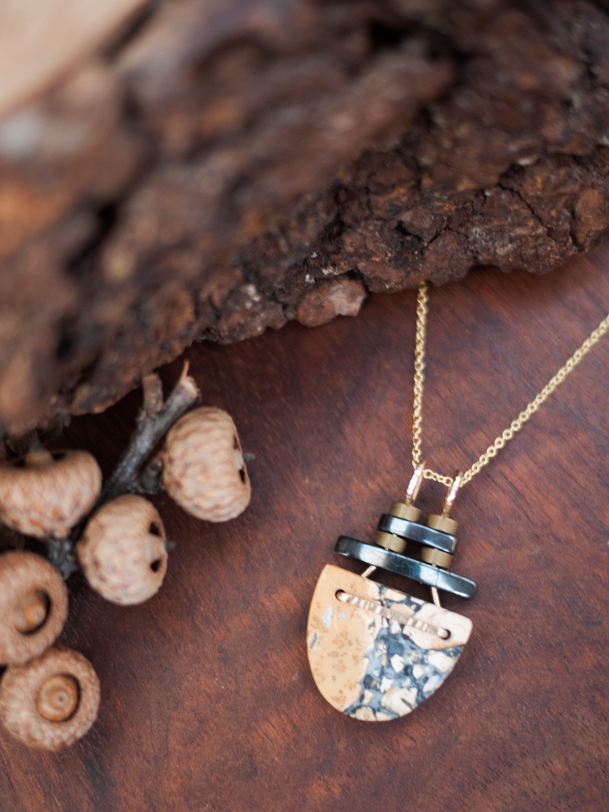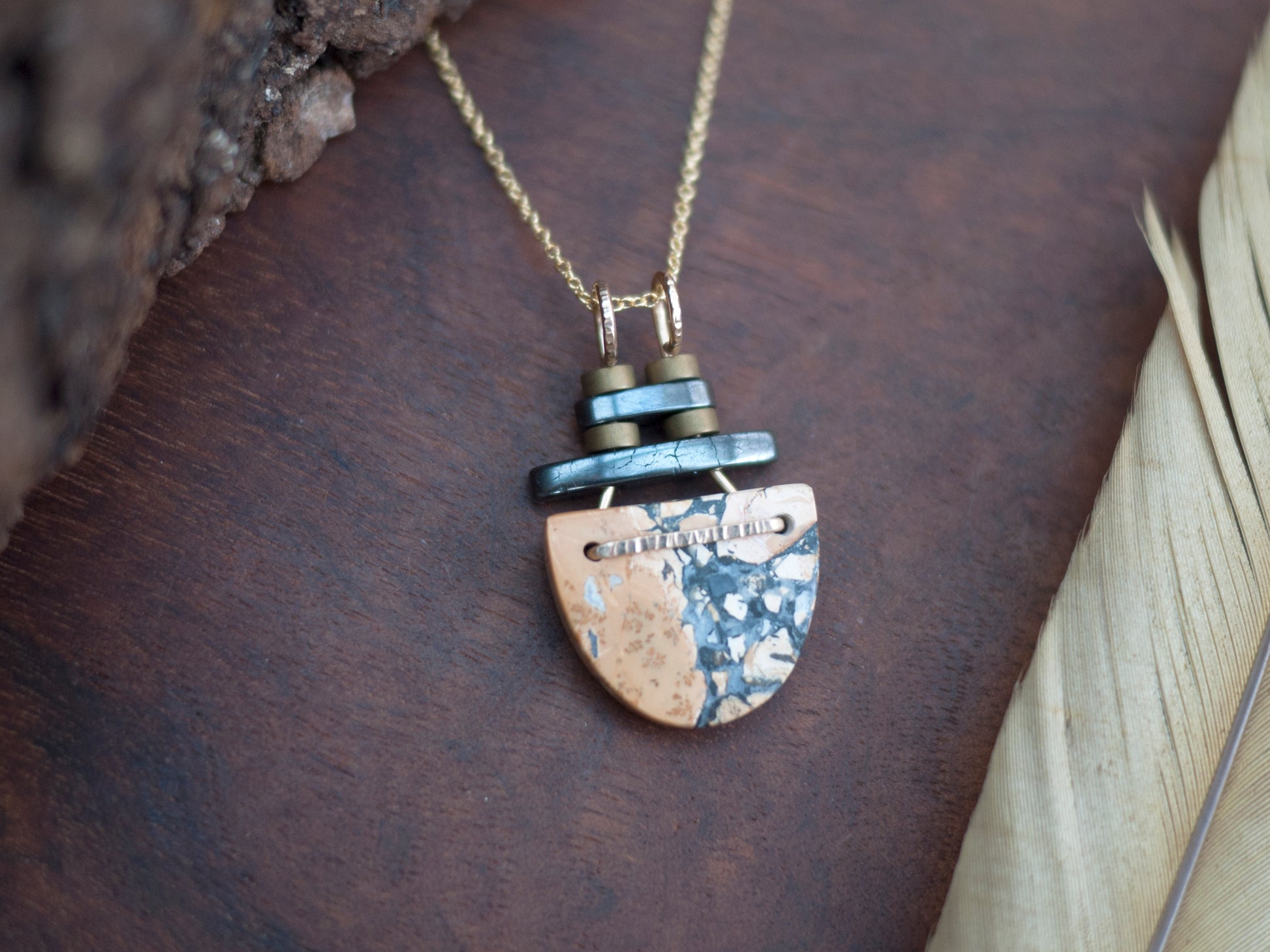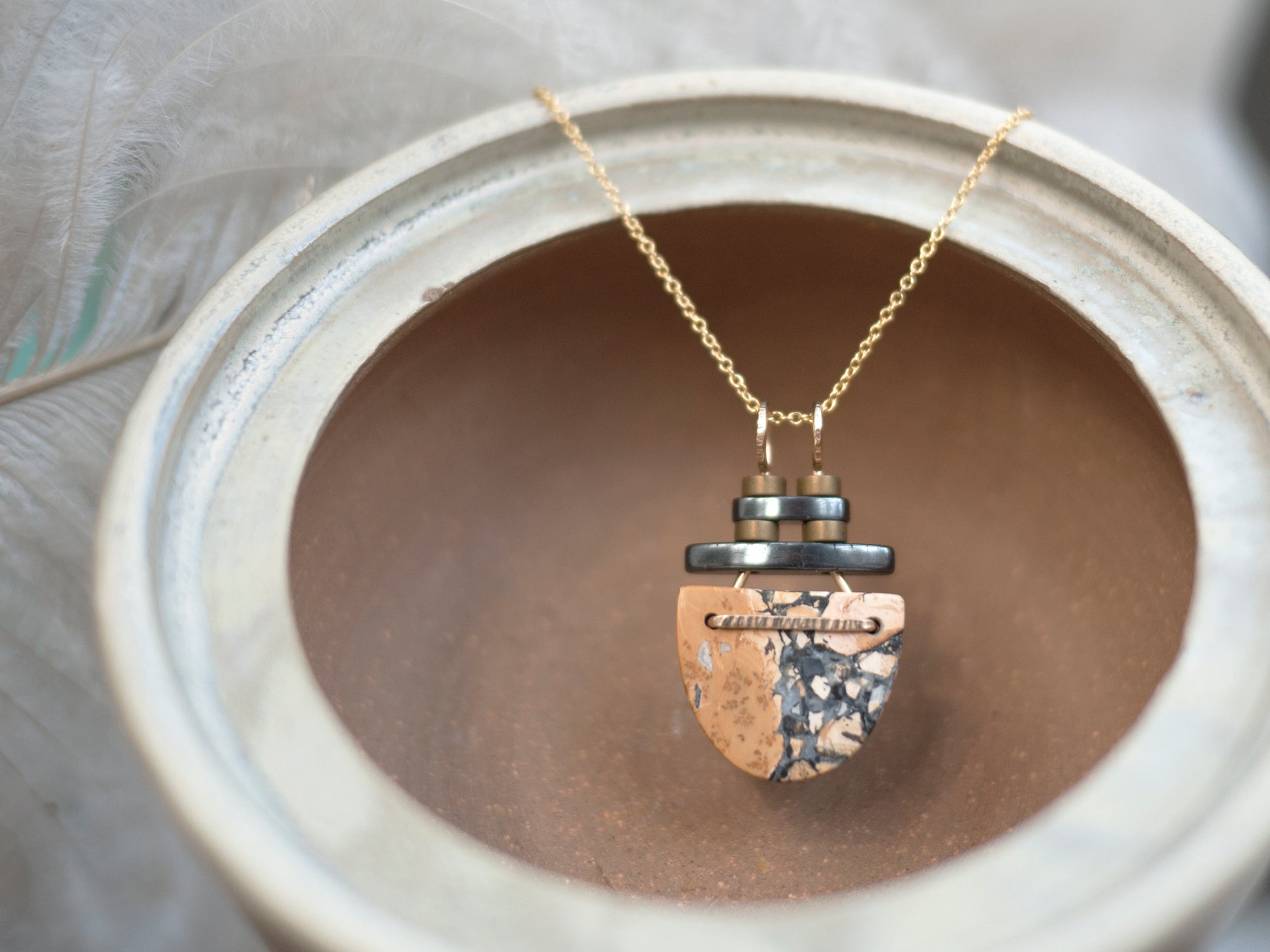 A custom cut maligano jasper bead hangs from hand formed 14k yellow gold filled wire. The wire is hammered to give the pendant a unique texture. The wire is adorned with a matte gold and grey hematite beads.