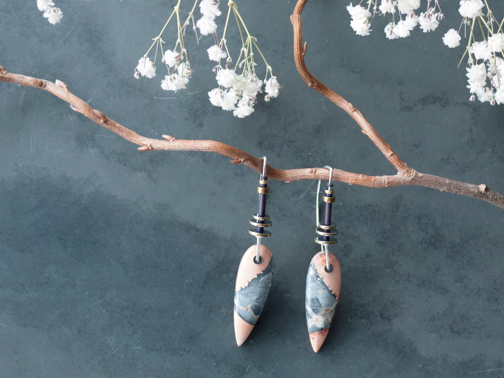 These beautiful Maligano jasper stones were hand cut for my designs in a collaboration with a lapidary artist from Indonesia. Accented with hematite beads in purple and gold. The ear wires have a unique arch to add dimension and form through the whole earring.