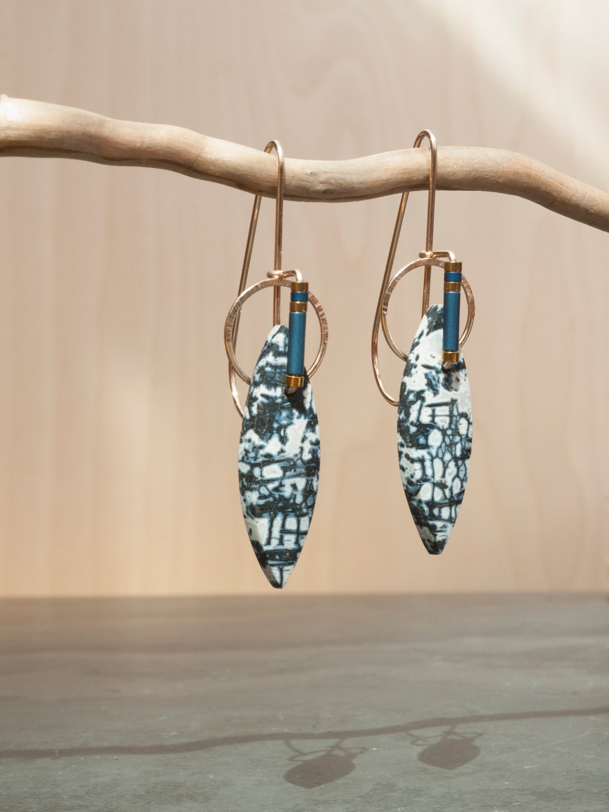 These petrified palm wood have a beautiful random pattern in blue/black and white. The yellow gold fill wire has a unique curve to the ear wire which make these earrings interesting front to back. The ear wires come with rubber backings.