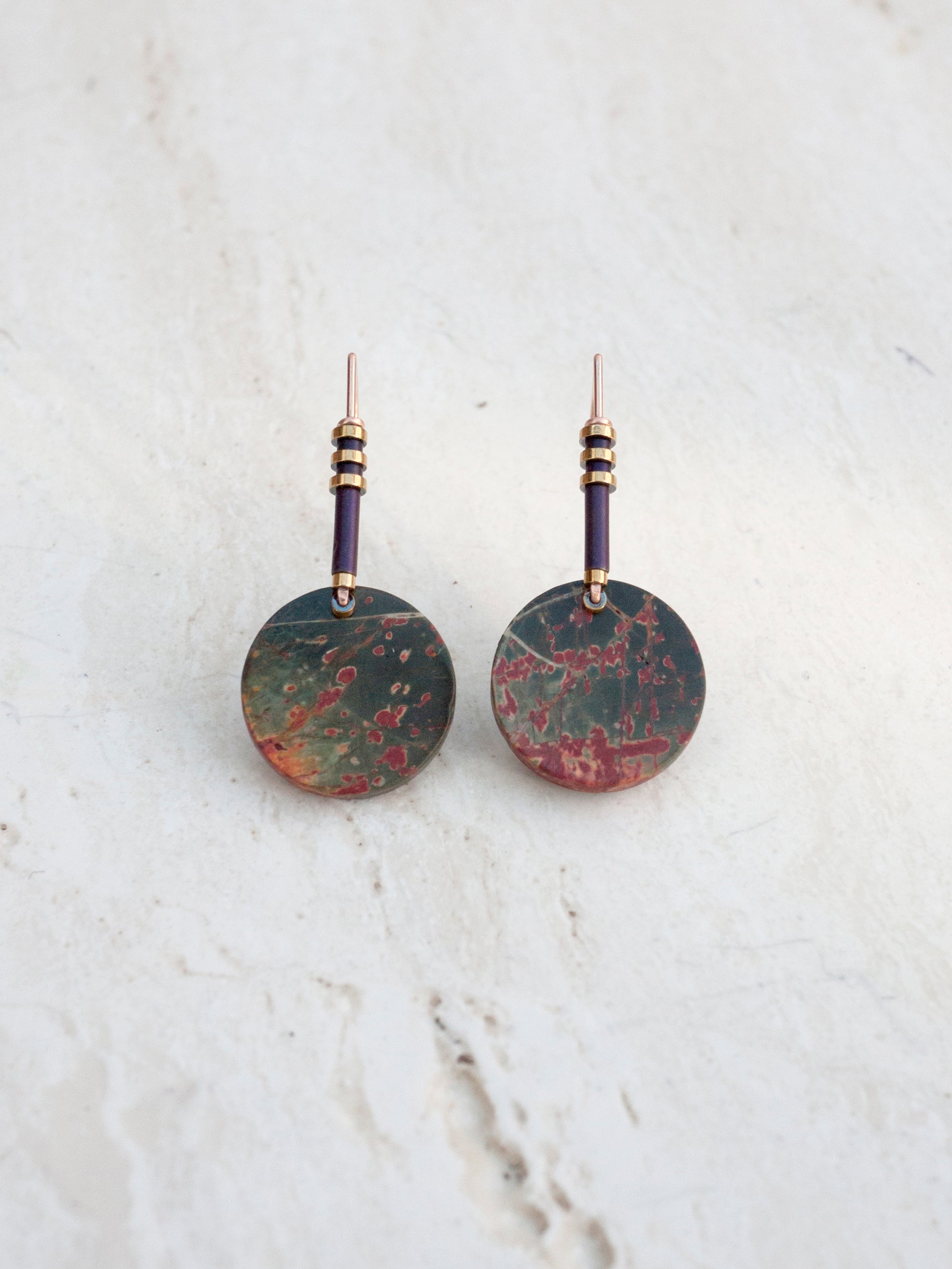 The combination of red creek jasper and rose gold fill wire creates a beautiful, earthy feel for these one-of-a-kind dangle earrings. Gold and purple hematite beads complement the hues in these unique stones. Earrings come with rubber backings.