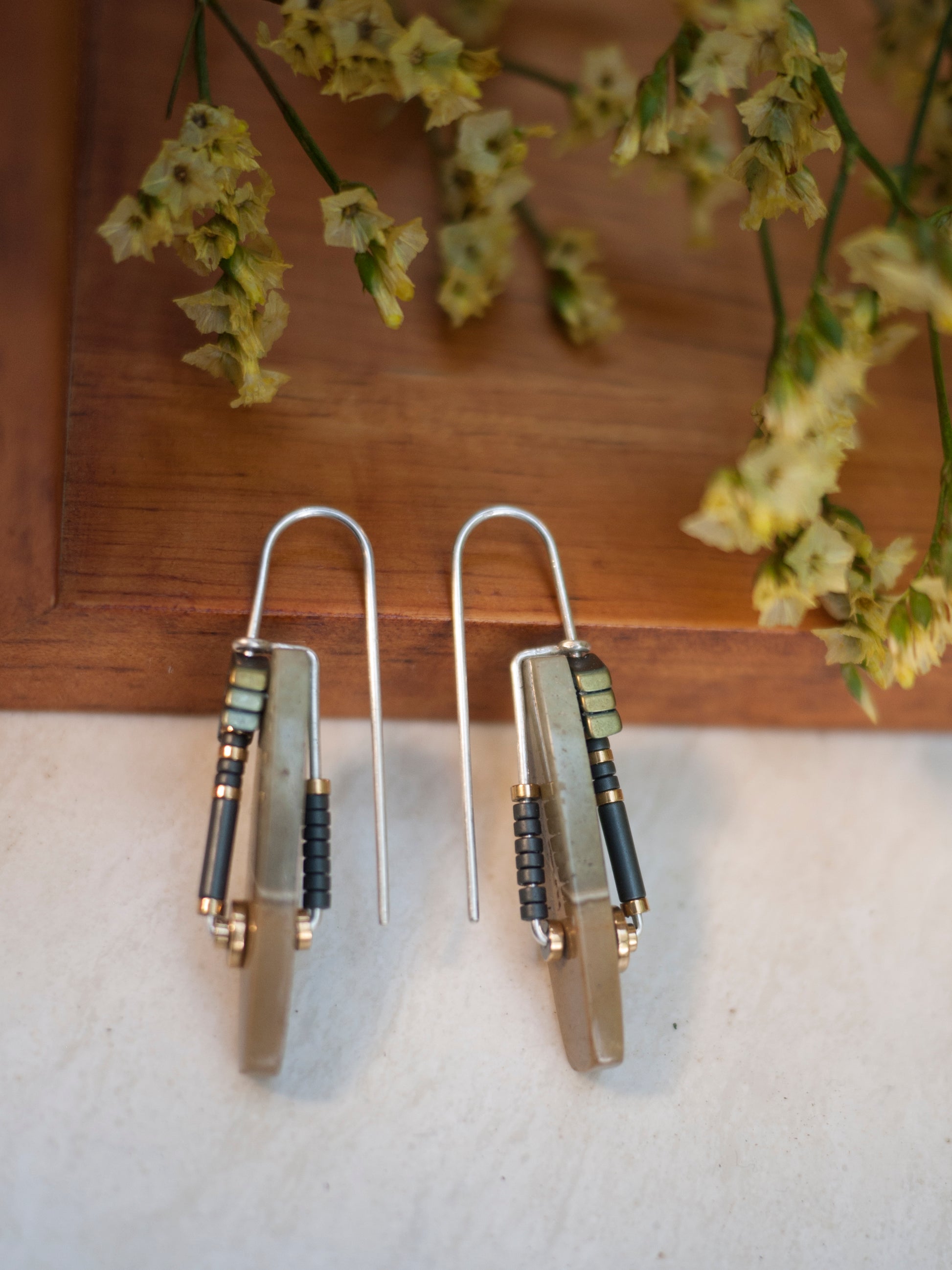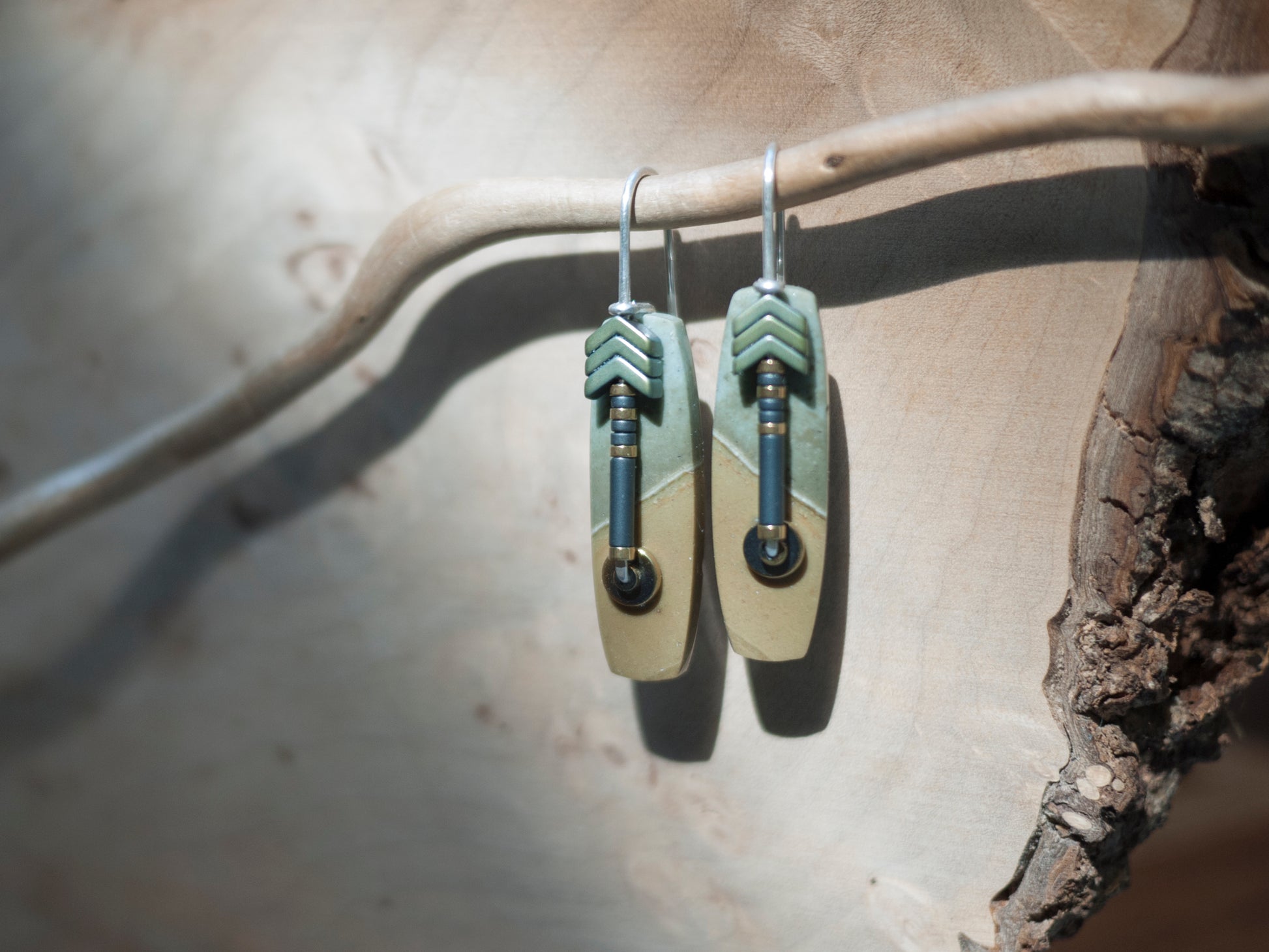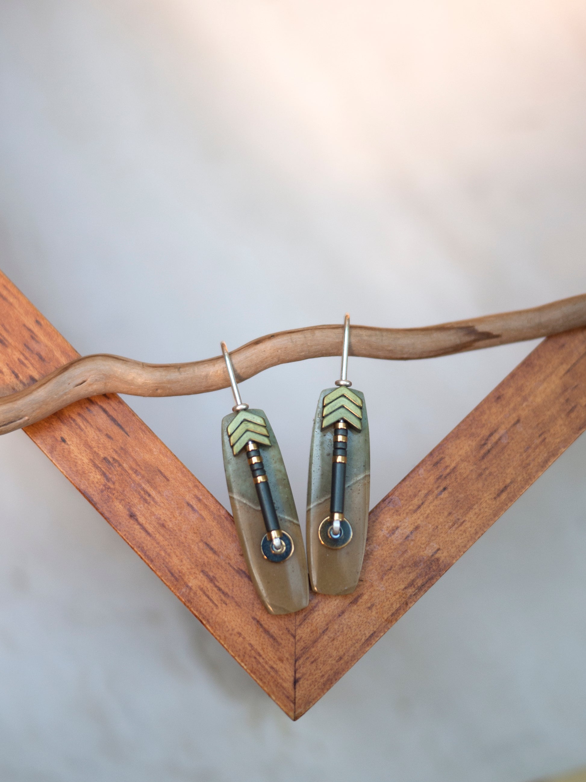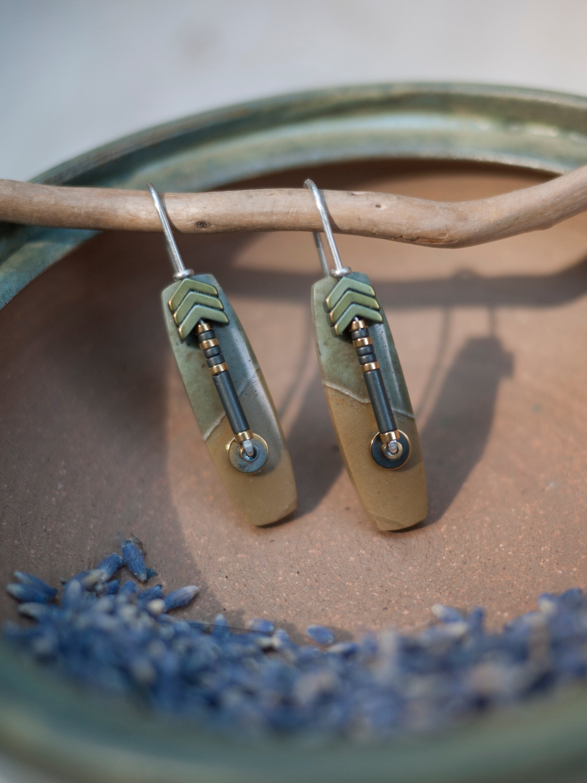These beautiful polychrome jasper stones were hand cut for my designs in a collaboration with a lapidary artist from Indonesia. Solid sterling silver wire creates an arched ear wire. A line of hematite beads accent the front of the stone and add a graphic interest. Earrings come with rubber backings.