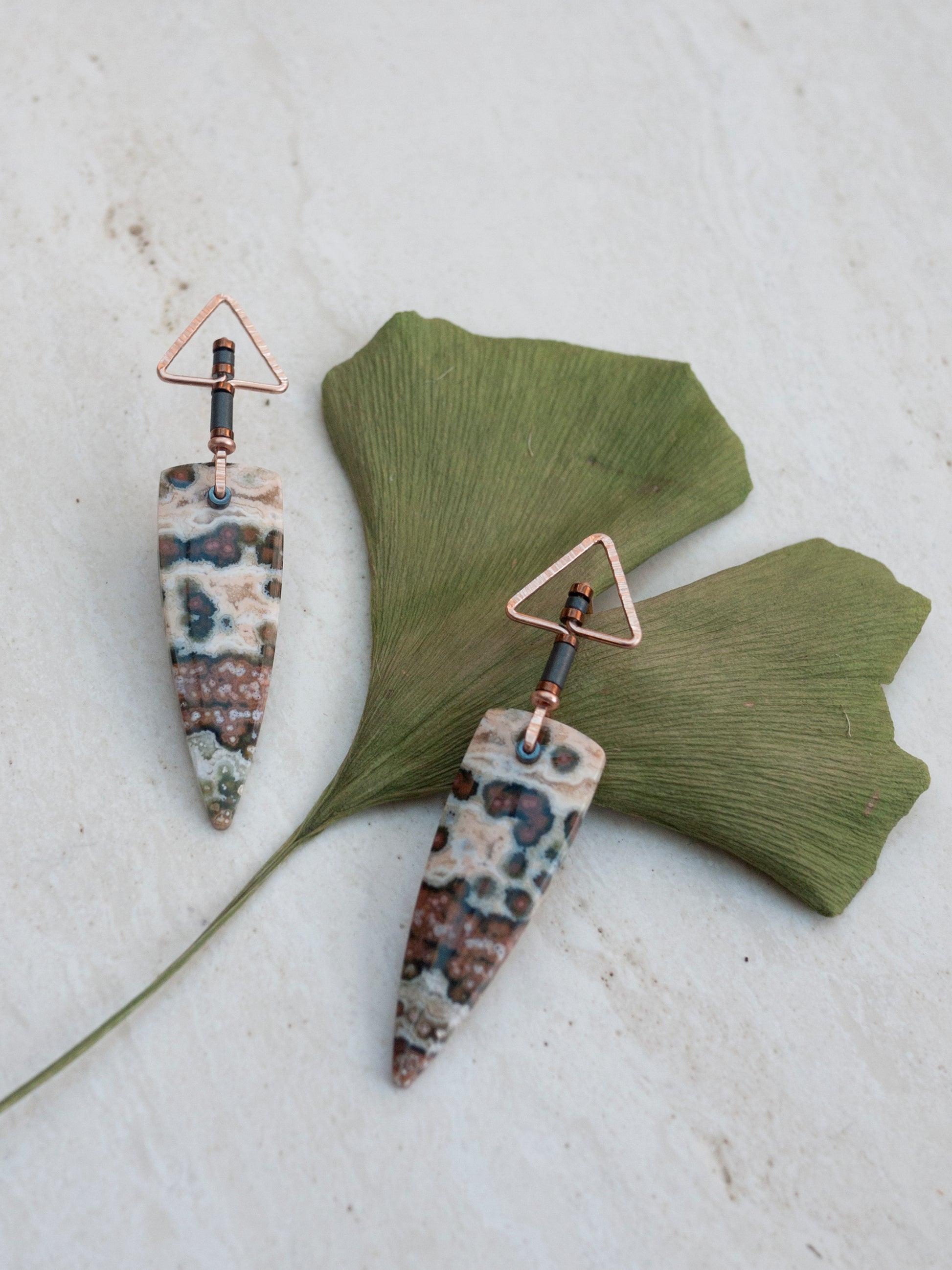 These stunning ocean jasper stones have rich pattern in rust, green and white. The stones hang from rose gold fill wire in these sleek stud earrings. copper and green colored hematite beads create delicate detail and topped with a hammered triangle shape. Earrings come with gold fill pressure fit backings.