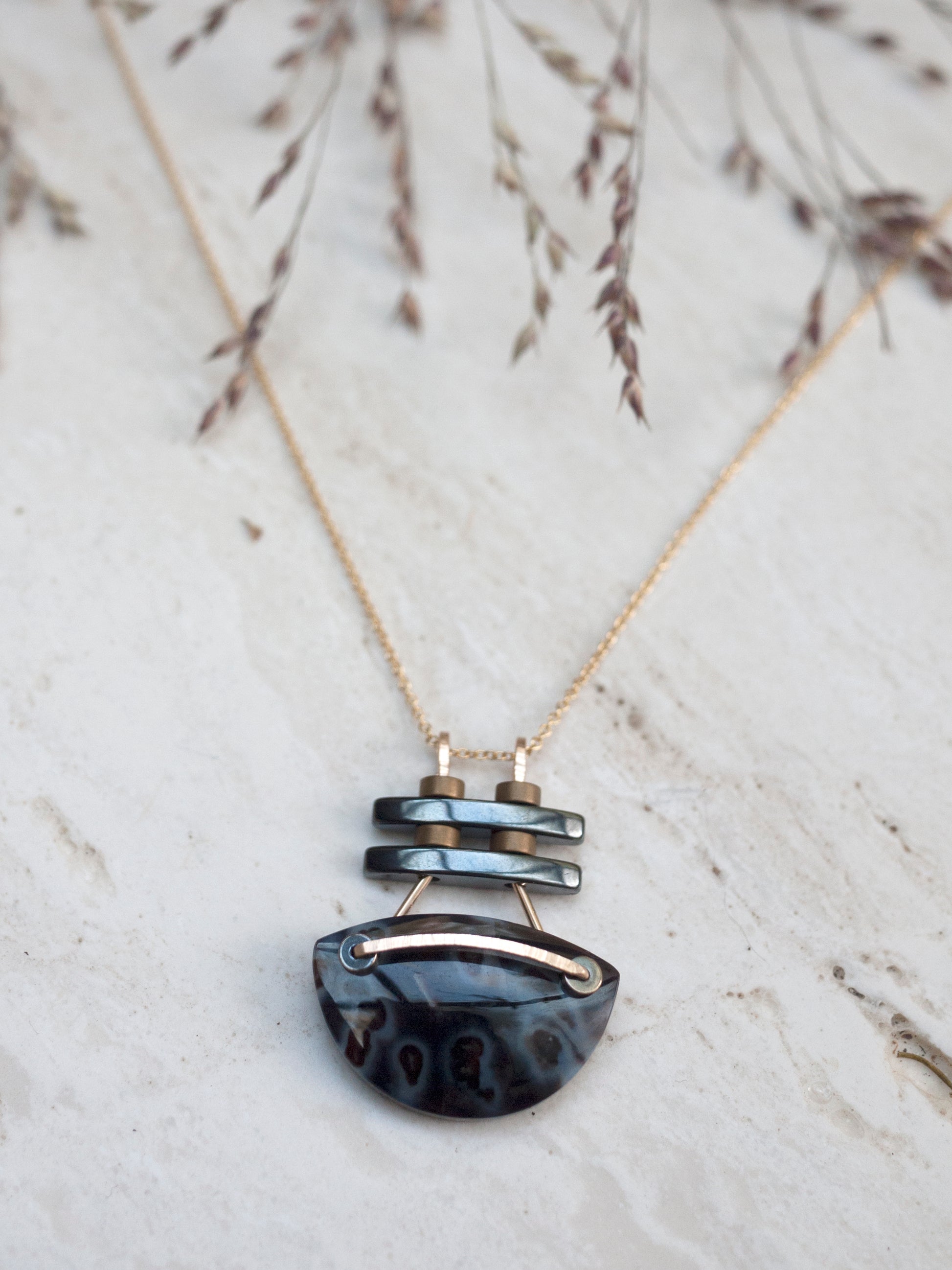A custom cut orb agate bead hangs from hand formed 14k yellow gold filled wire. The wire is hammered to give the pendant a unique texture. The wire is adorned with a matte gold and shiny grey hematite beads.